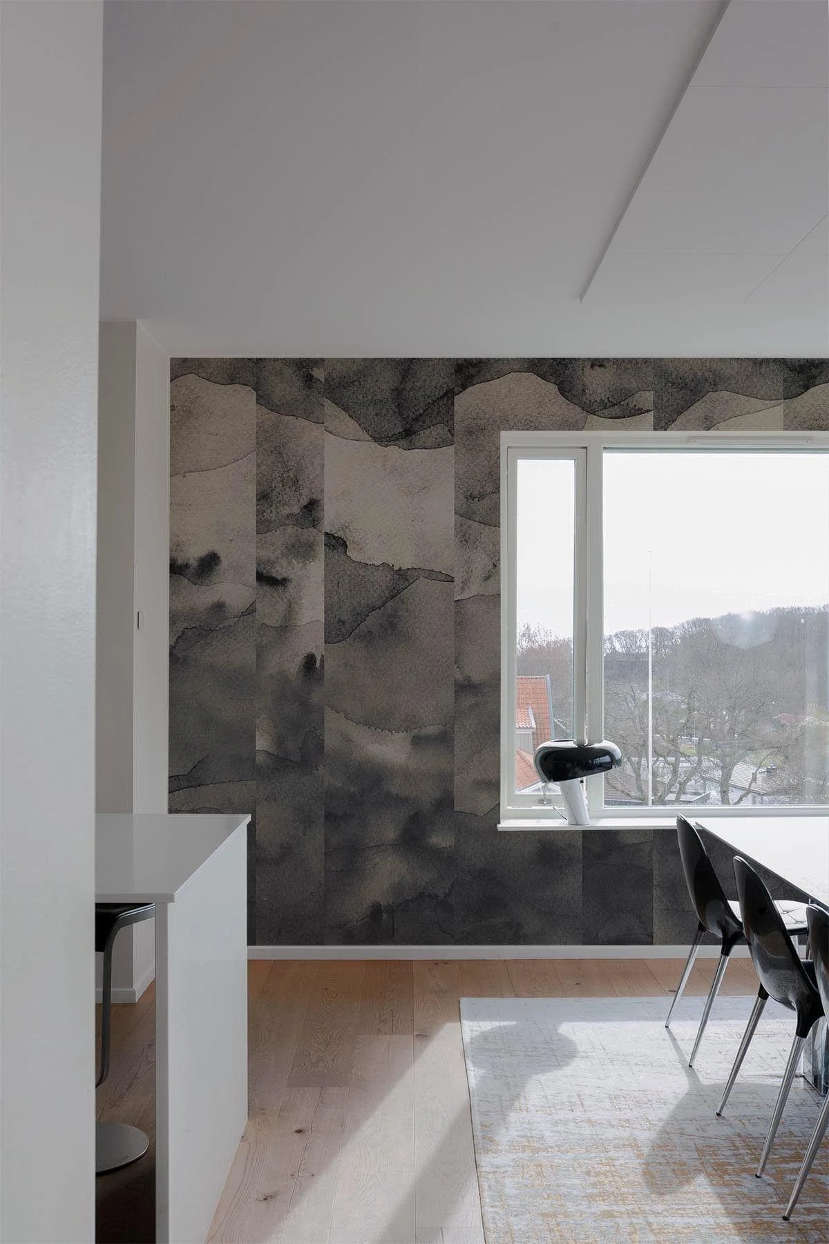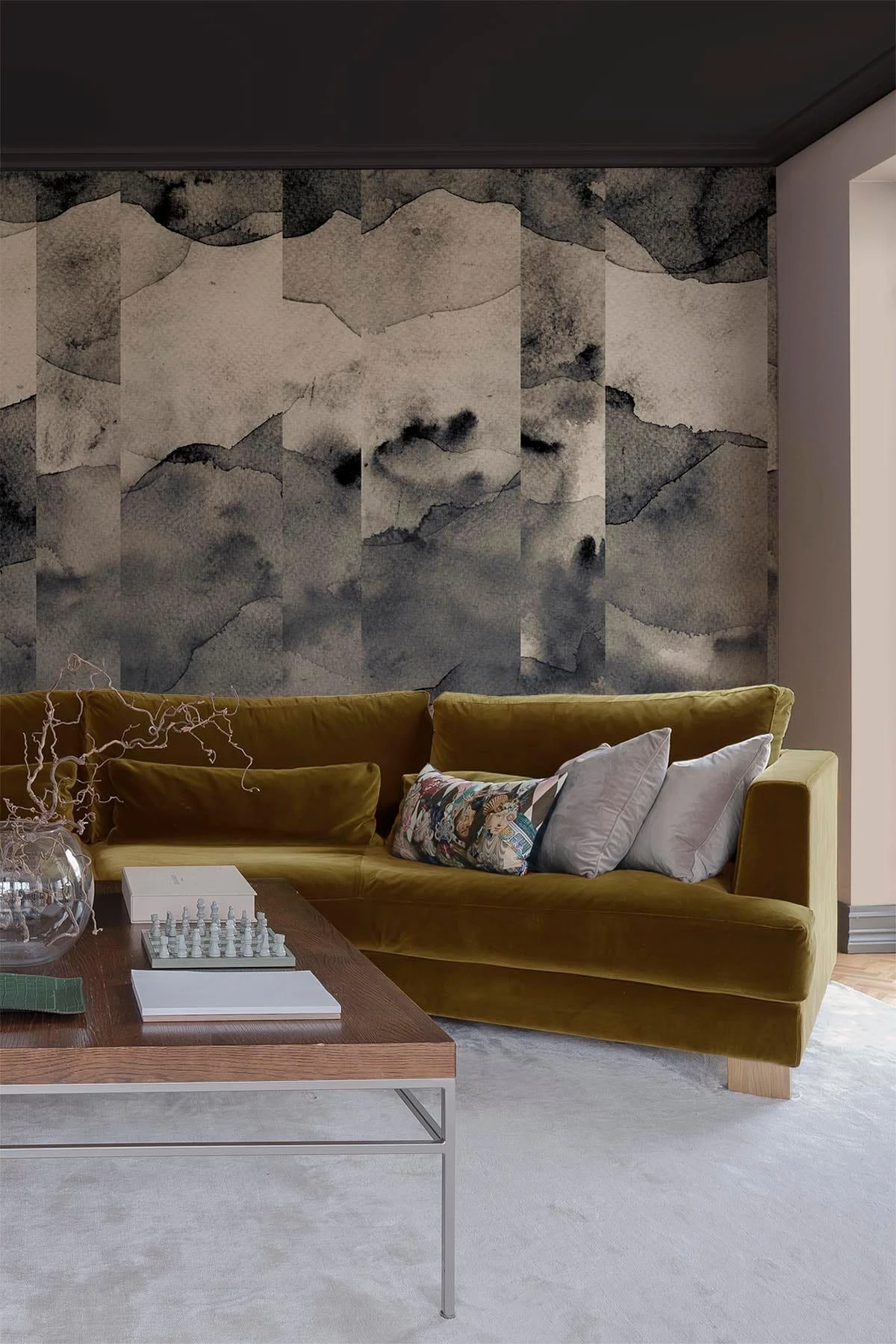 A deconstructed aquarelle painting in shades of grey. This abstract design in grey is the perfect wallpaper for your living room, it creates a warm and embraced feel to your space.