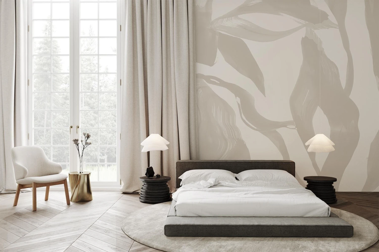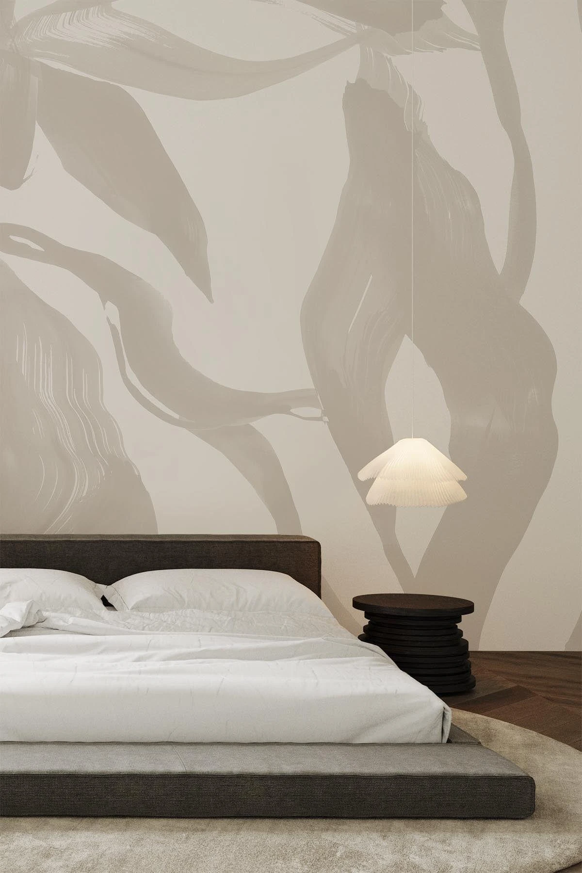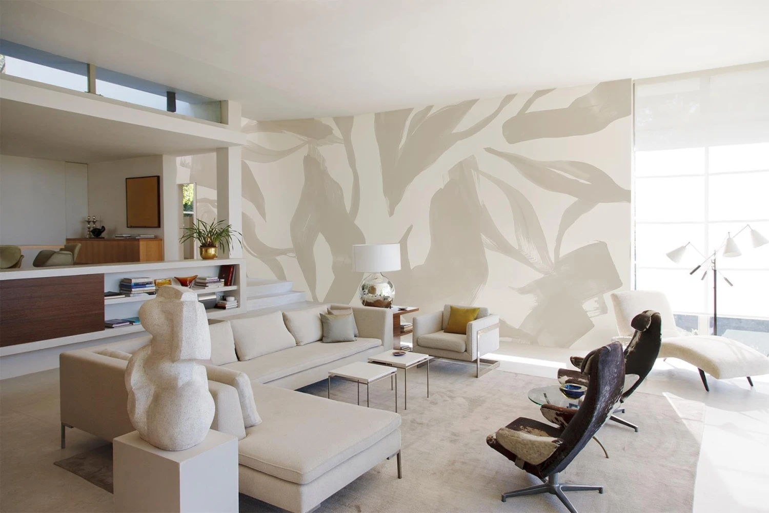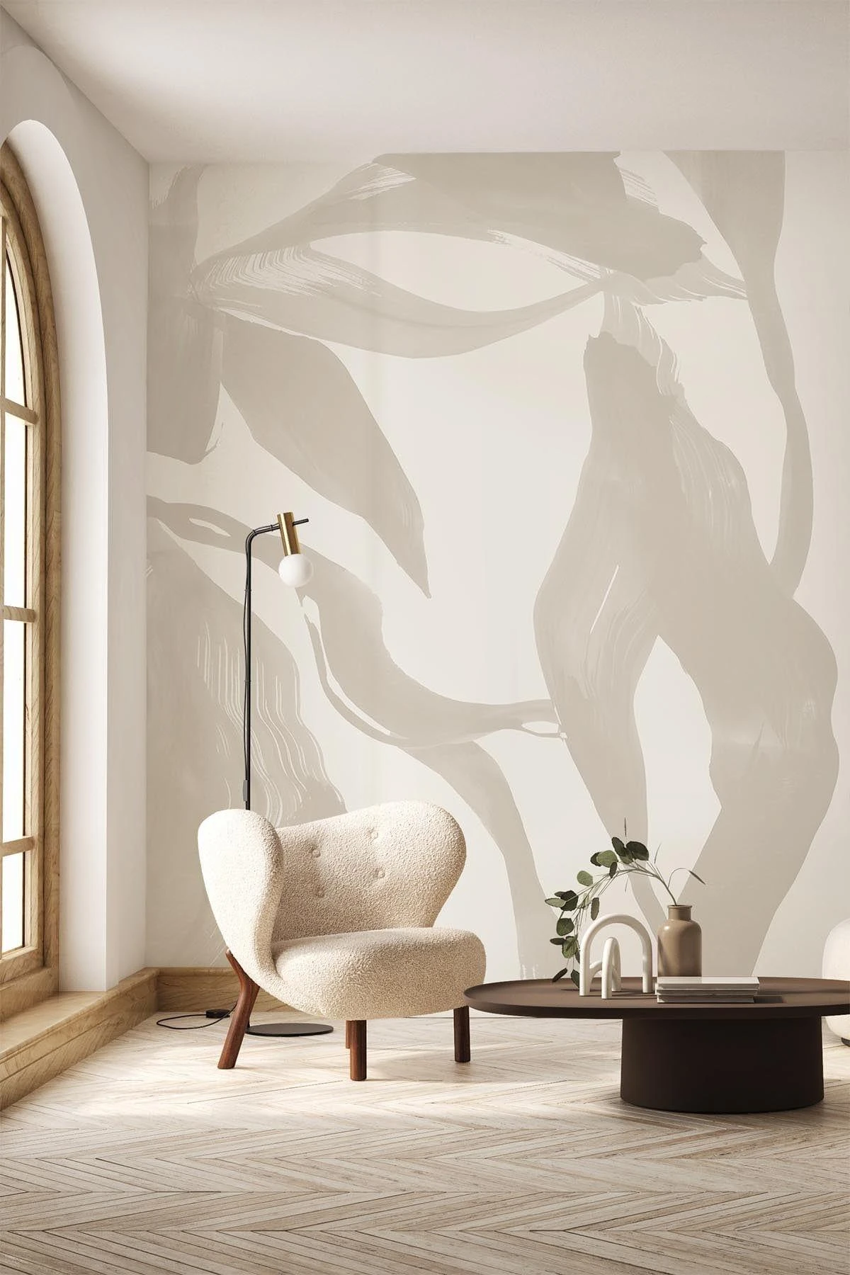A unique and bold design made of wide rough brushstrokes. The big scaled beige pattern gets its fluidity from the soft blended ink combined with its roughness in scale. A contemporary design that combines inspiration from nature together with its twist of abstract artistry. It creates a perfect accent wall in your living room.