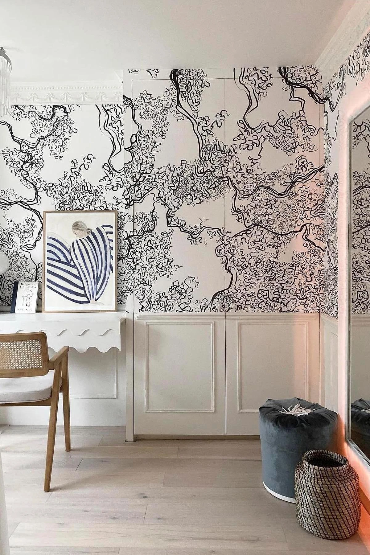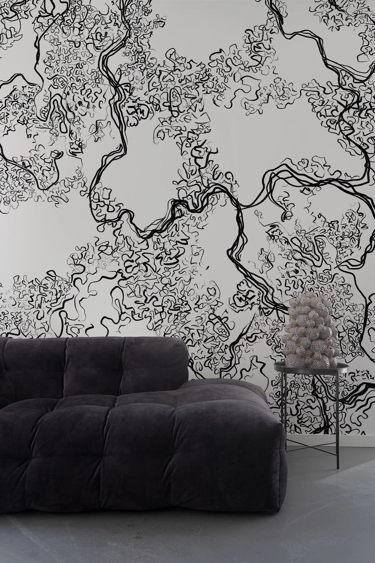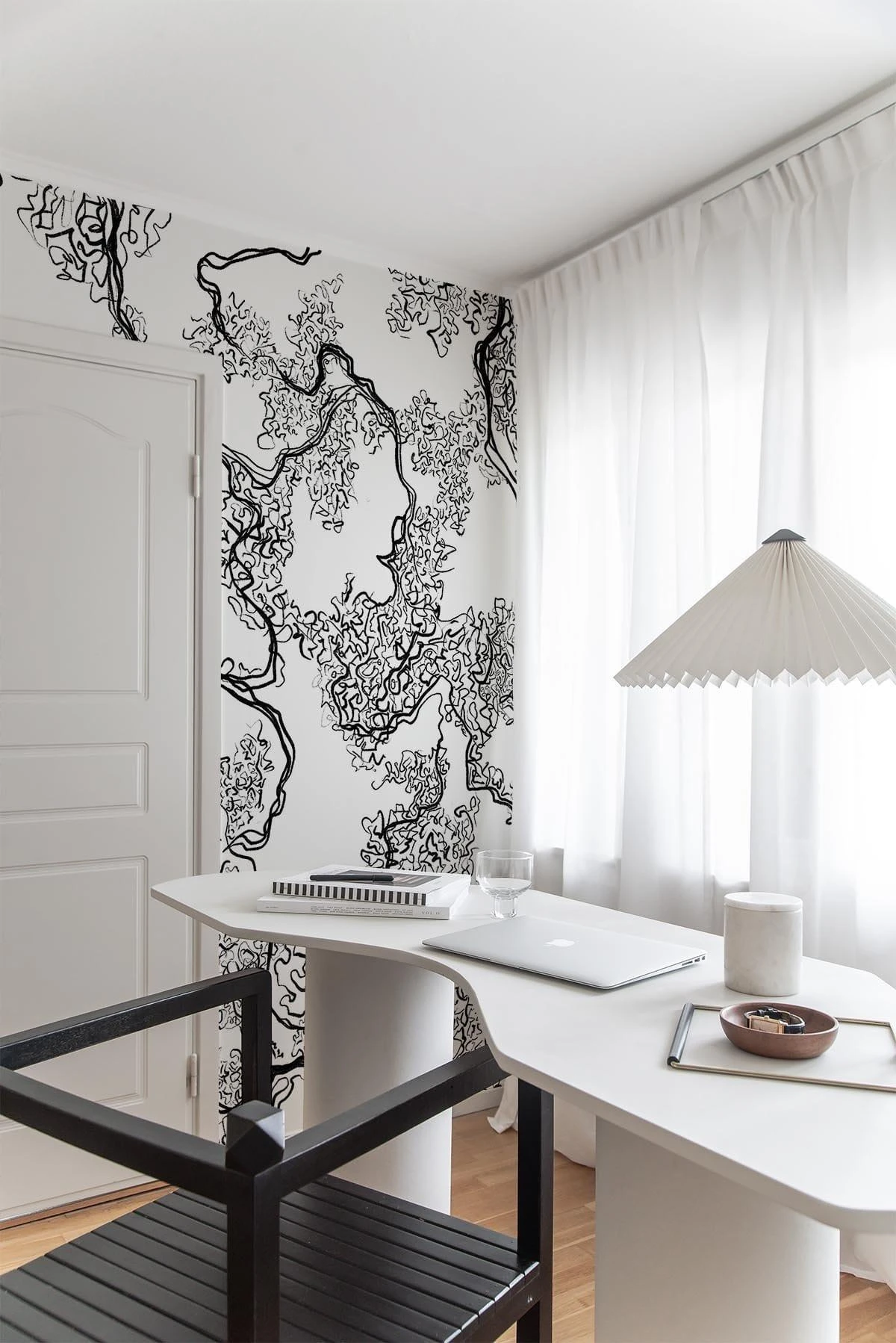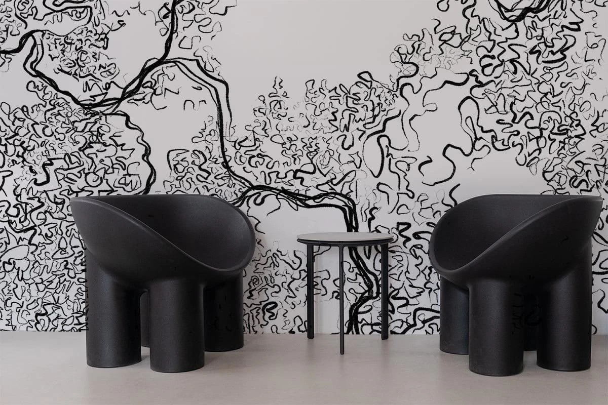 The hand drawn line work gives this black wall mural an abstract yet organic look. Create a statement with the sharp black and white colors or a minimalistic look using them in panellings.