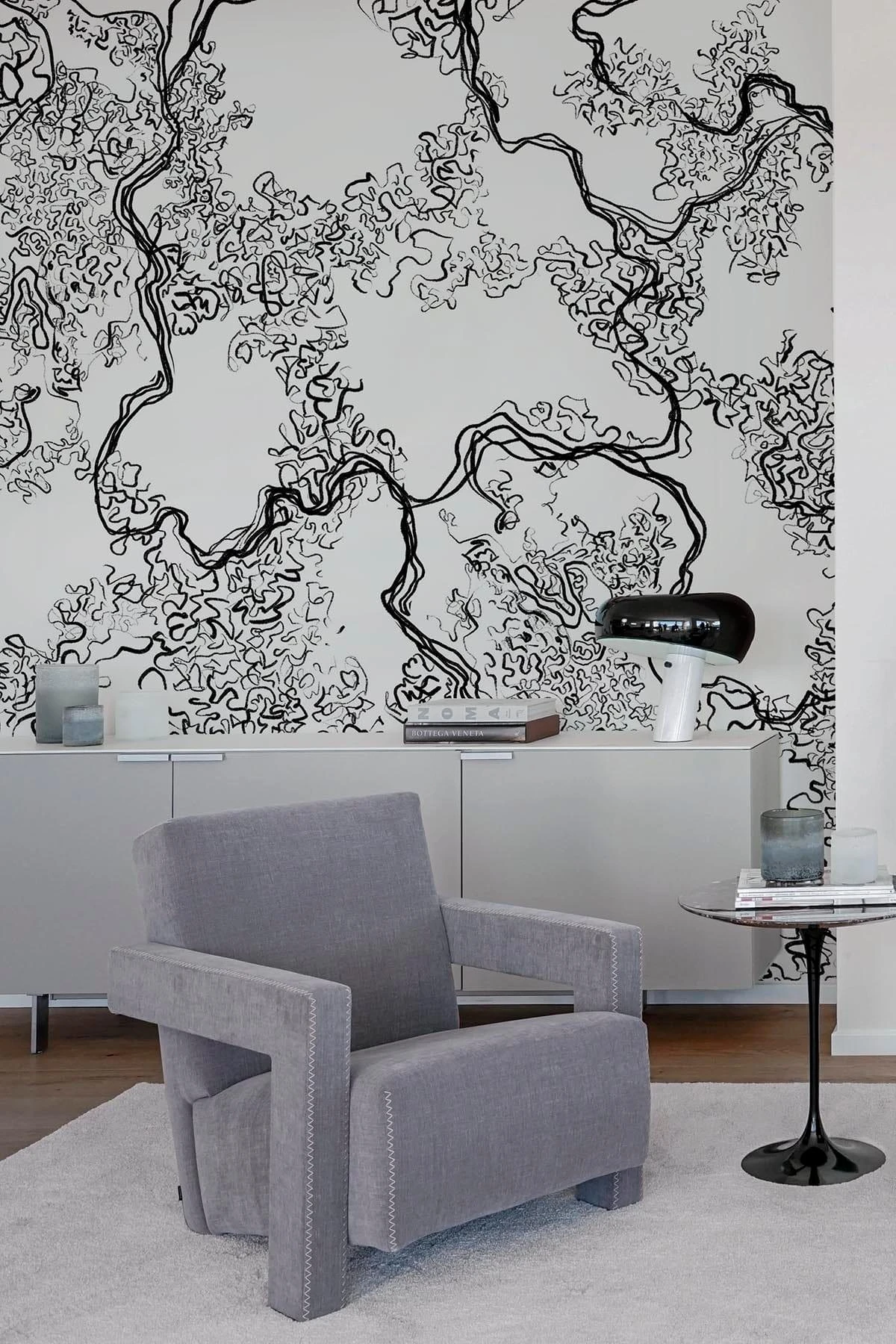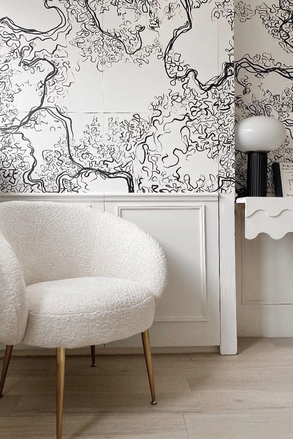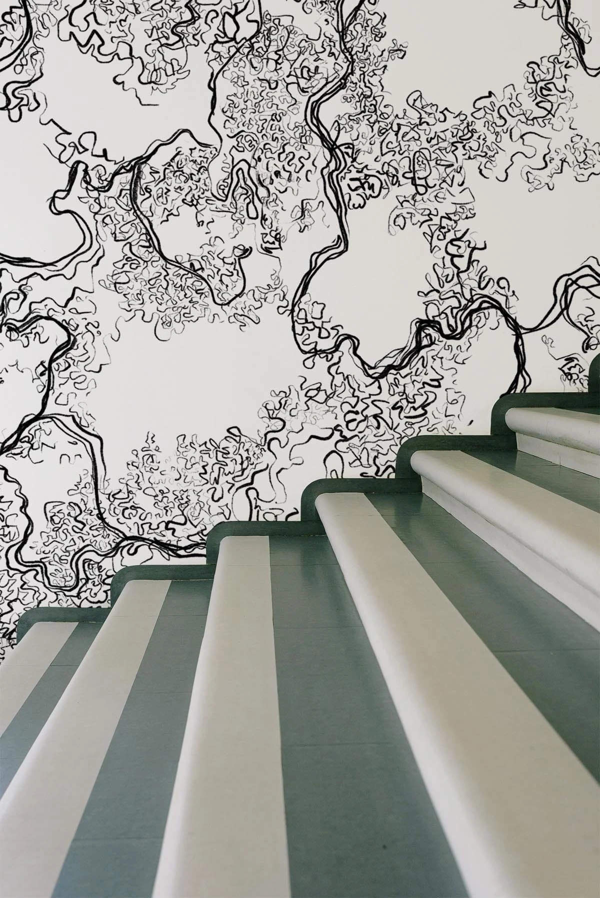 The hand drawn line work gives this black wall mural an abstract yet organic look. Create a statement with the sharp black and white colors or a minimalistic look using them in panellings.