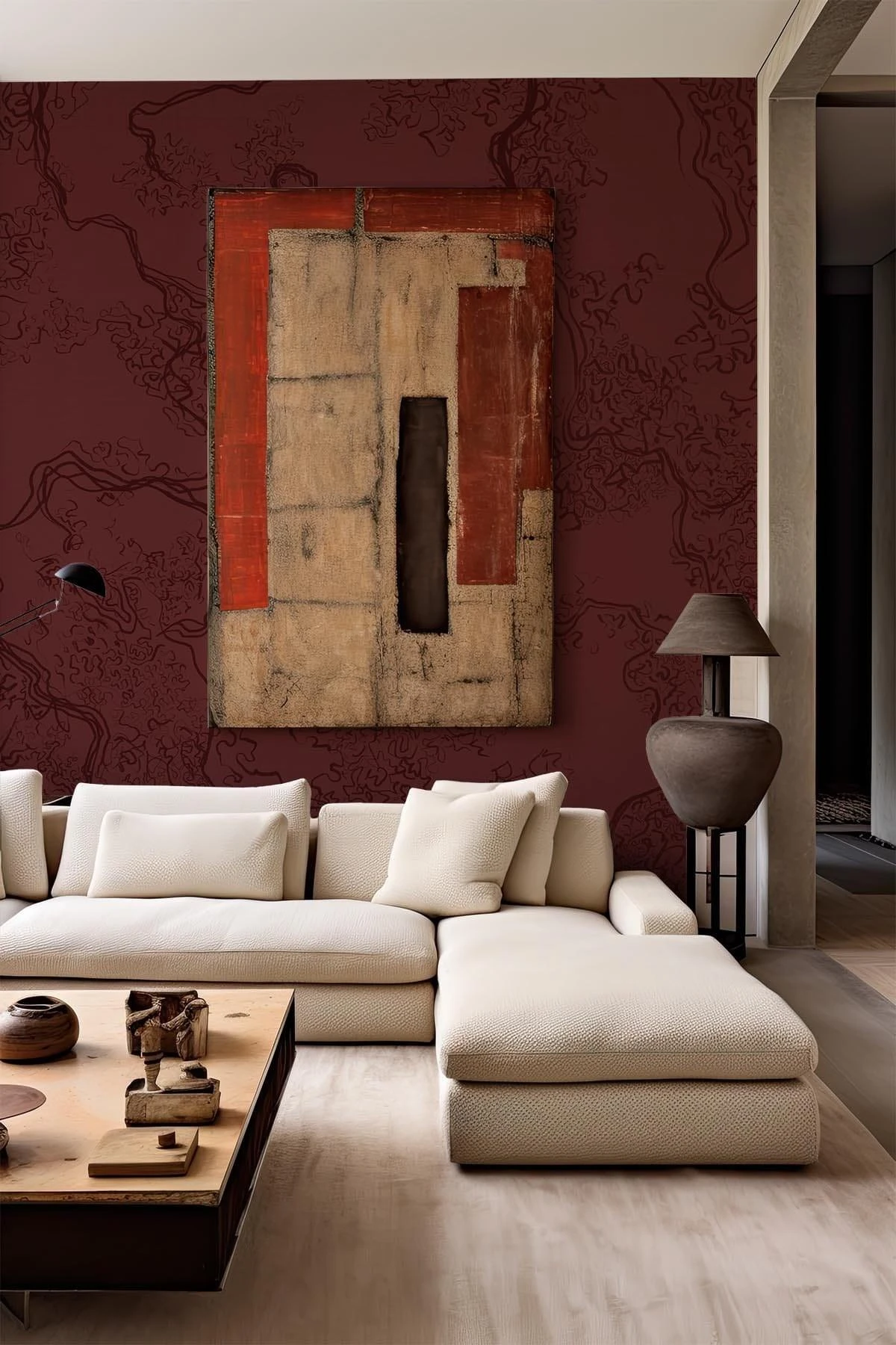 With the hand-drawn lines and the abstract design, this wall mural intense red burgundy color gains an artistic depth and movement. It creates a visual effect that is both vibrant and dynamic, making it a fantastic accent color that adds a modern touch to your space. The intense red shapes in Abstract Sketch wall mural is perfect for those looking to create an inviting and passionate atmosphere in their home, where every detail tells a story and captures the eye subtly. Let the intense burgundy shade be the heart of your room and create an interior that is memorable and inspiring for everyone who enters.