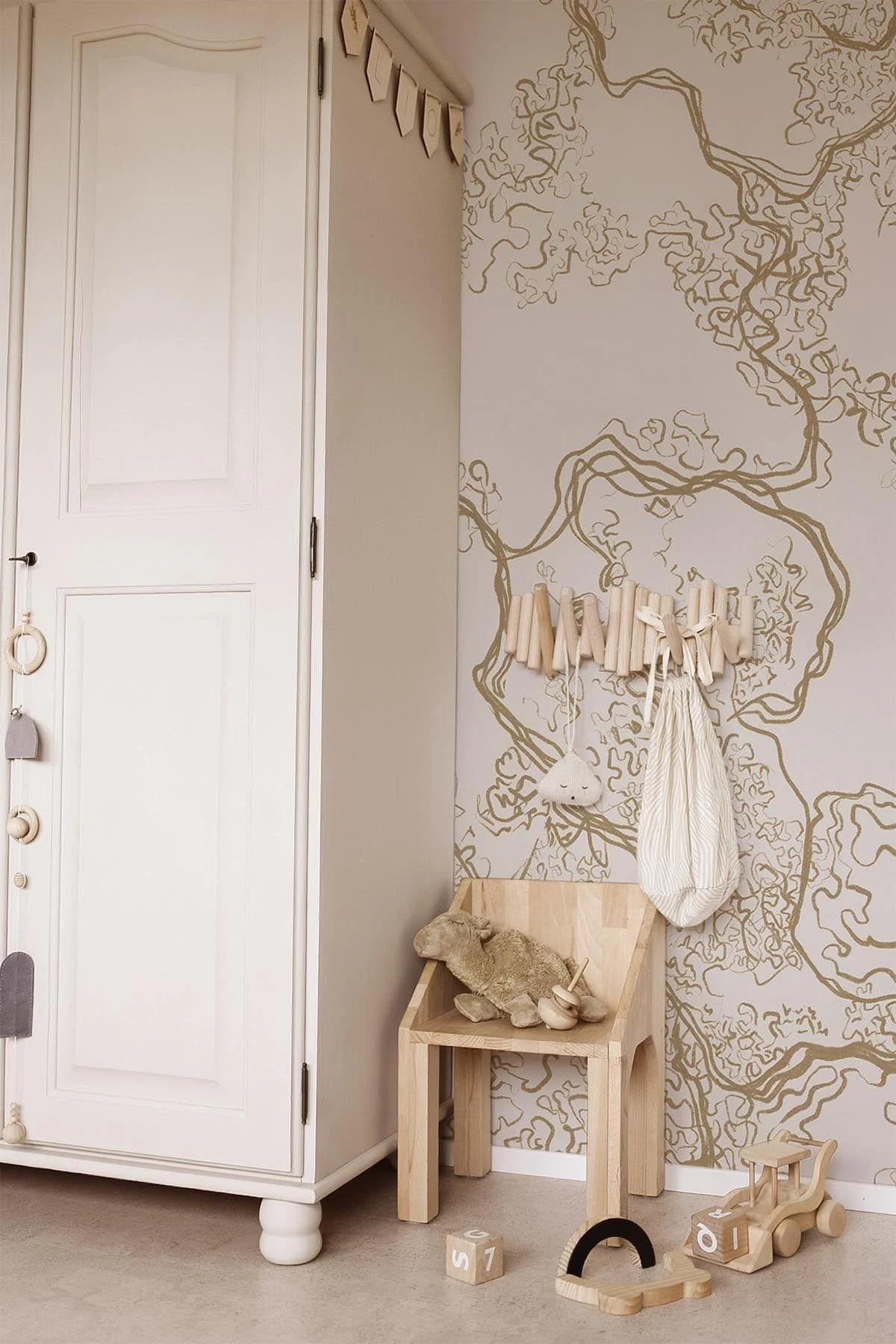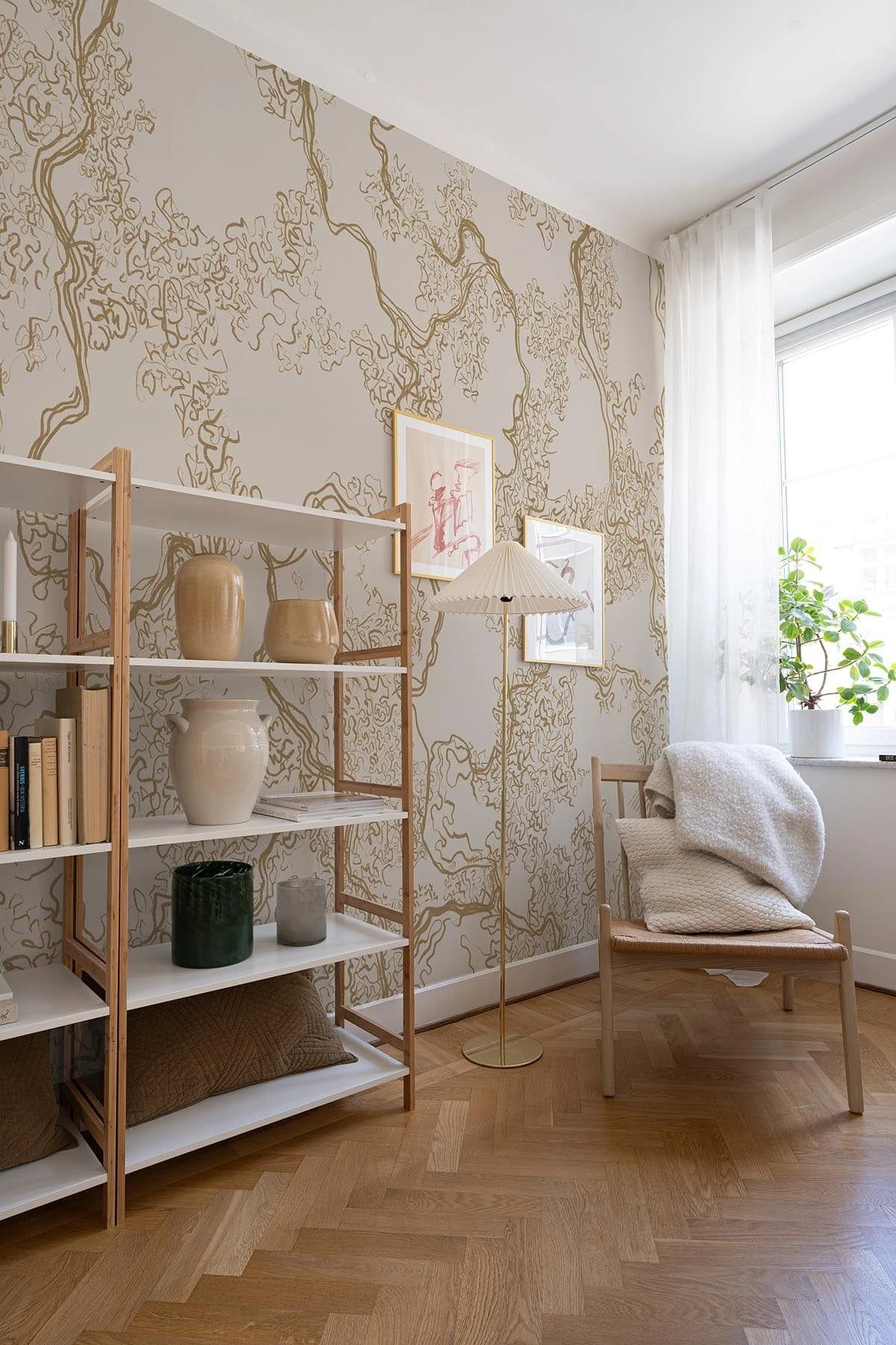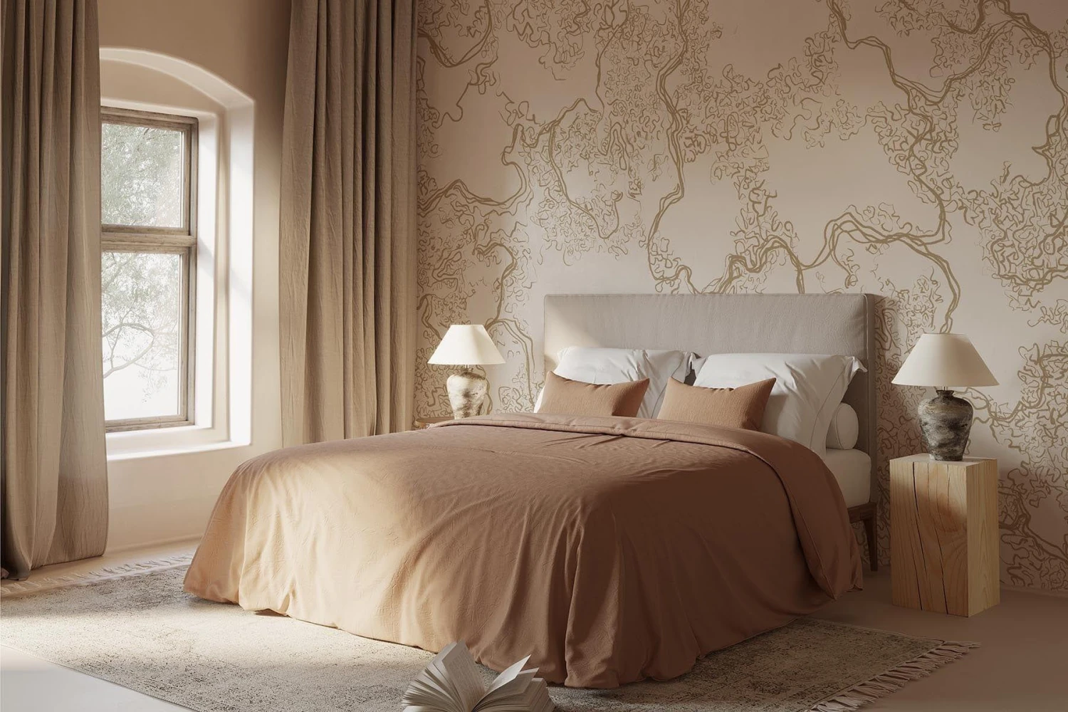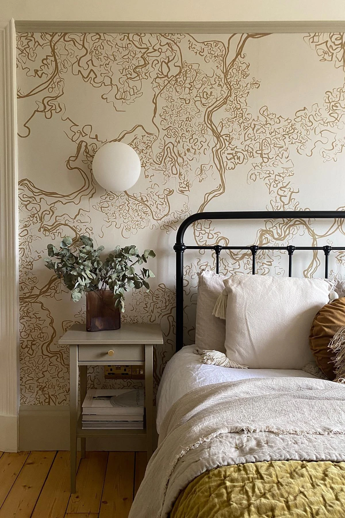 The hand drawn line work gives this golden wall mural an abstract yet organic look. Create a minimalistic look with the ochre tones.
