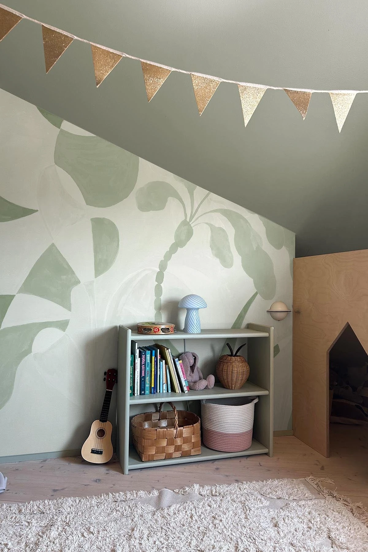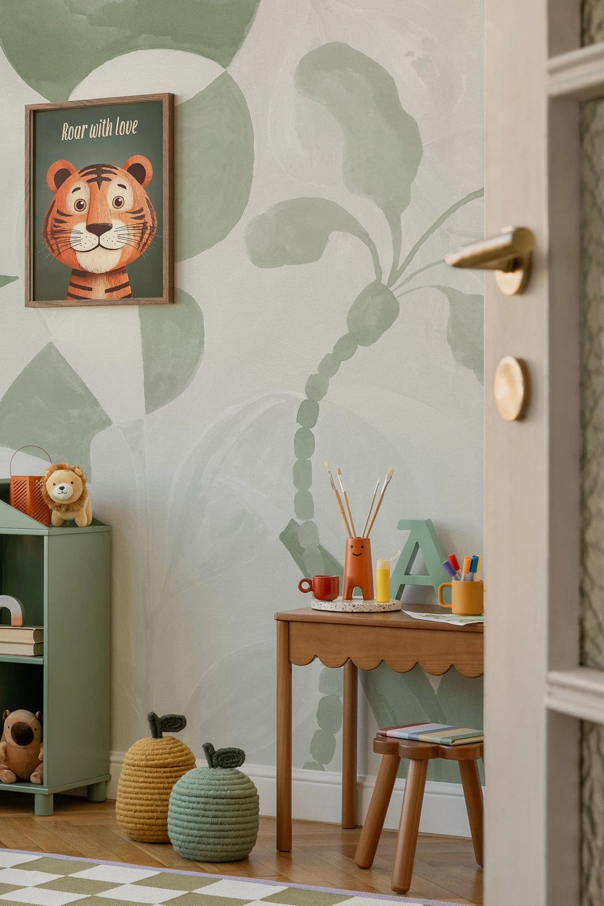 Abstract Utopia Pastel Green blends dreamy green tones with hand-drawn palm details and abstract organic shapes. Painted in gouache, the soft strokes and gentle rhythm create a mural that’s fresh, modern, and full of quiet wonder. Designed to inspire calm imagination, it’s ideal for nurturing creativity in a beautifully understated way.