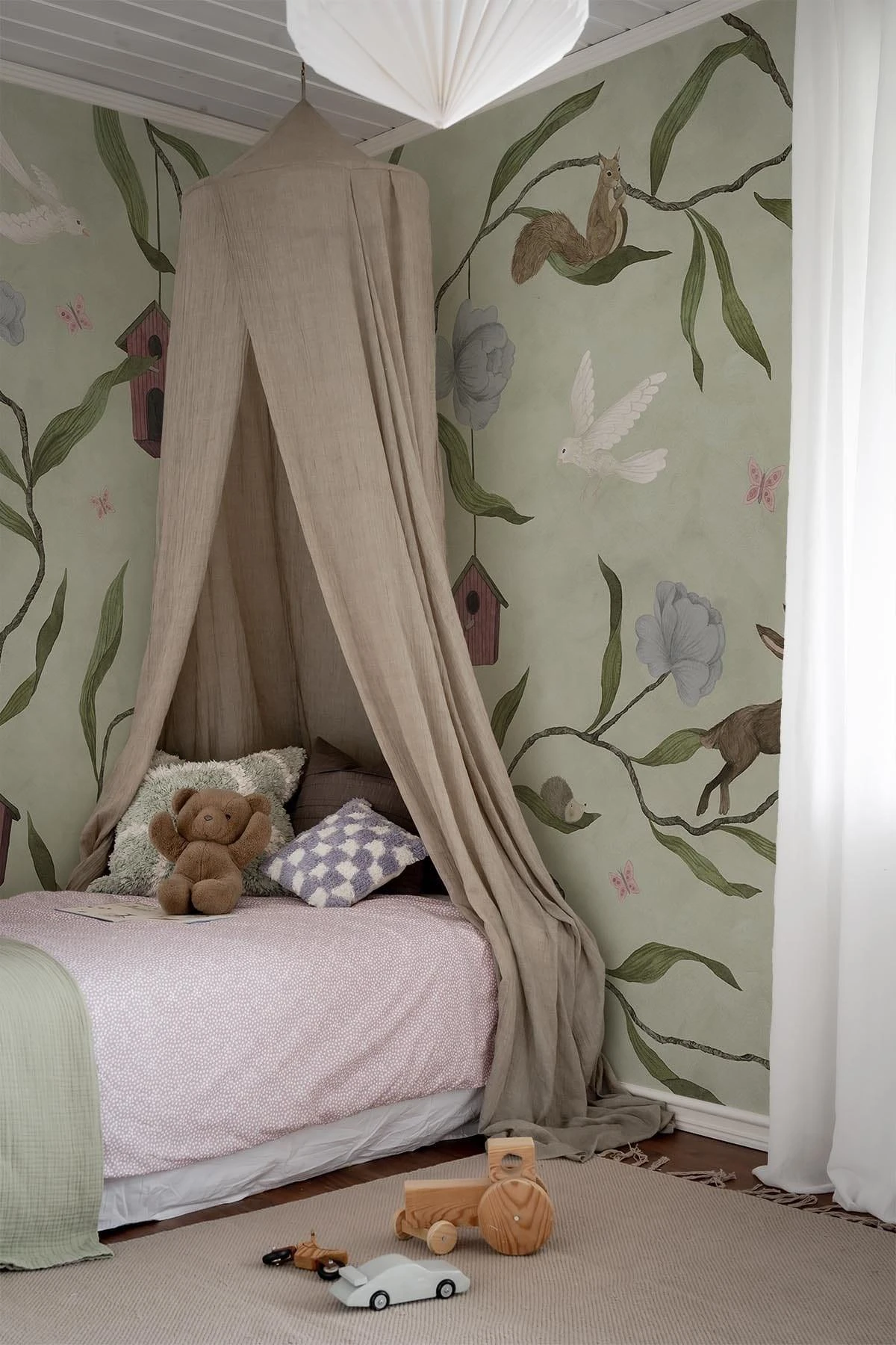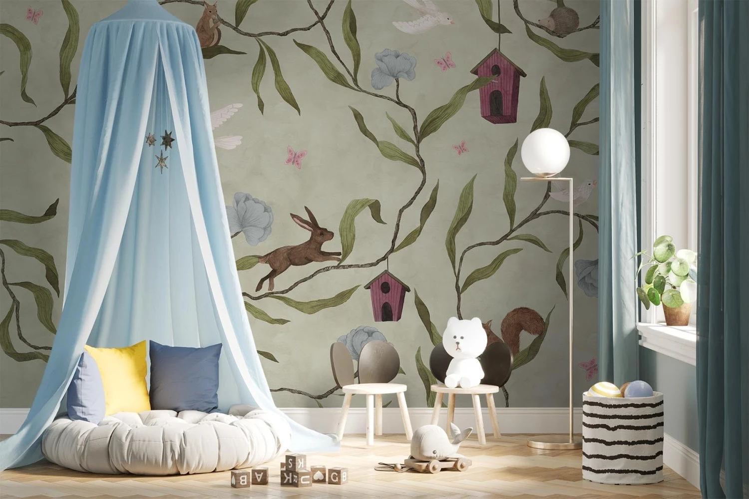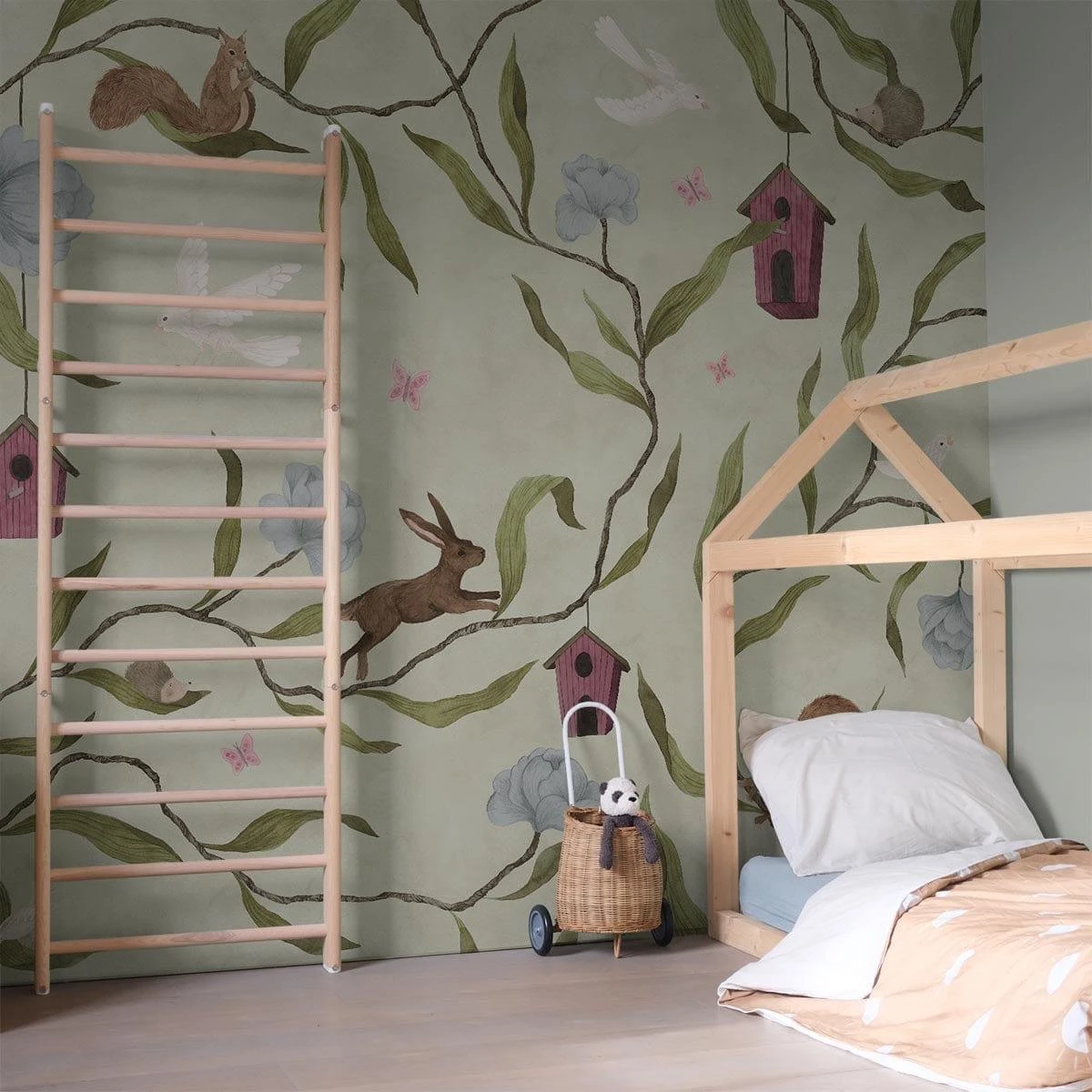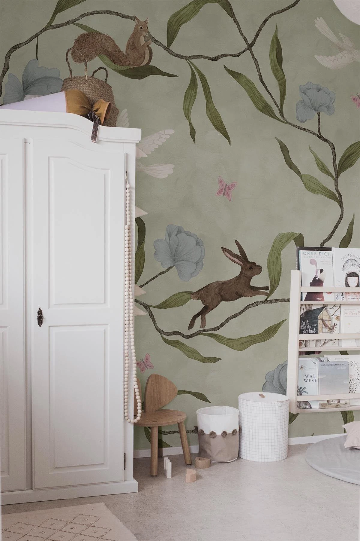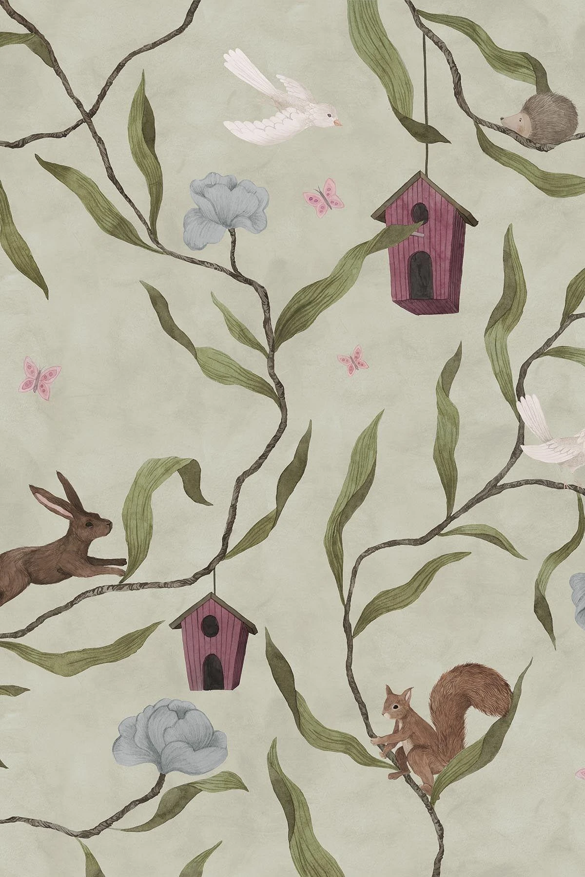 The simplicity of a climbing flower branch with the playfulness of animals captured in a green wallpaper. Hand painted details from the flower petals, the bark to the animals such as rabbits and squirrels that are climbing up the branches. A big scaled animal floral wall mural with a muted color scheme, that captures your interest as soon as you step into the kids room. Is anyone living in the bird’s nest?