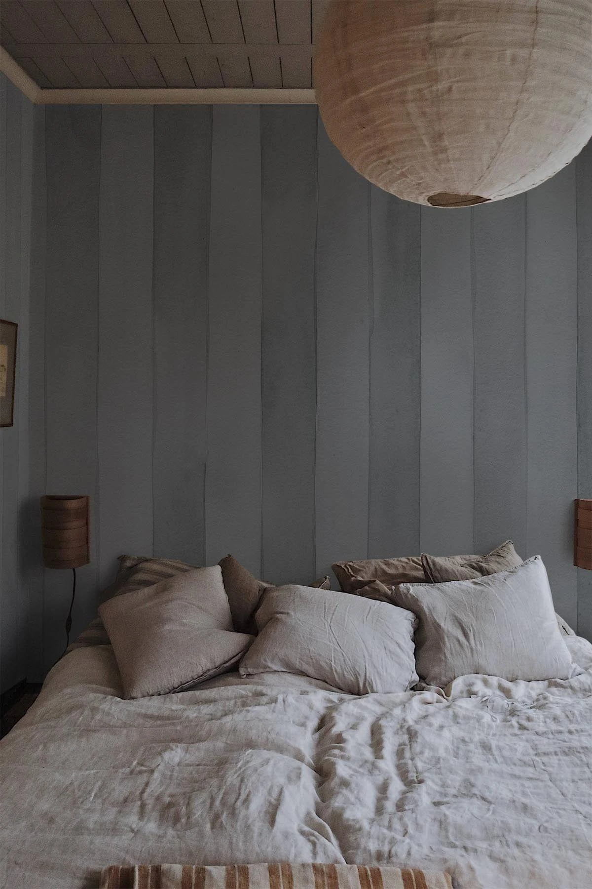 The hand-painted Aquarelle stripes add an artistic touch, bringing a subtle play of colors and textures to your walls. The varying shades of dove blue blends peacefully, like the calm ocean waves and endless skies, creating an open and airy atmosphere.