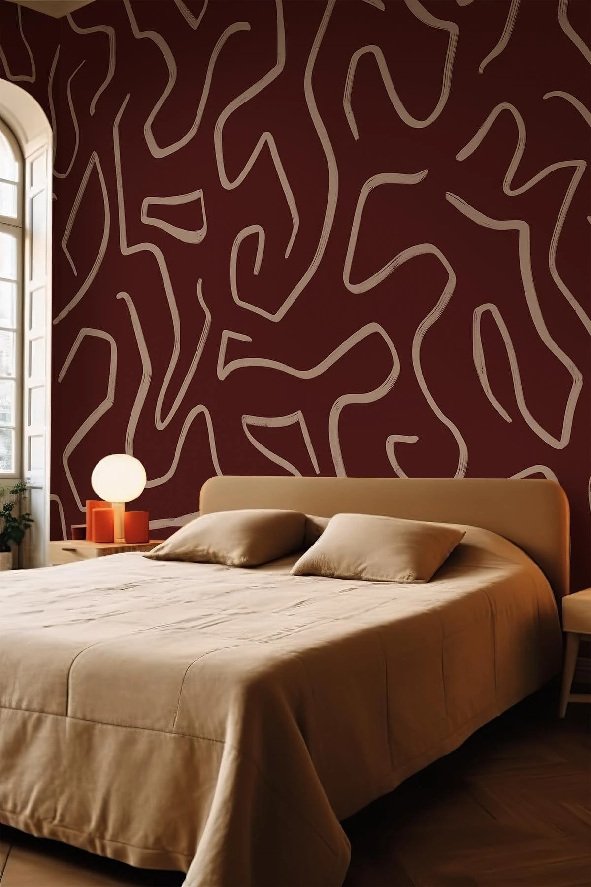 The burgundy of Artistic Lines is an captivating shade that adds warmth and elegance to your interior. This design, crafted with hand-painted brushstrokes, imparts a sense of movement and texture to your room. The hand-painted patterns and the warm shade of burgundy create a cozy and sophisticated atmosphere, making it perfect for the bedroom or living room area.