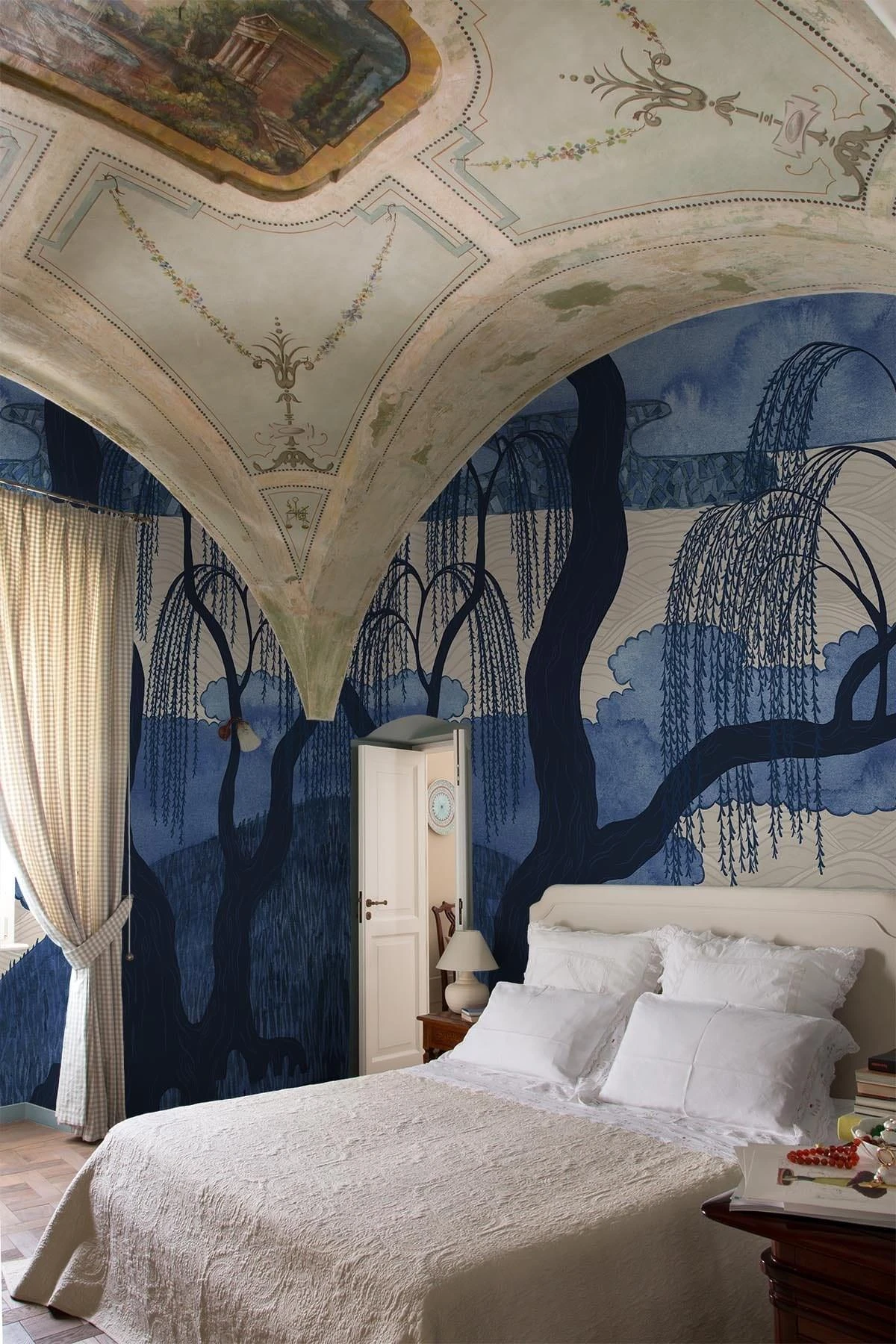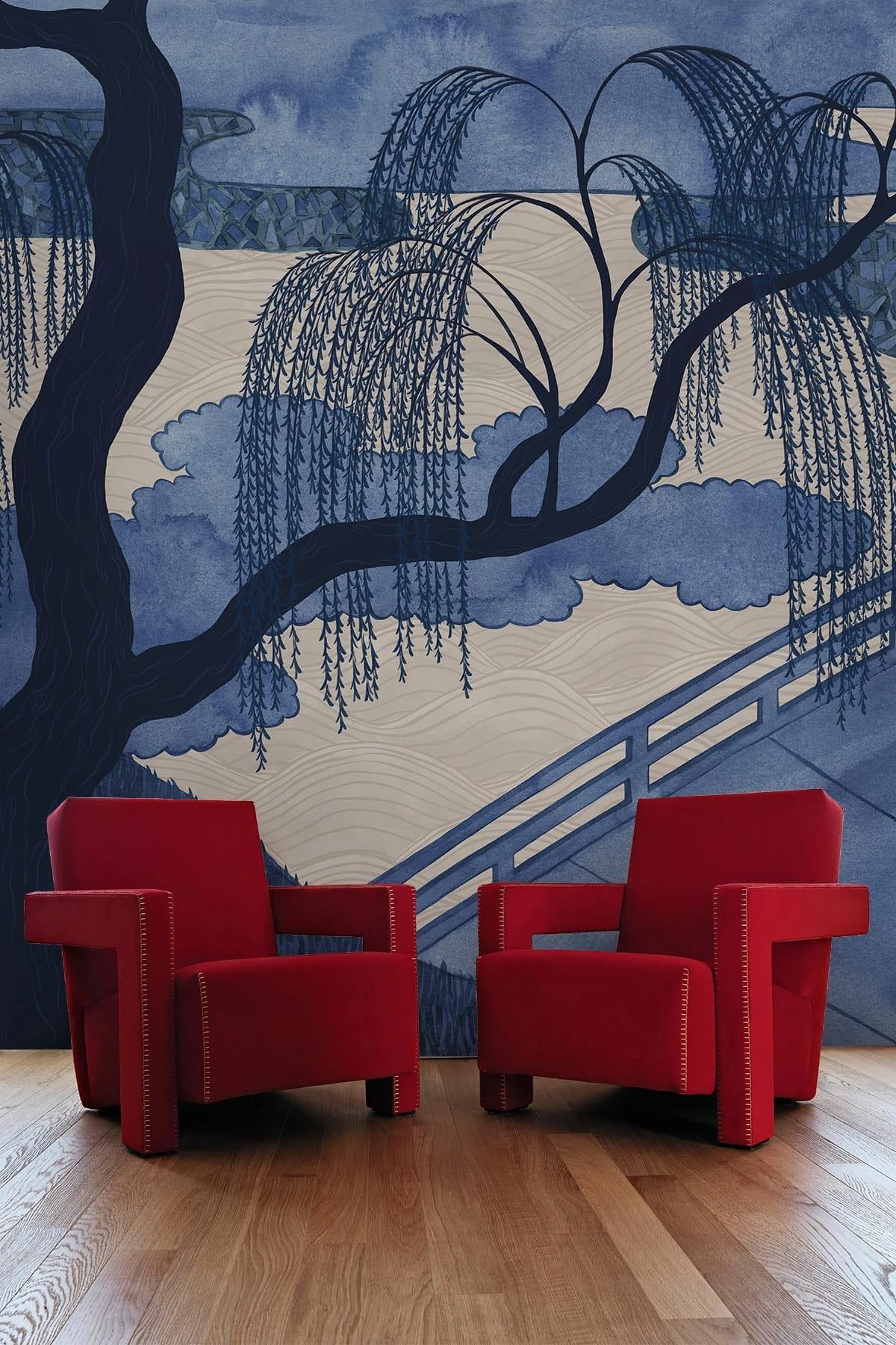 A unique landscape featuring hanging trees and a river winding under the bridge in the golden hour. Inspiration is taken from traditional Asian Art dated back to the Edo period with its ink drawing. This wall mural draws inspiration from classic Asian motifs and the iconic blue porcelain, creating a powerful connection to Asian heritage. The deep blue hues contrast beautifully with vibrant red elements, giving your room an energetic atmosphere. Asian Garden in blue is perfect for those who want their interior to make a strong memorable statement.