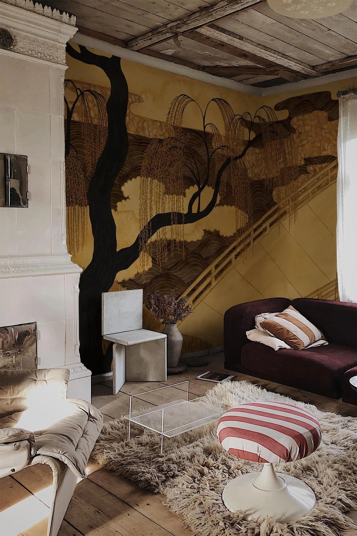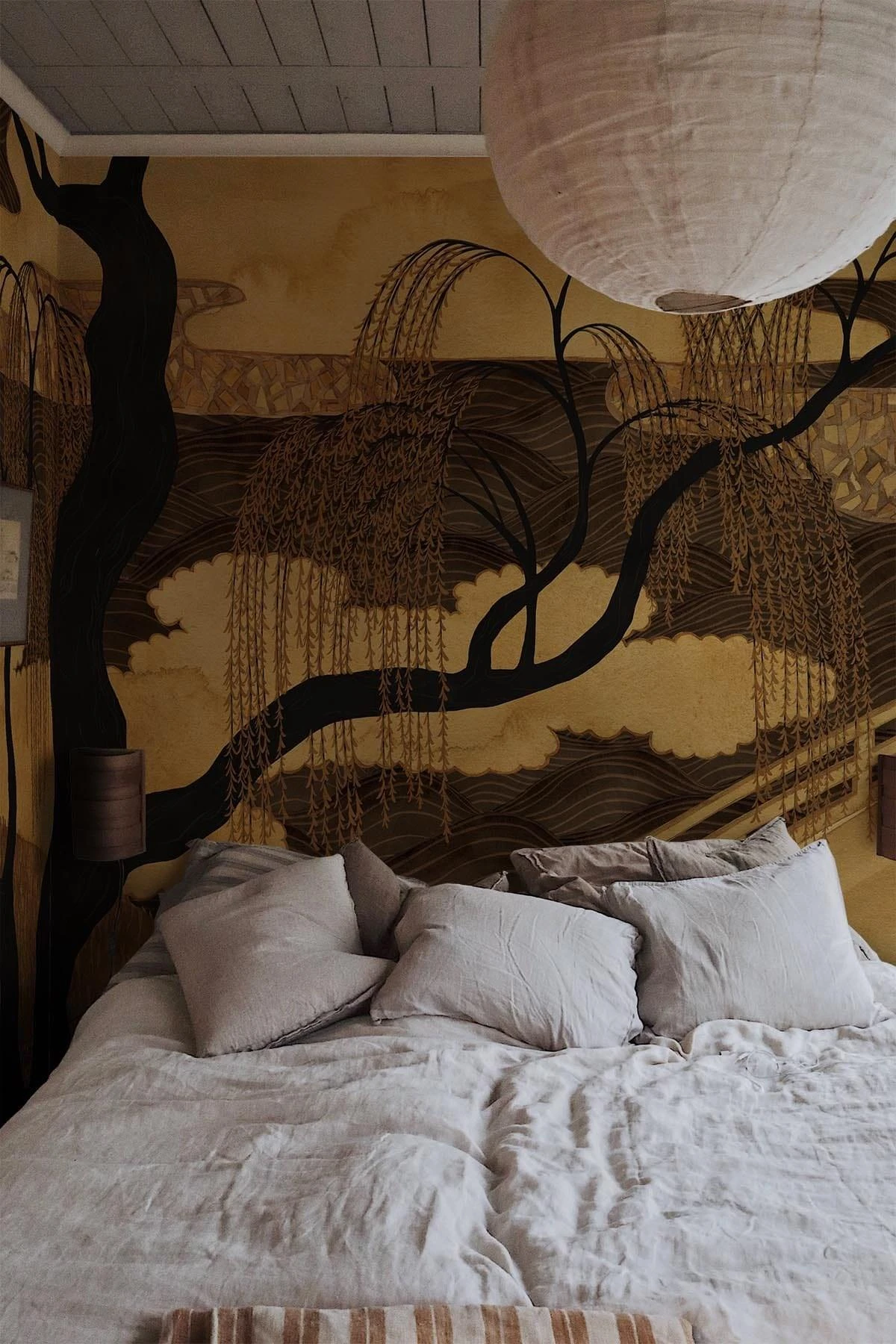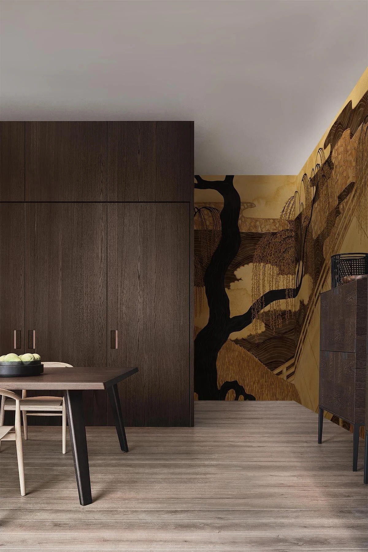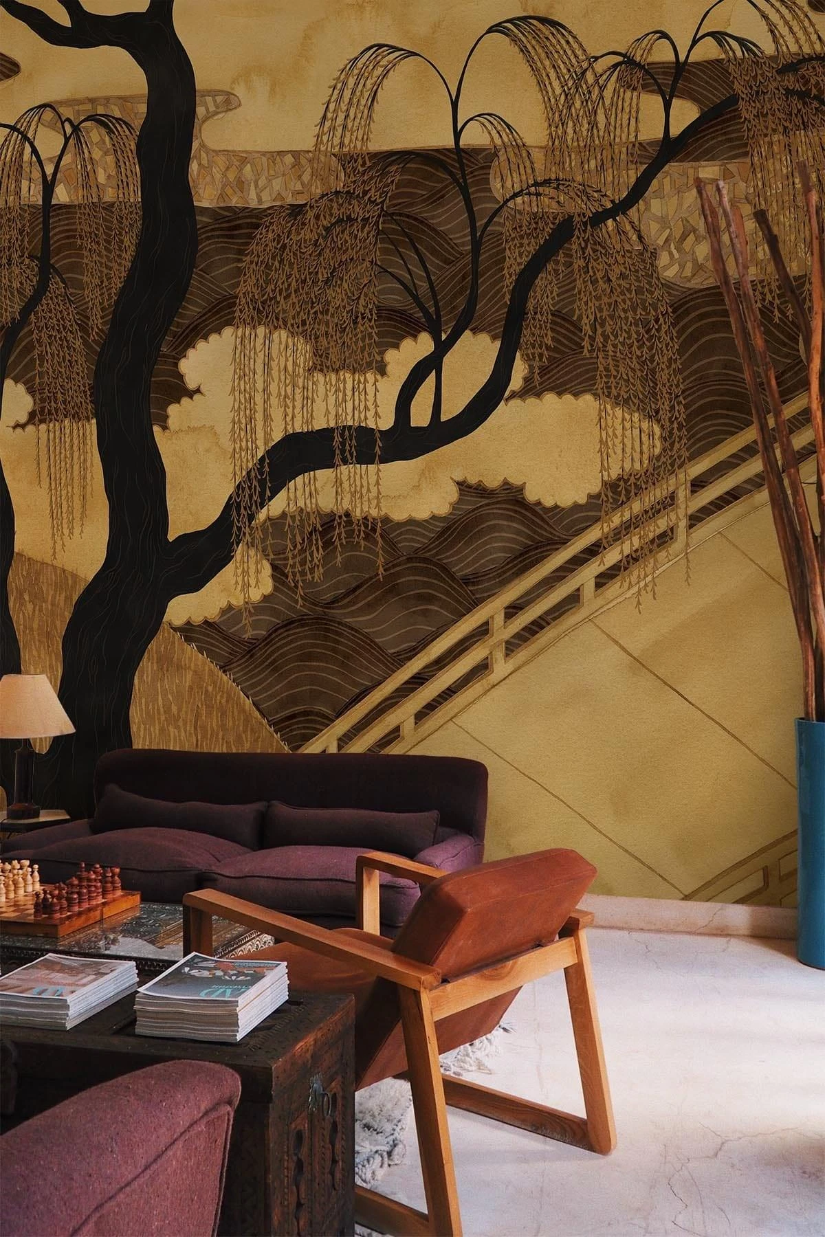 A unique landscape featuring hanging trees and a river winding under the bridge in the golden hour. Inspiration is taken from traditional Asian Art dated back to the Edo period with its ink drawing. This design is hand painted and has a warm and golden touch to it. An intricate and detailed design that celebrates historic craftsmanship but with a contemporary and modern feel.