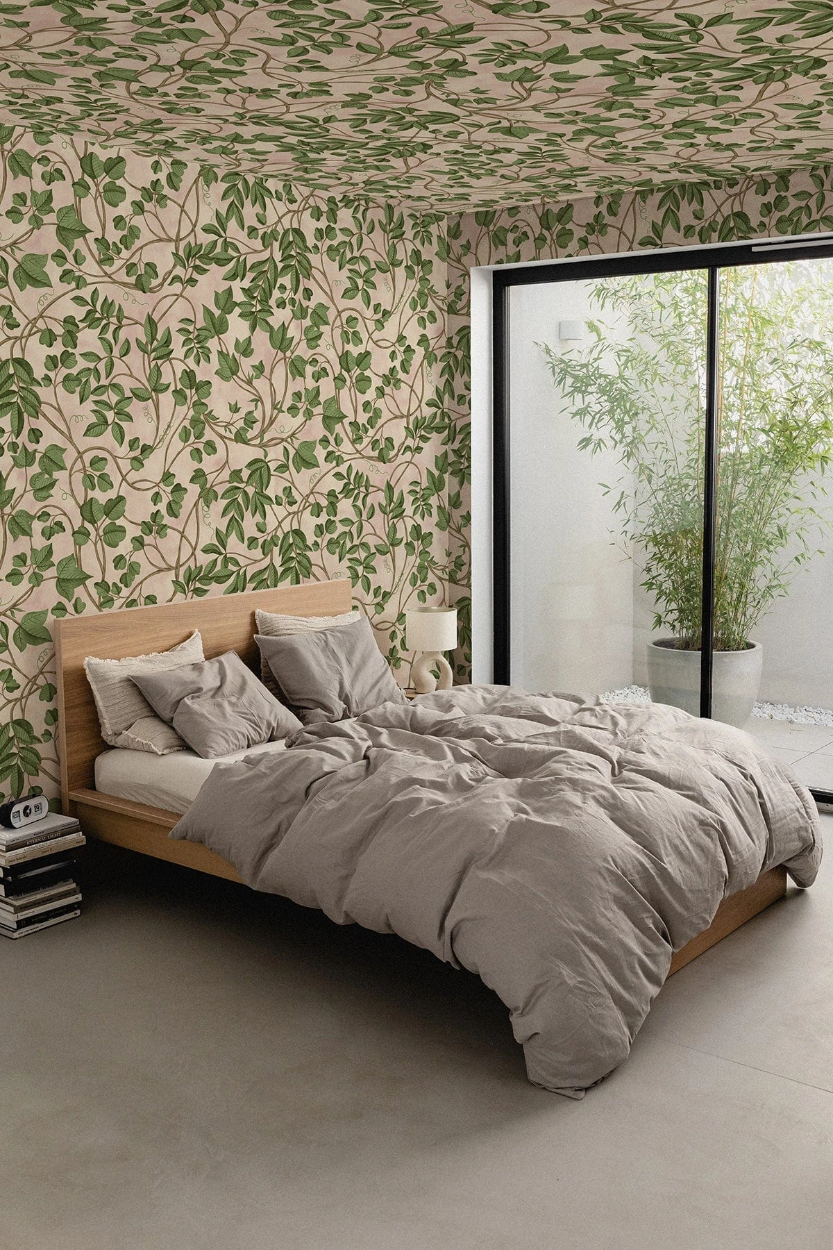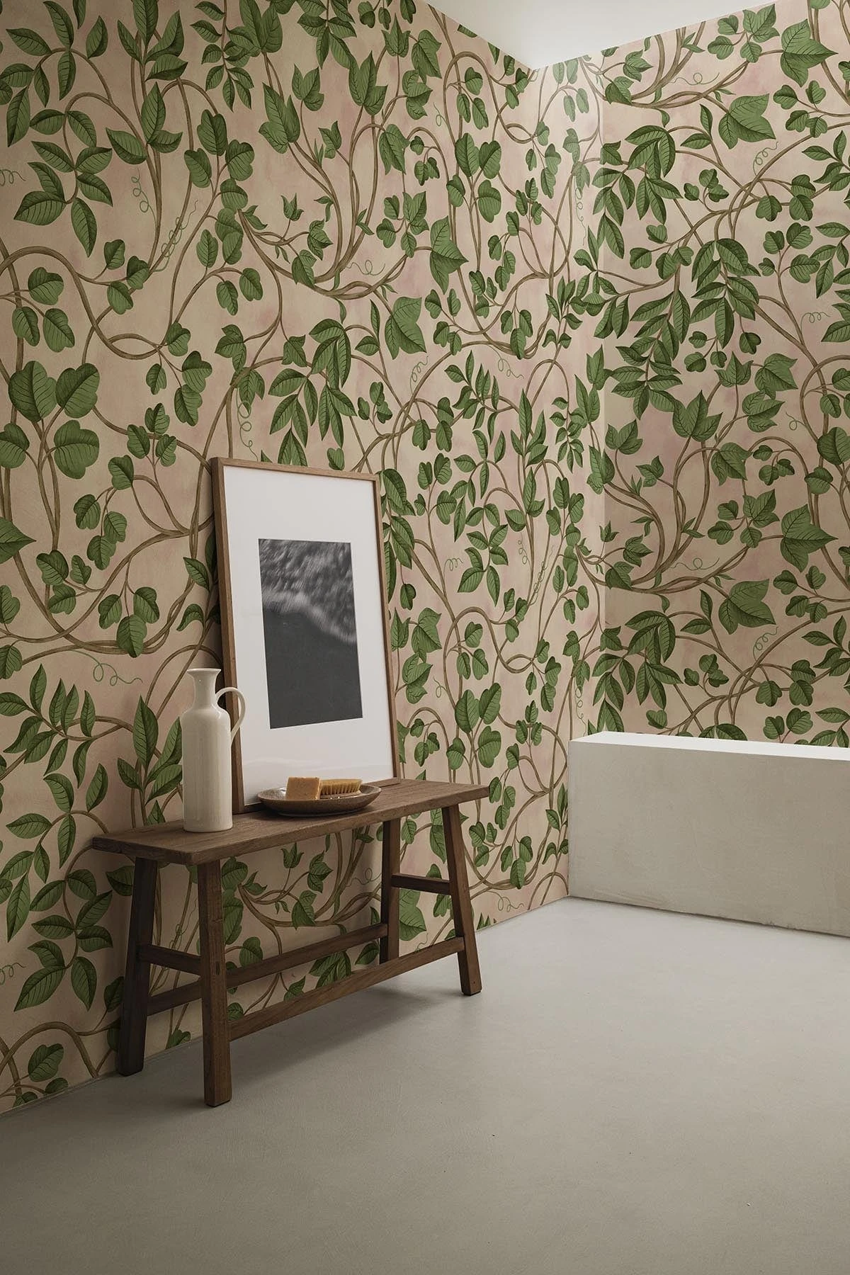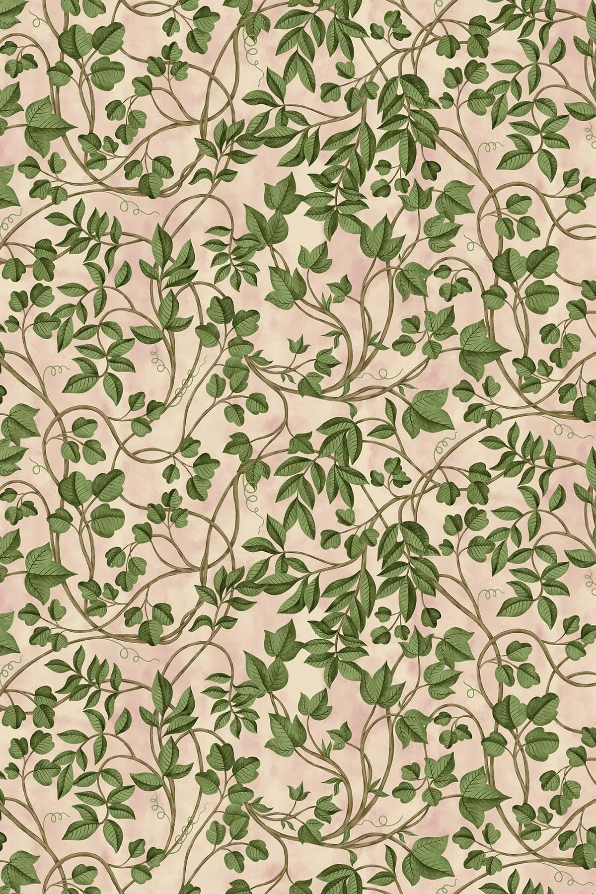 The Botanic Leaves in Pink presents a delicate balance between soft blush tones and lively green foliage. Graceful vines intertwine, creating an organic flow that brings a sense of bringing nature indoors. The contrast between the muted pink background and the fresh, detailed leaves offers a tranquil yet vibrant look. A design perfect for adding a natural and calming atmosphere to any room. This leaf covered wall mural captures the essence of botanical beauty, making it an ideal choice for those who want to incorporate a touch of nature in a subtle, elegant way