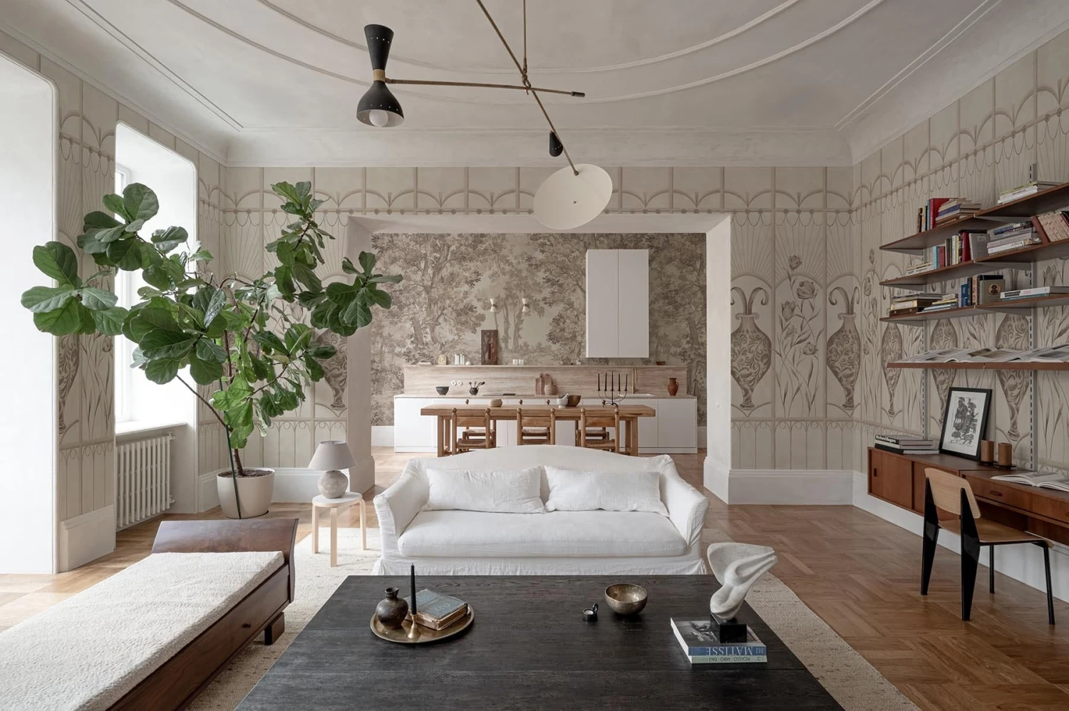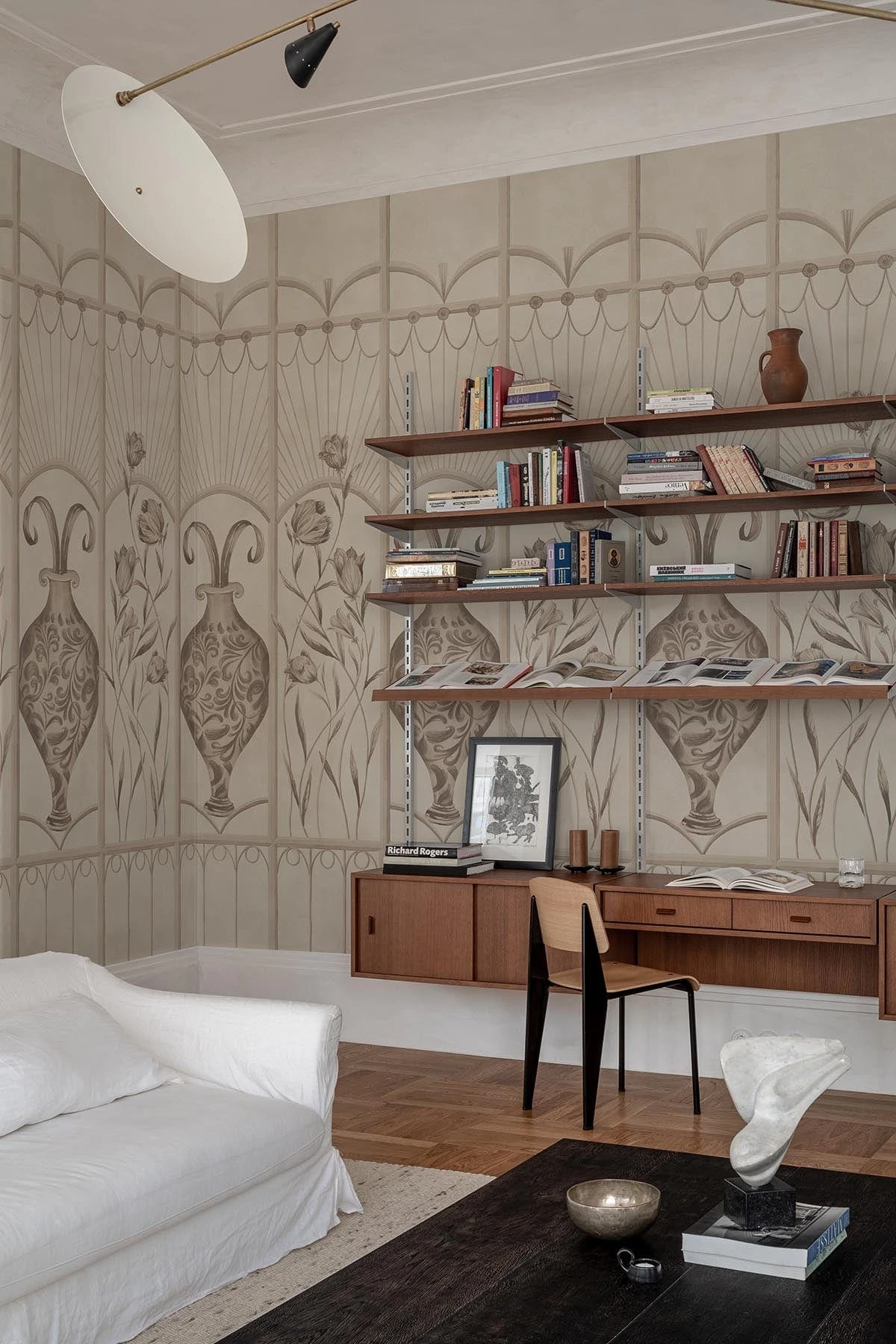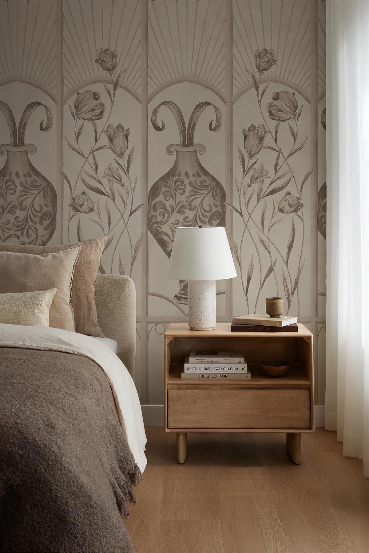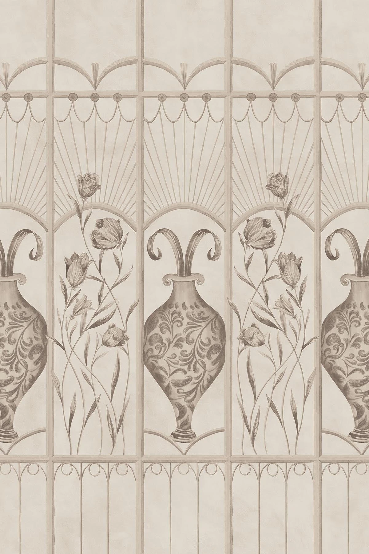 Botanical Deco in Pale Beige blends the structured elegance of Art Deco with the soft fluidity of botanical forms. Delicate arches and graceful leaves intertwine in a sophisticated, tone-on-tone palette of beige. This subtle wall mural brings a quiet, timeless beauty to any space — offering a serene interplay of classic geometry and natural inspiration. Ideal for interiors seeking understated elegance and calming design.