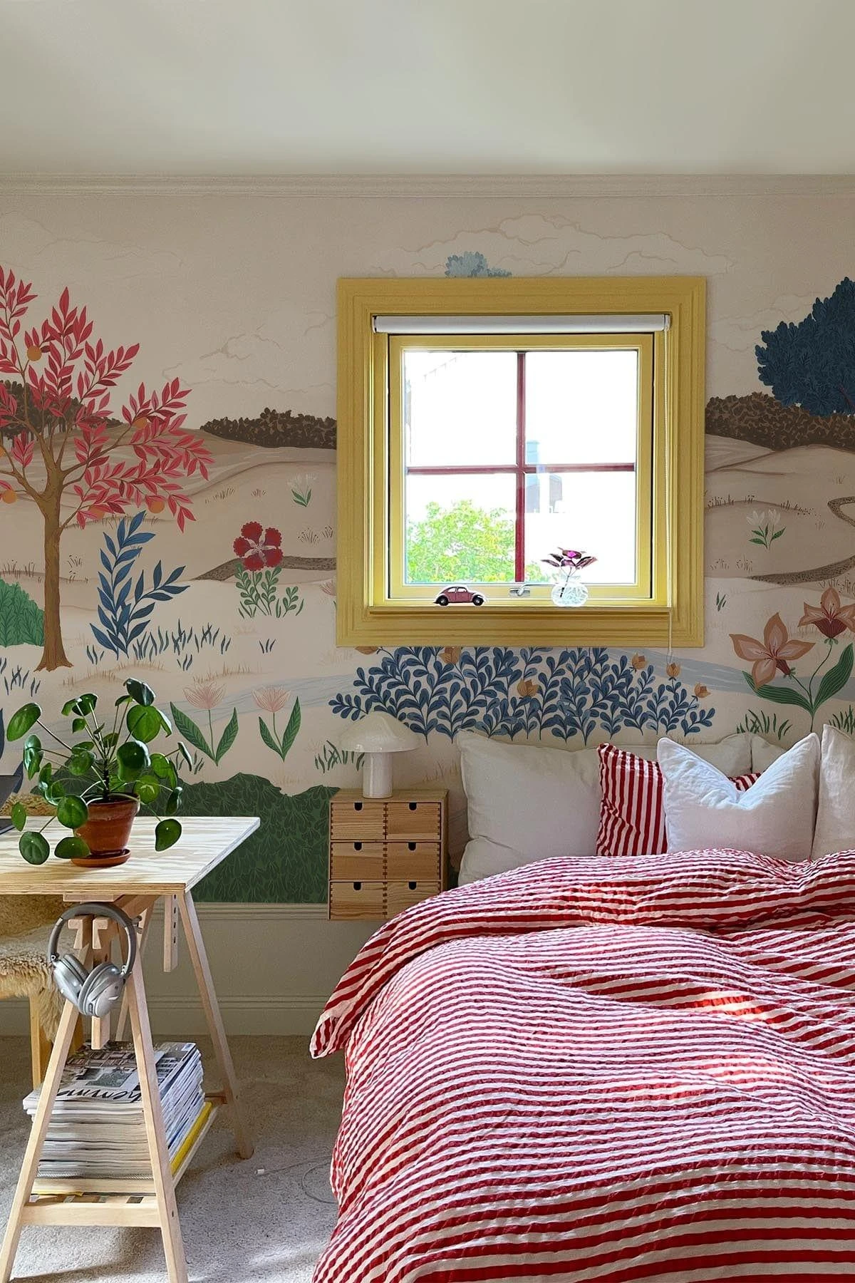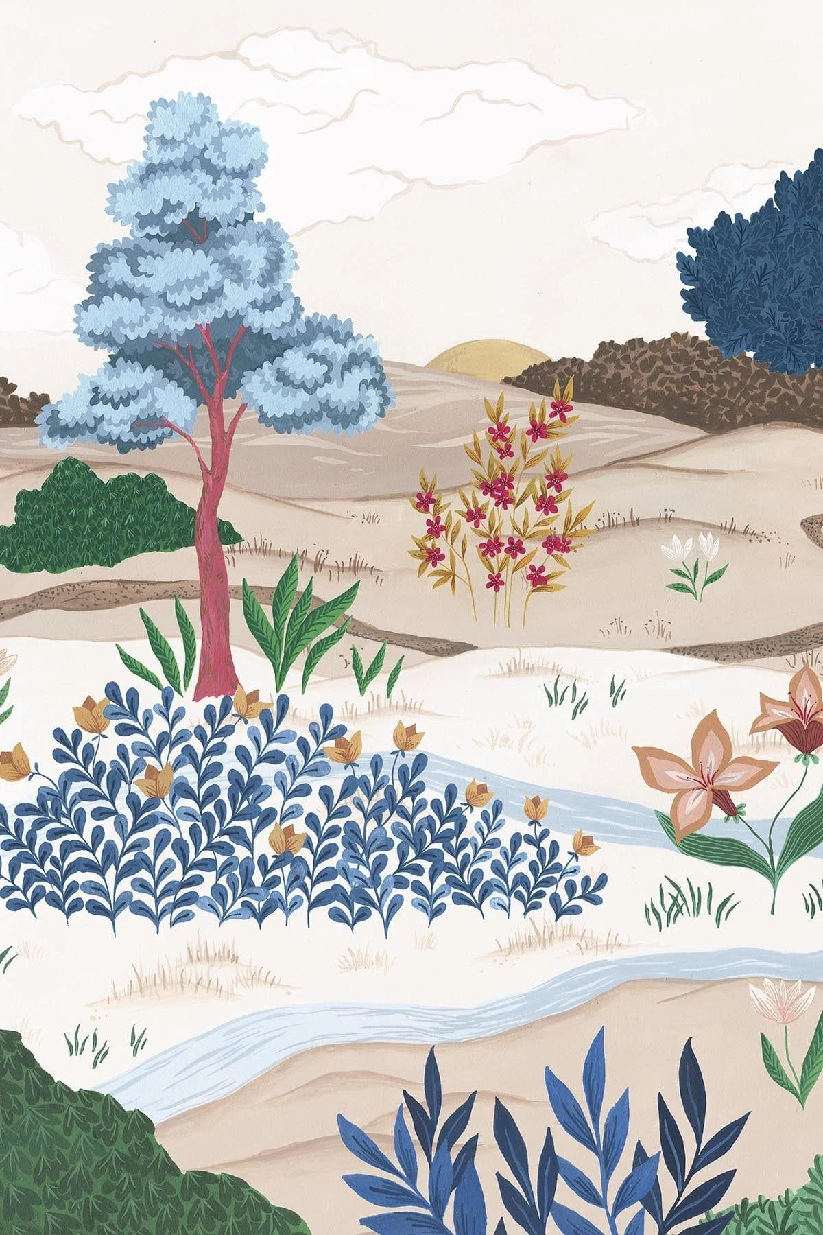 Botanical Landscape is a vivid wall mural that is full of hand painted details. Lush & colorful trees together with delicate flowers in a great variety of shapes & colors make together this playful and elegant scenery. This dynamic masterpiece transforms your space into a visual celebration, combining bold hues with classic patterns.