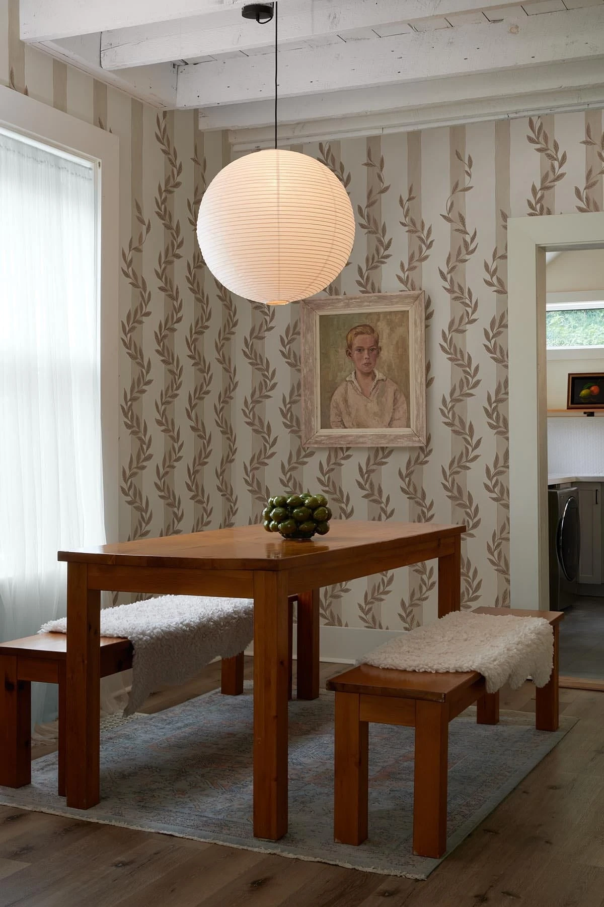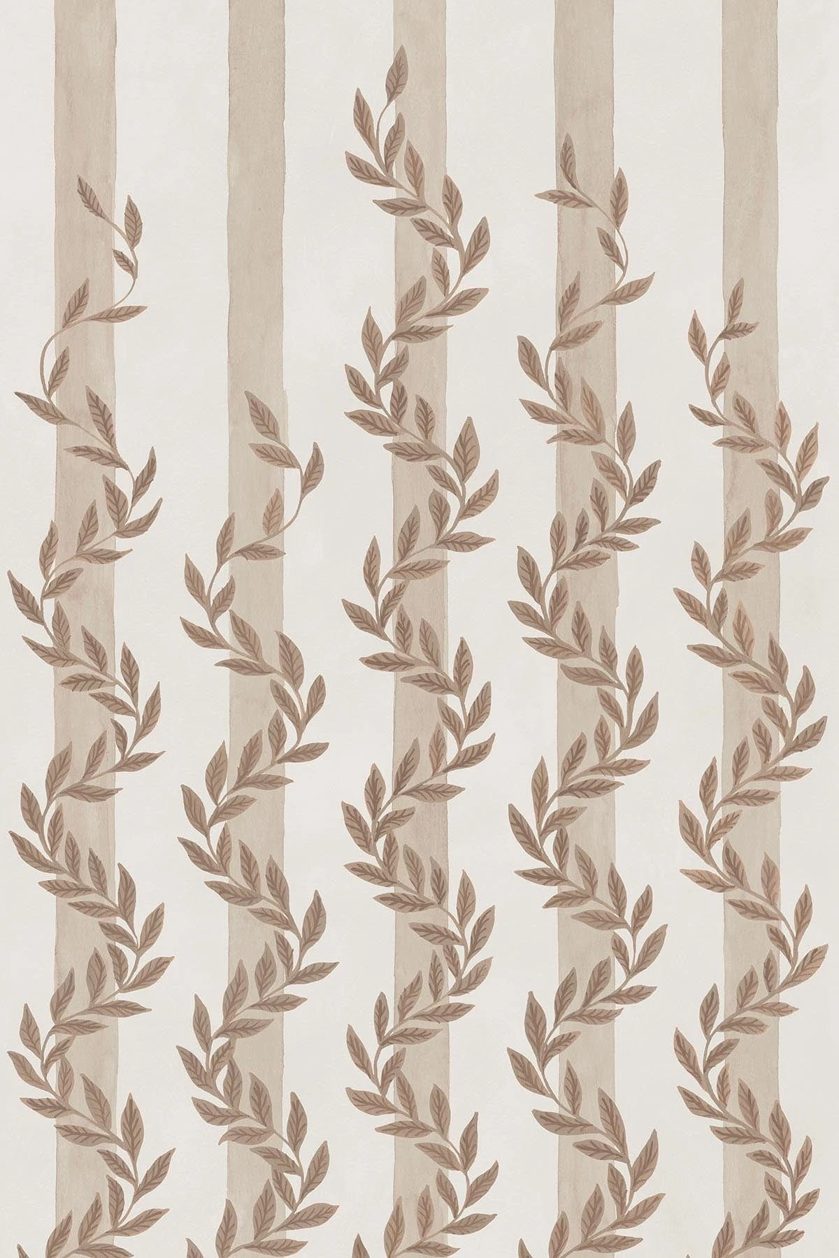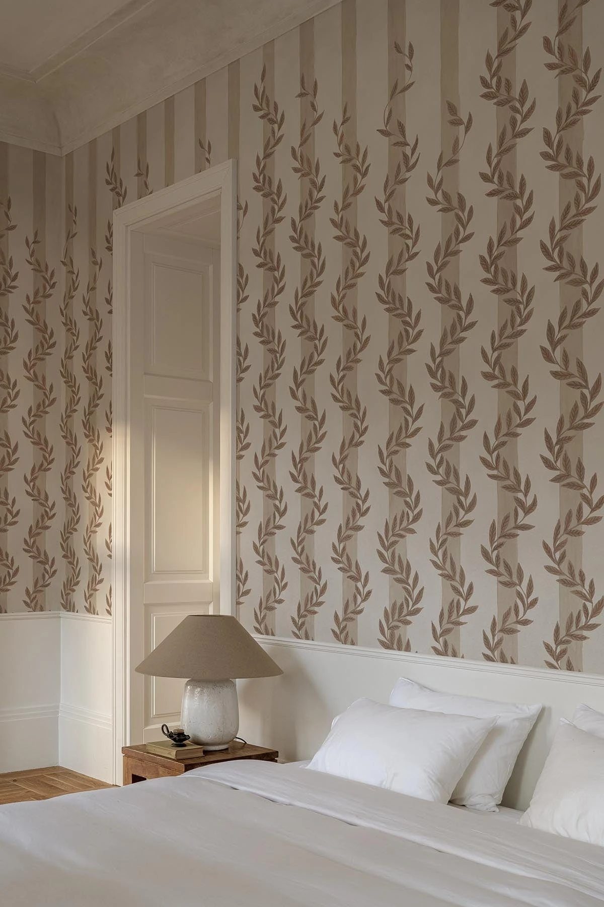 Inspired by classic patterns and the timeless beauty of nature, Botanical Stripe in Beige features softly arranged stripes paired with hand-painted floral vines climbing upward. This wall mural bridges traditional design and natural elegance, with a calming beige palette that brings warmth and sophistication. A perfect choice for interiors seeking a serene, graceful connection between classic style and botanical charm.
