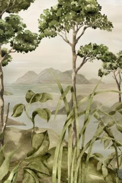 Drawing inspiration from classic patterns and the comforting embrace of nostalgia, Botanical stripe combines arranged stripes and hand painted leaves that climb up towards the ceiling., This botanical striped mural bridges the past and the present. Its traditional design in yellow radiates timeless charm, where meticulously arranged stripes intertwine with hand painted leaves to form a captivating blend of classic and natural elements. The soft yellow color palette introduces sophistication, while the traditional pattern, featuring stripes and artisanal leaves, enhances the overall aesthetic. This mural is a splendid choice for those in search of a harmonious union between traditional elegance and botanical allure.