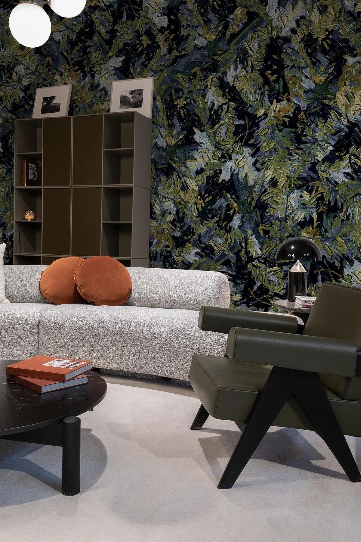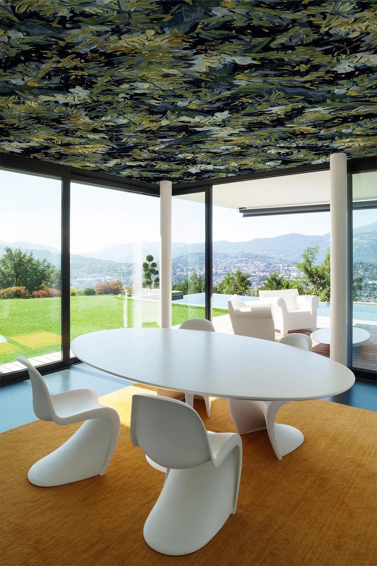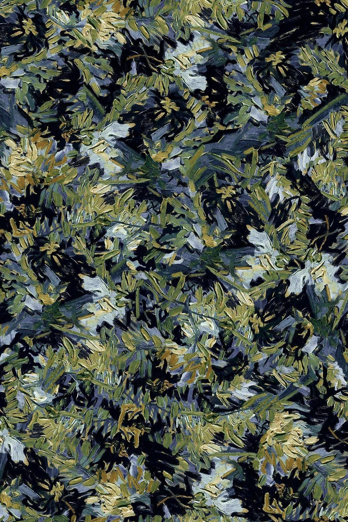 Oil painted strokes that draw your mind to nature and foliage. Thick layers of blue and green paint creates depth and a variation of color. Expression inspired by classics like Van Gogh.