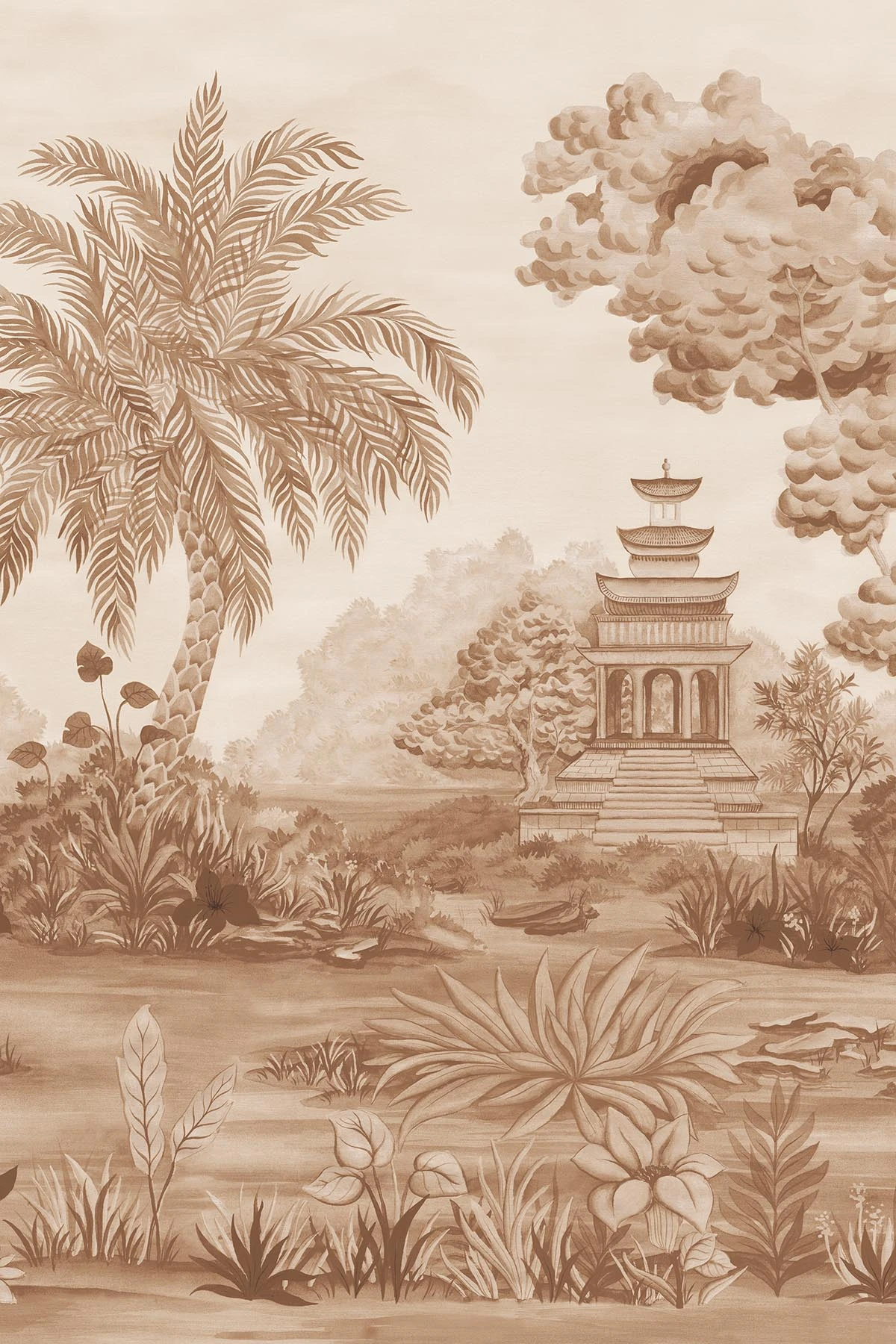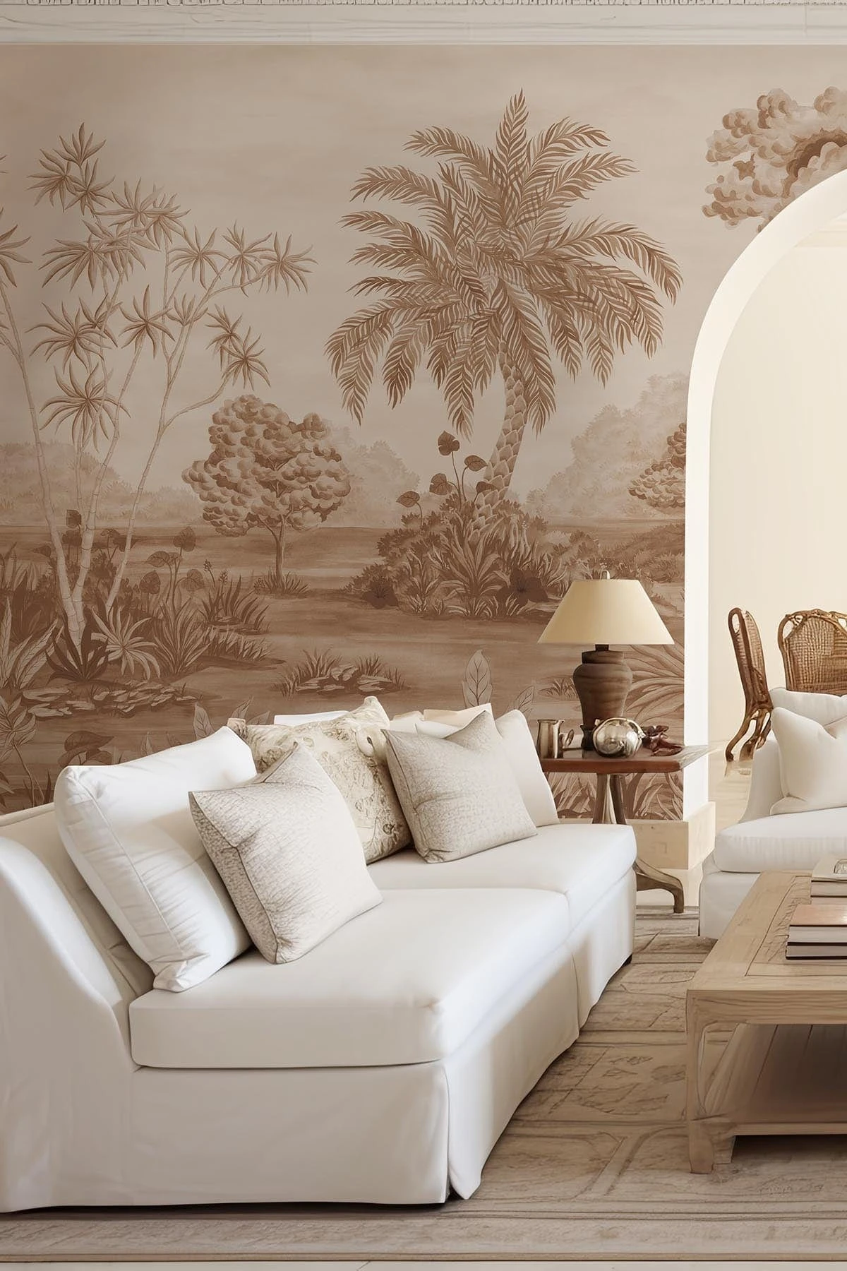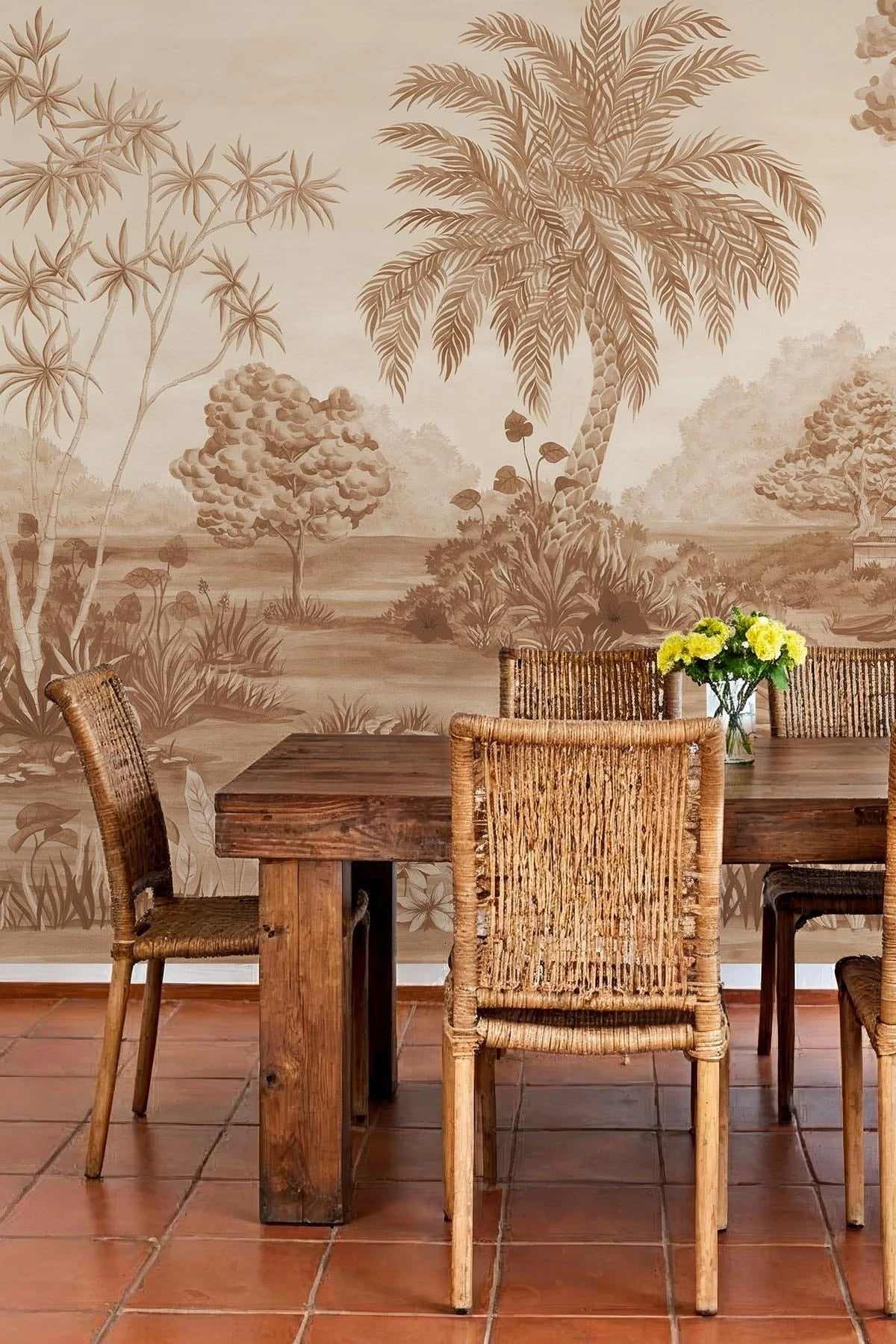 This hand-painted wallpaper captures the calm beauty of a Caribbean landscape in soft sand tones. Bamboo trees, rolling hills, and botanical forms are illustrated with precision, creating a subtle sense of depth and movement. The motif highlights bamboo, a material celebrated for both its elegance and sustainability. Elegant and subtle, it’s designed for interiors that seek a sense of calm, timeless character, and thoughtful material choices.