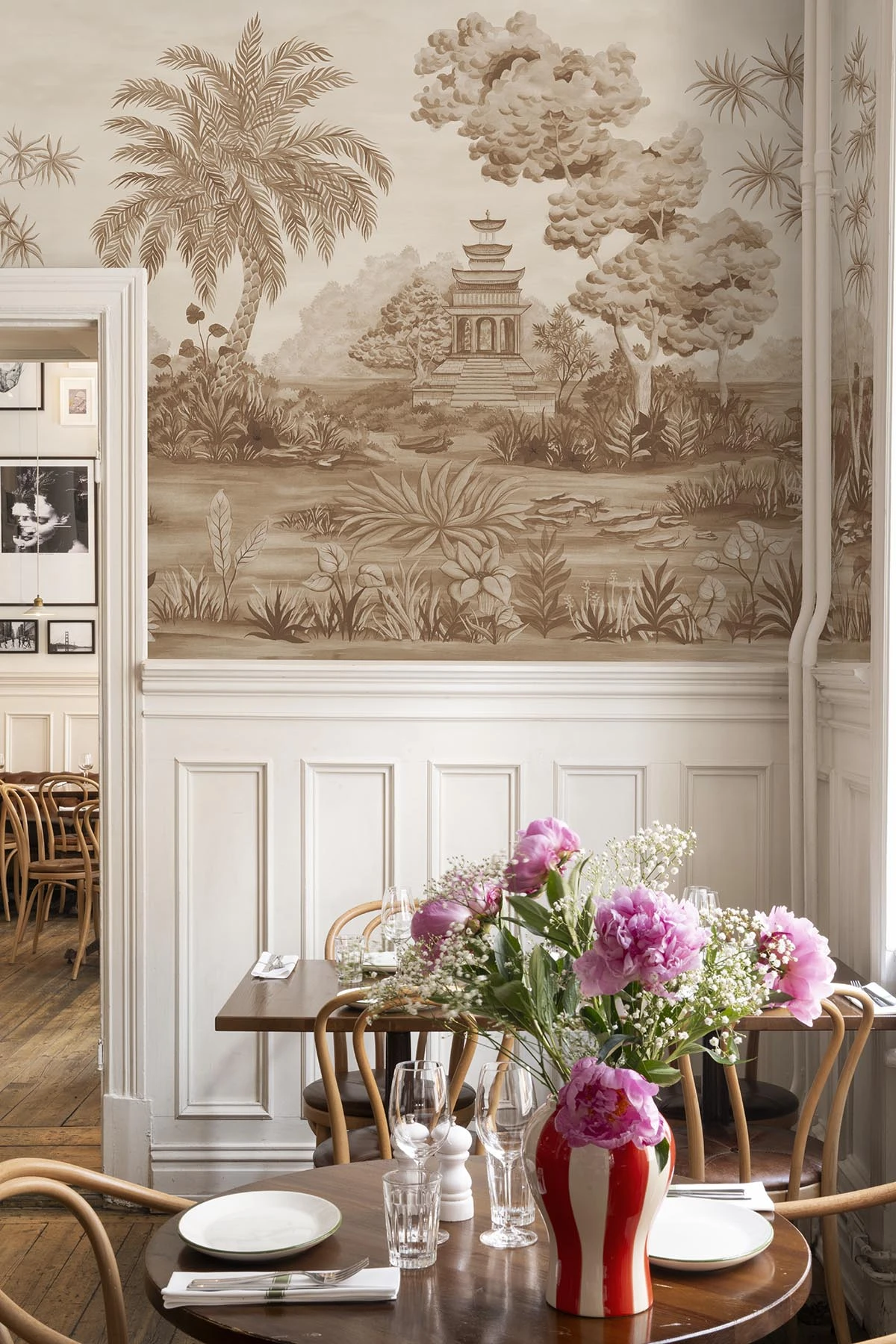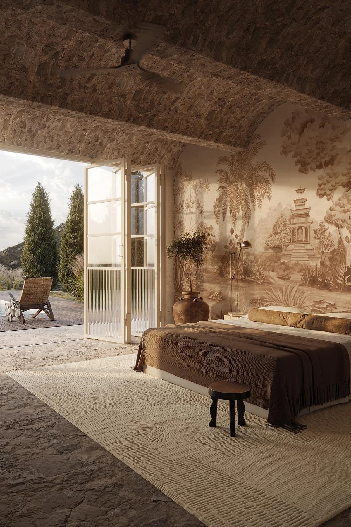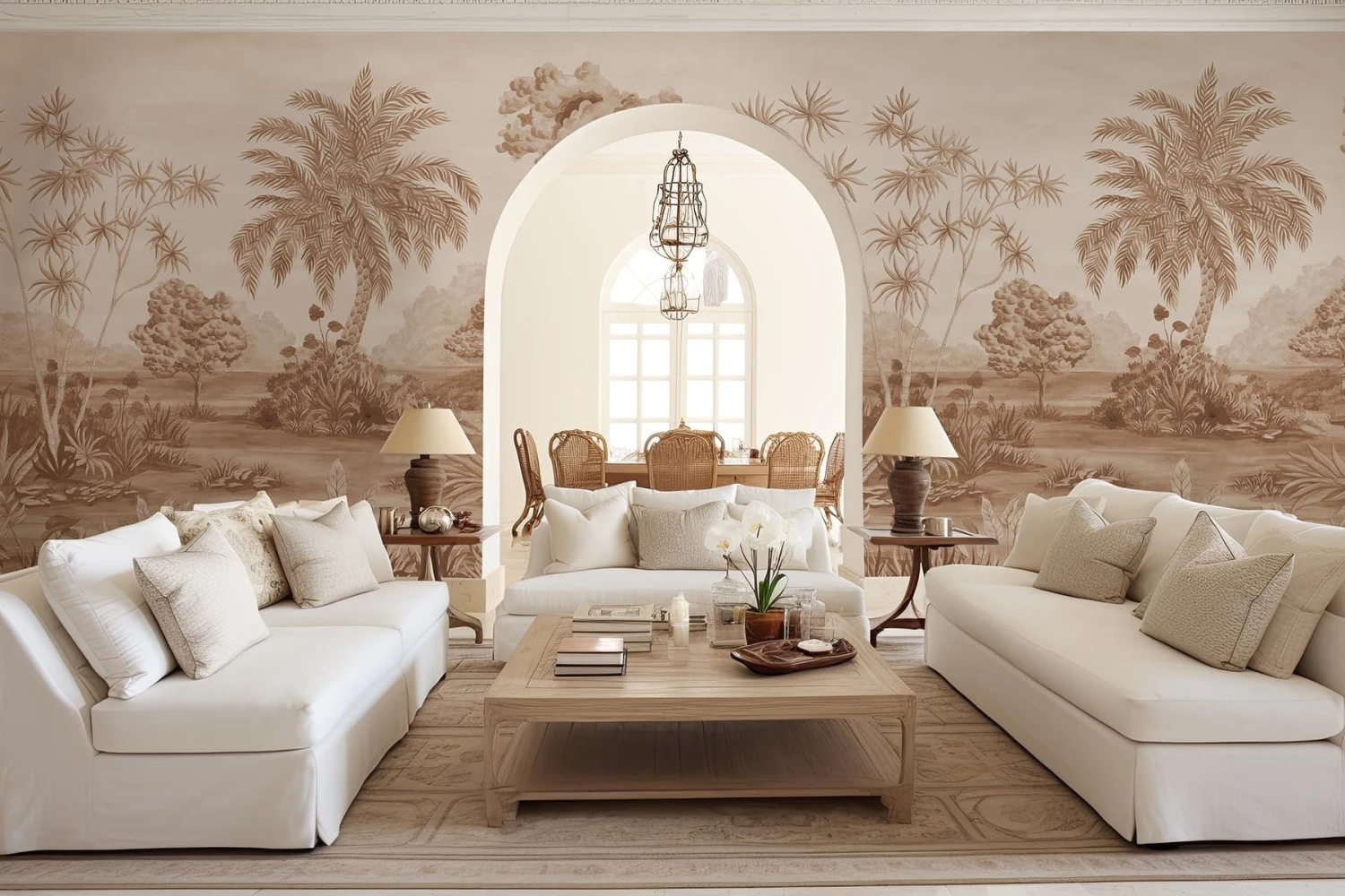 This hand-painted wallpaper captures the calm beauty of a Caribbean landscape in soft sand tones. Bamboo trees, rolling hills, and botanical forms are illustrated with precision, creating a subtle sense of depth and movement. The motif highlights bamboo, a material celebrated for both its elegance and sustainability. Elegant and subtle, it’s designed for interiors that seek a sense of calm, timeless character, and thoughtful material choices.