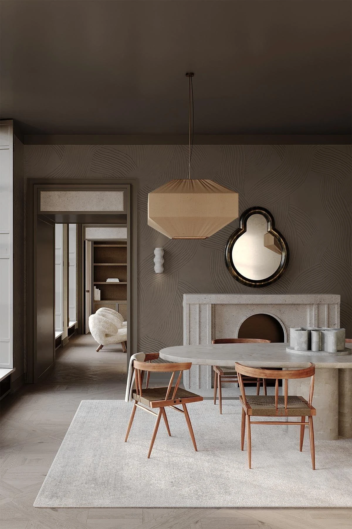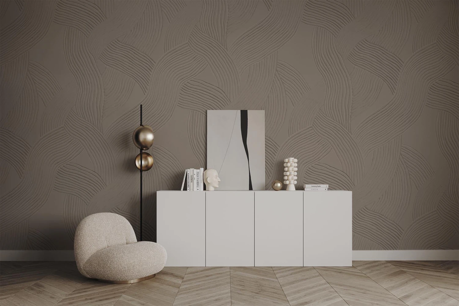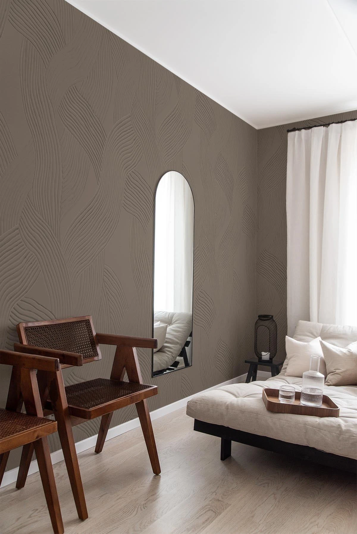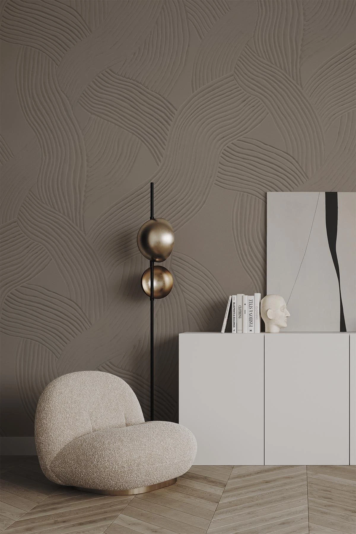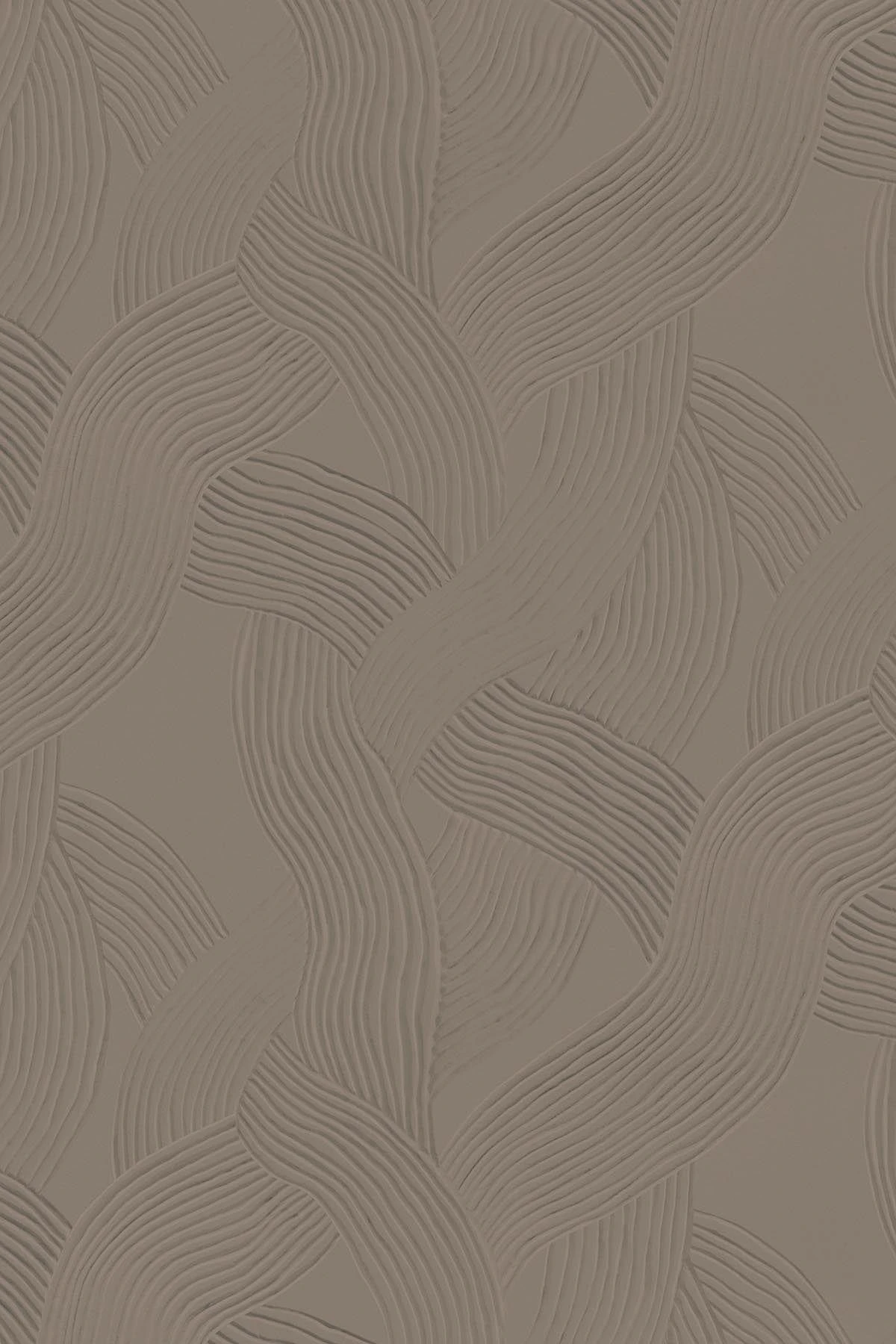 Carved lines in plaster creating an organic curved wall mural design. Roughness meets soft and calming waves creating a sophisticated and contemporary touch to any interior. This brown wall mural is made for timeless spaces and gives a wabi sabi feel to the interior. It can be adjusted in scale to fit your space. Note: This is wallpaper with a visual 3D look printed on flat non woven paper.