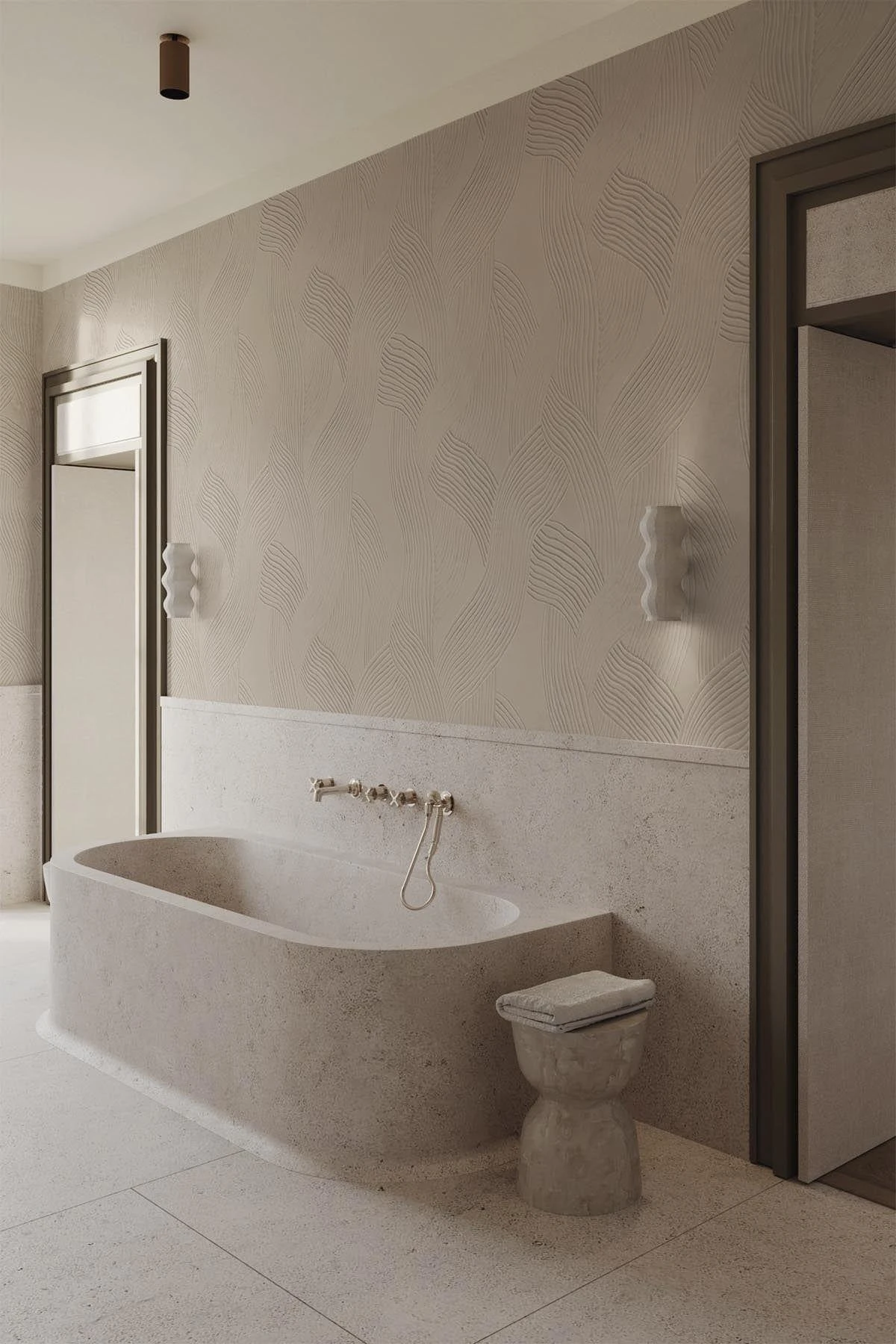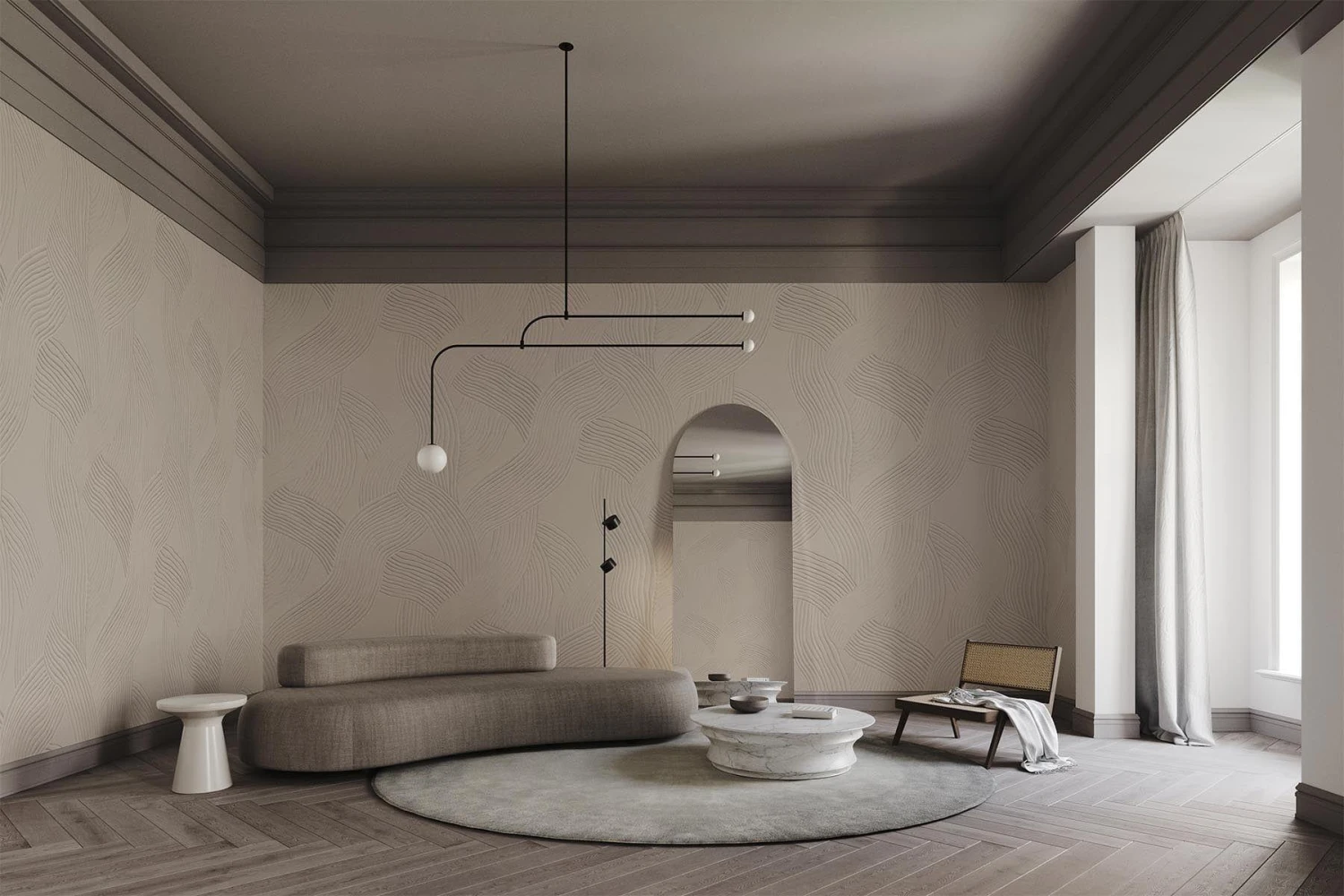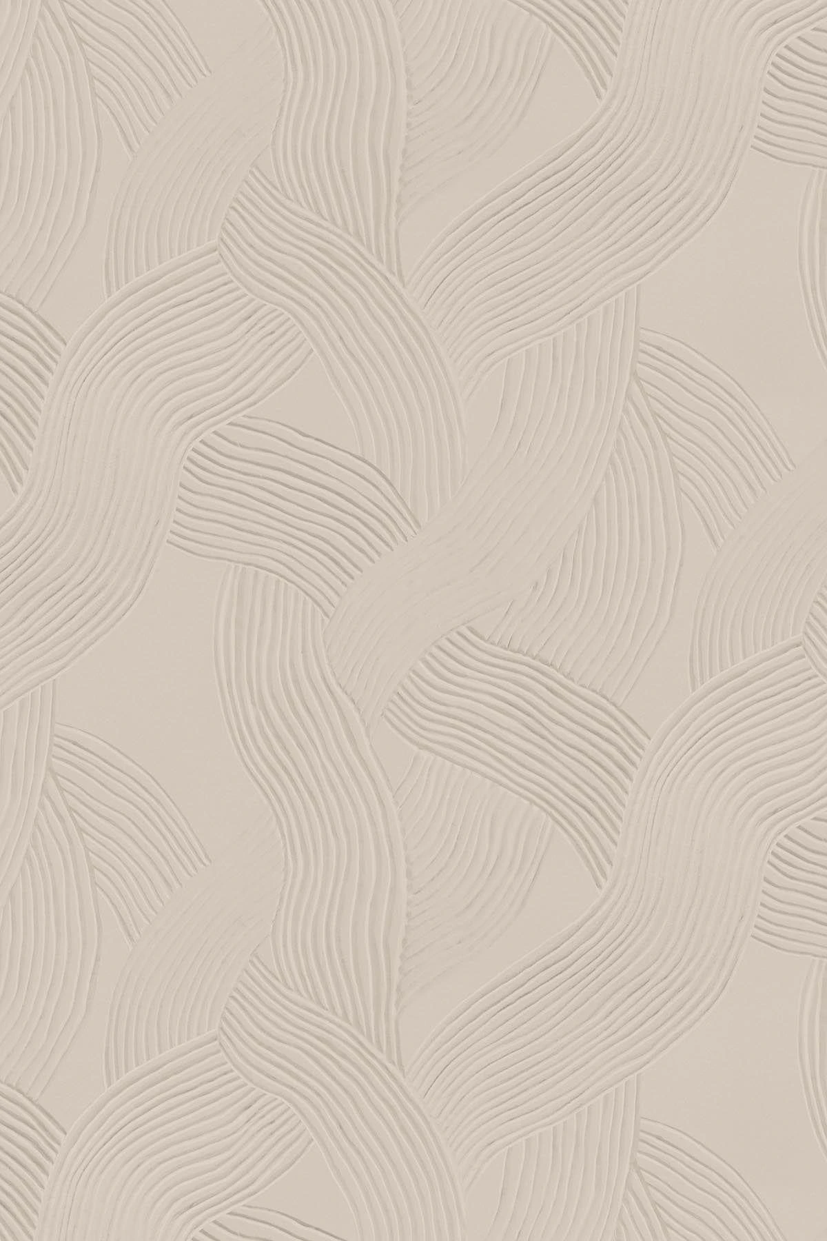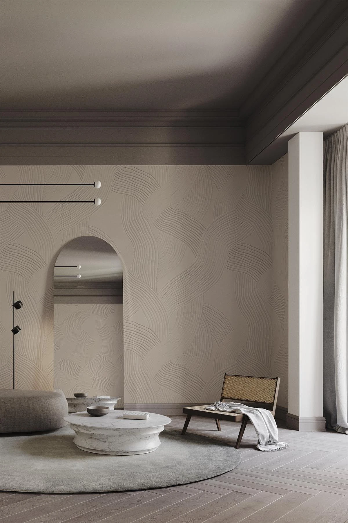 Carved lines in plaster creating an organic curved wall mural design. Roughness meets soft and calming waves creating a sophisticated and contemporary touch to any interior. This warm beige wall mural is made for timeless spaces and gives a wabi sabi feel to the interior. It can be adjusted in scale to fit your space. Note: This is wallpaper with a visual 3D look printed on flat non woven paper.