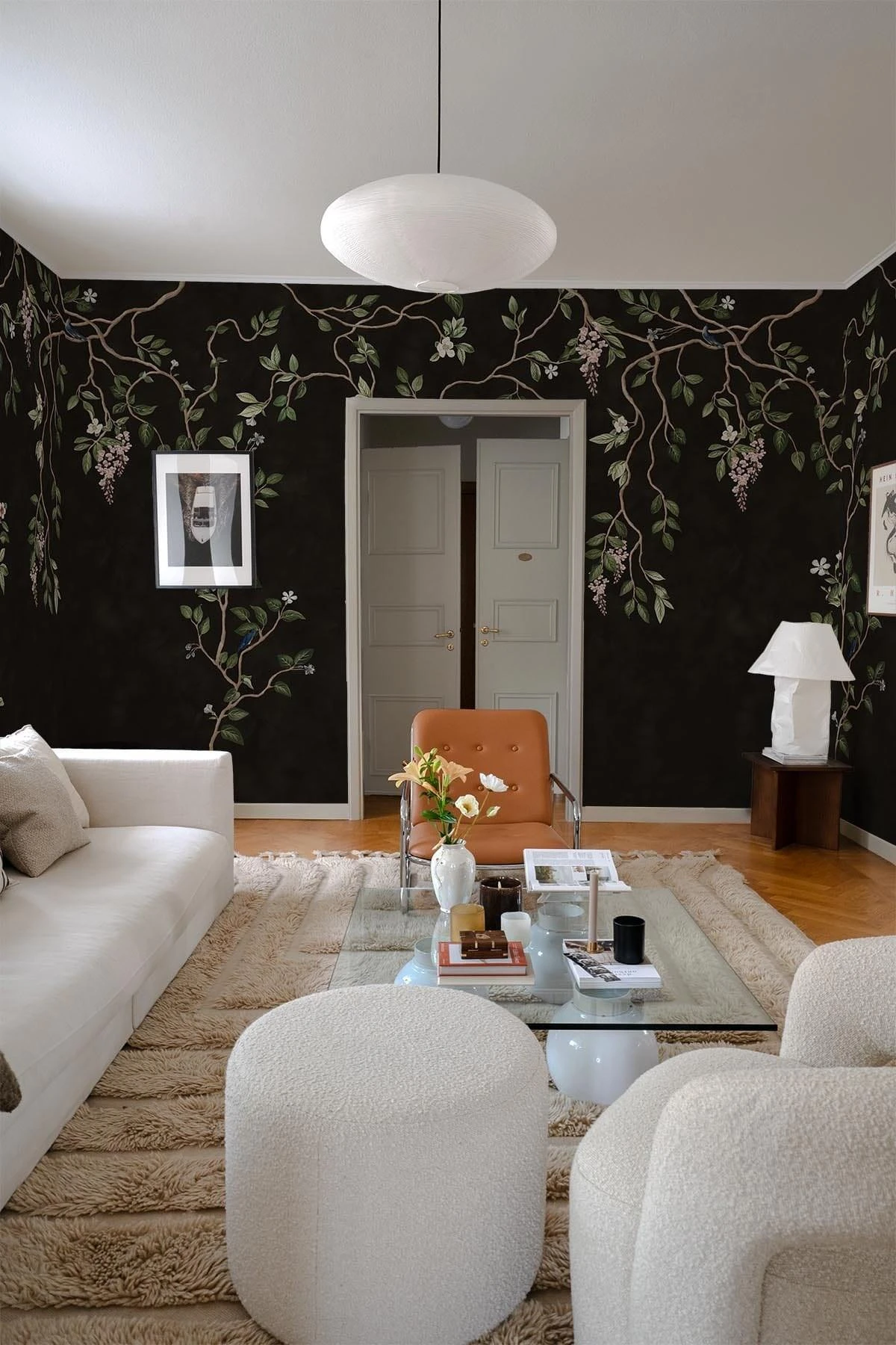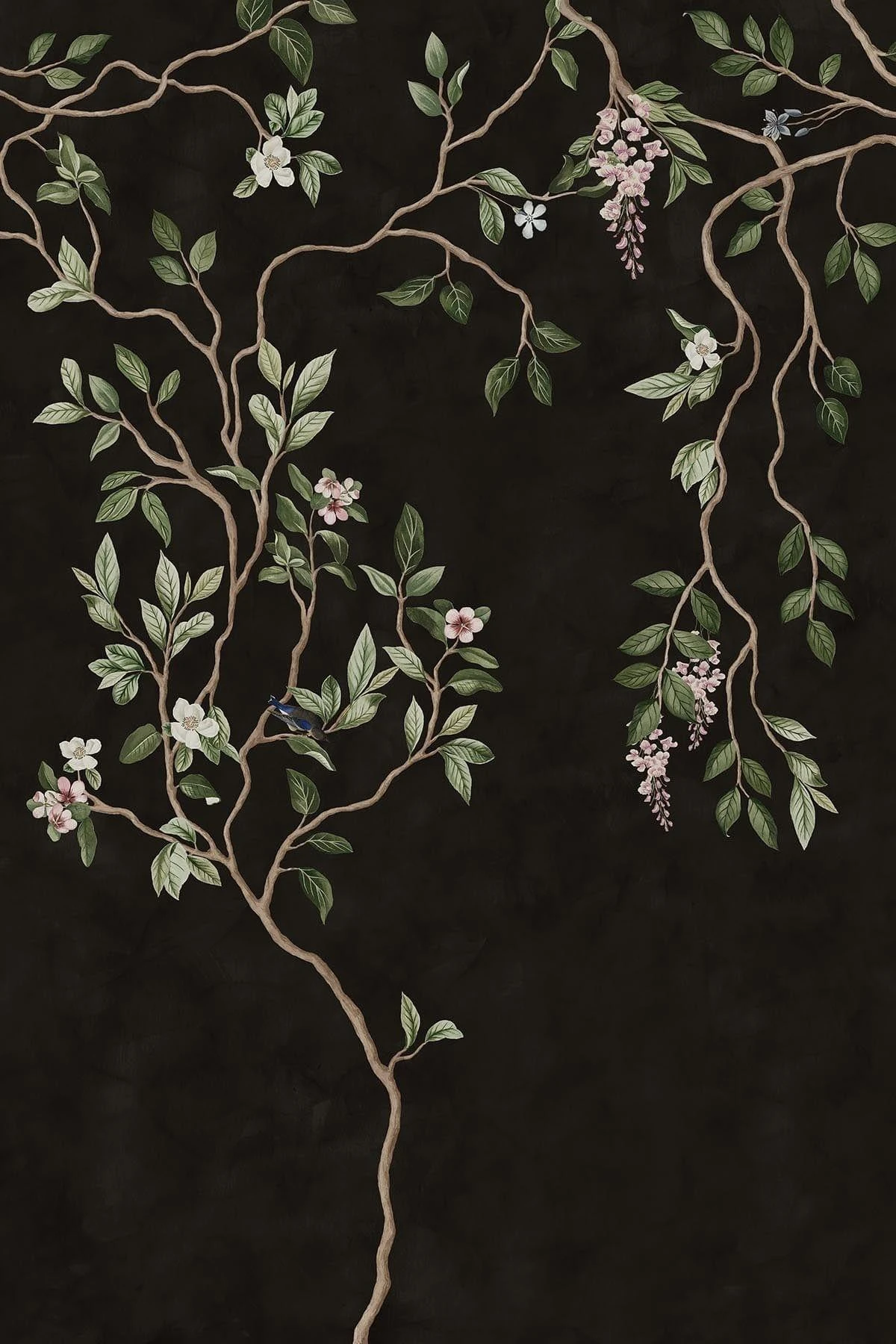This exquisite mural effortlessly marries the timeless allure of Chinoiserie design with the dramatic backdrop of rich, deep black.