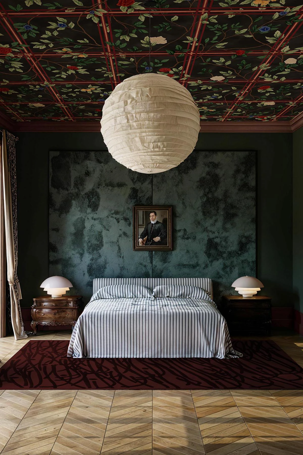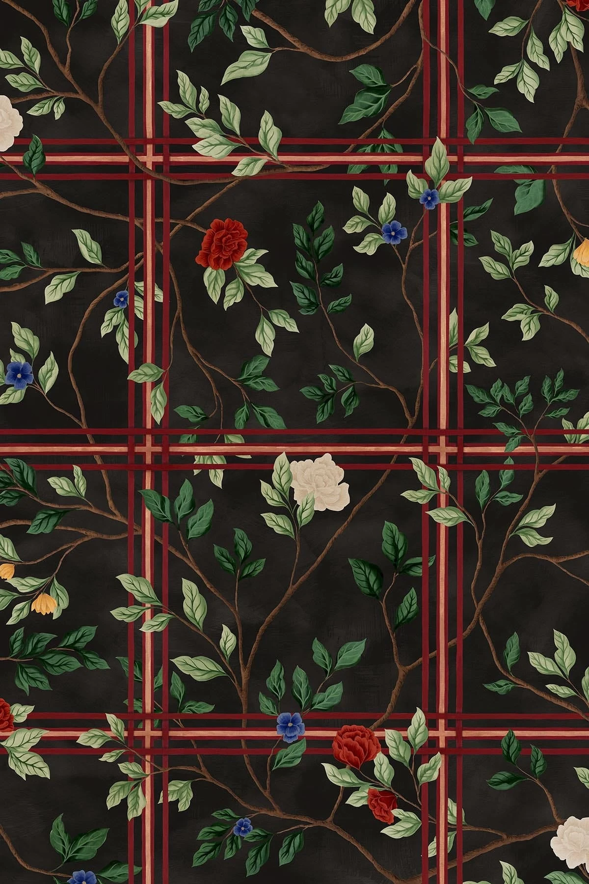 Step into a secret garden where classic chinoiserie meets bold modernity. The Black version of Chinoiserie Check is a moody masterpiece—featuring swirling, hand-painted floral branches in rich greens, reds, and blues, all framed within a striking red and black checked grid. This bold contrast between organic elegance and geometric structure invites the eye to wander and wonder. Ideal for dramatic dining rooms or atmospheric ceilings.