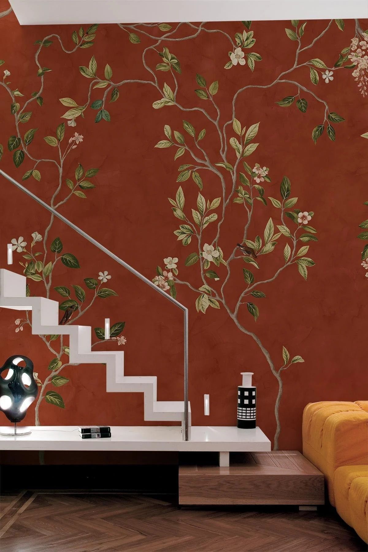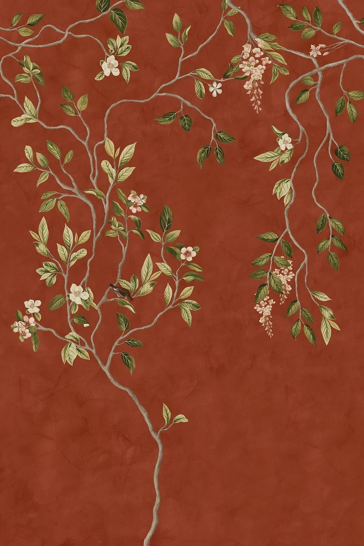 Explore the timeless allure of our Chinoiserie wall mural, where the enchanting beauty of traditional Chinese artistry meets the drama of a deep rust red backdrop. Adorn your surroundings with a captivating display of detailed flowers and foliage. Every delicate petal and leaf have been carefully hand-painted to capture the beauty of nature with stunning precision. The lively blossoms set against the rich rust red backdrop form an eye-catching centerpiece, adding luxury and elegance to any space. Elevate a room of yours, with this work of art that seamlessly blends classic beauty with modern design.