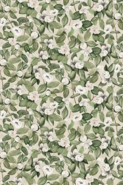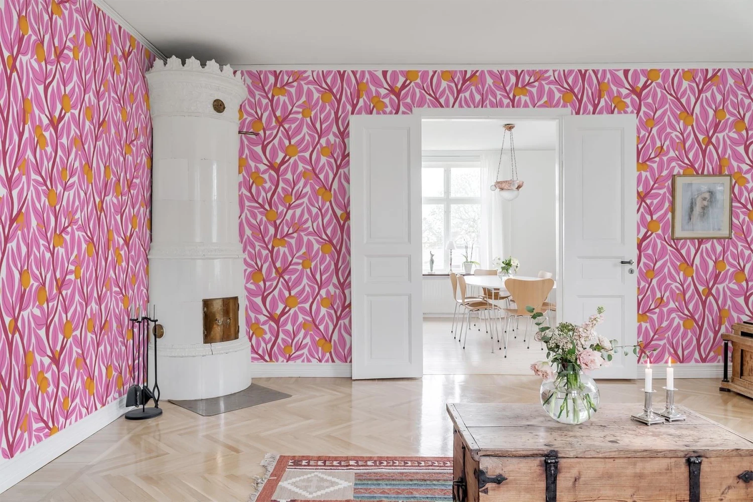 Winding branches with leaves and citrus finds its way from floor to ceiling. The bright pink colors and complex but balanced repeat gives the design a nostalgic touch.