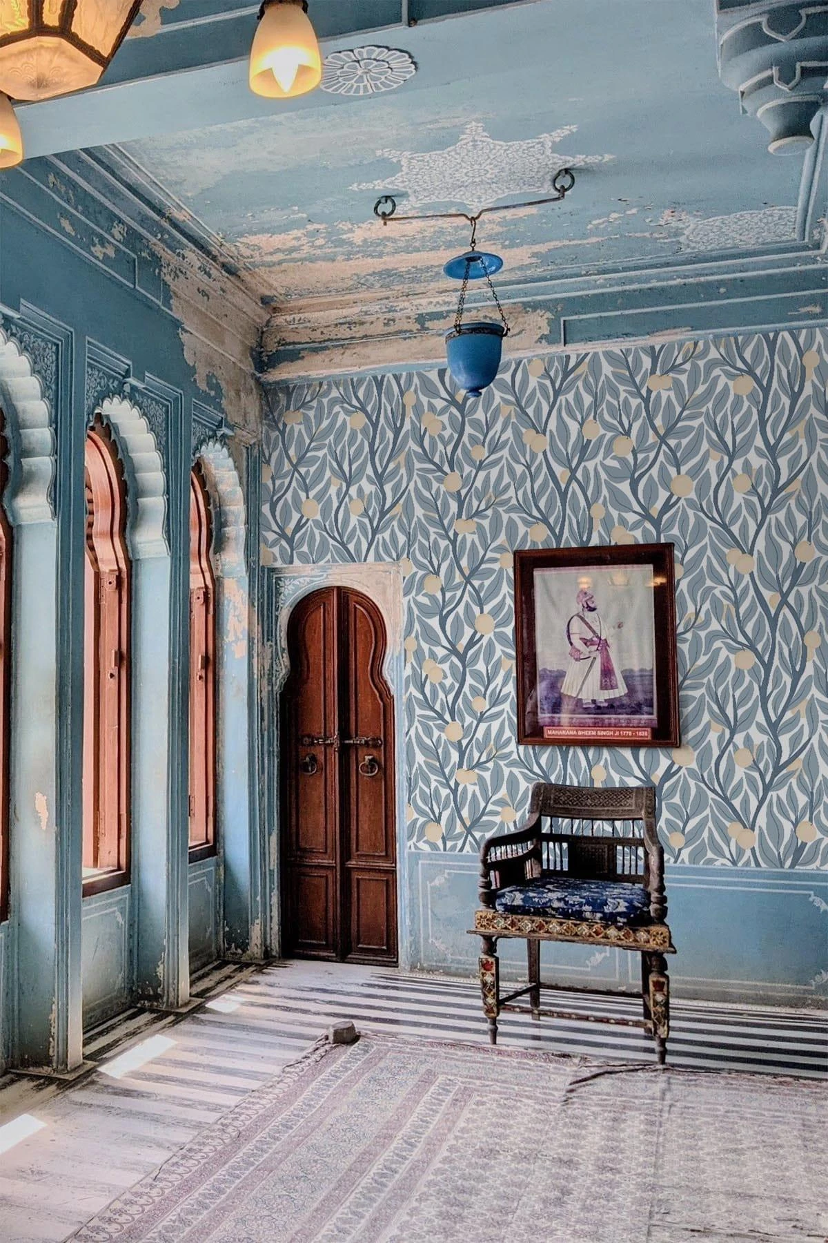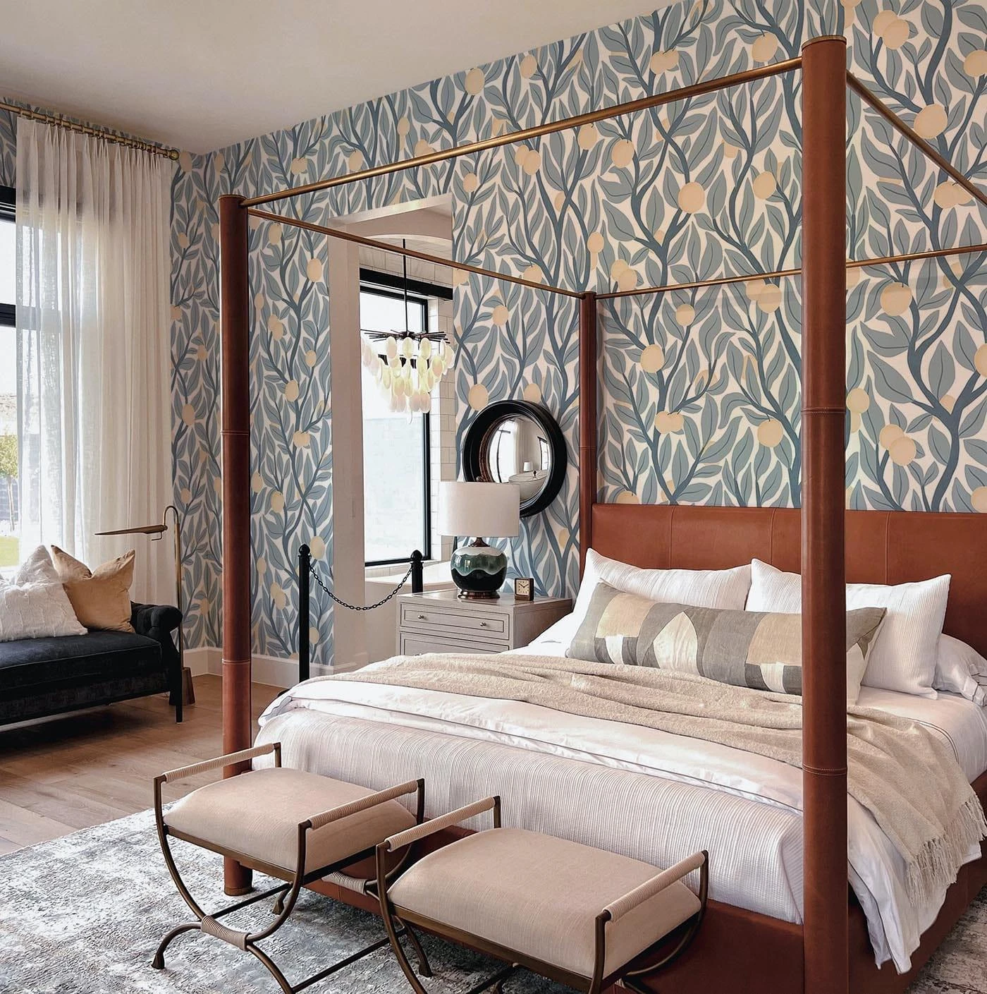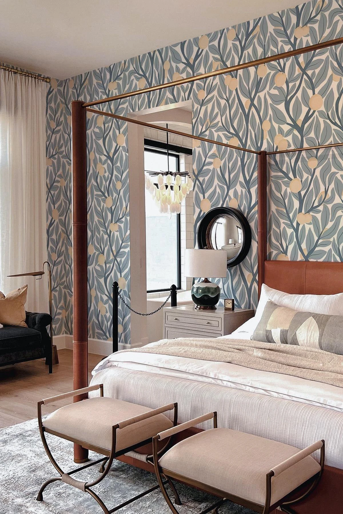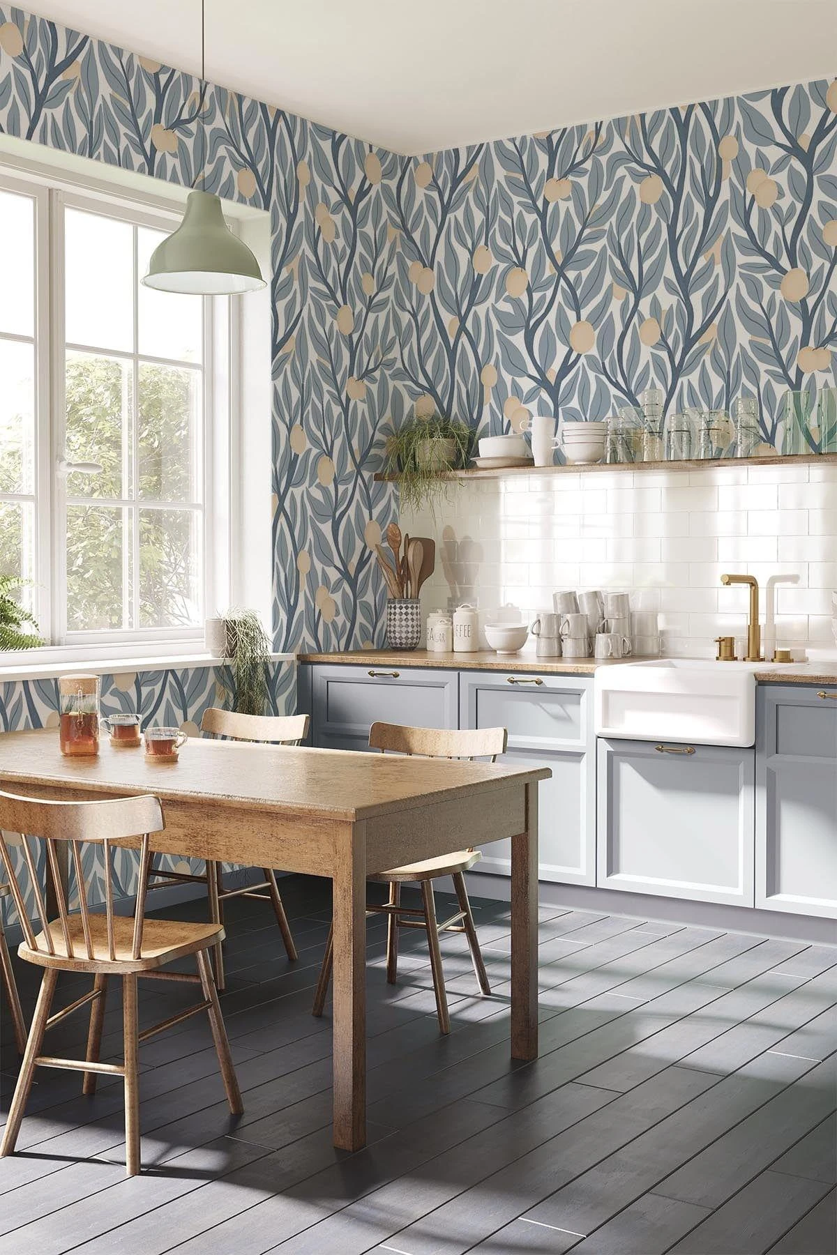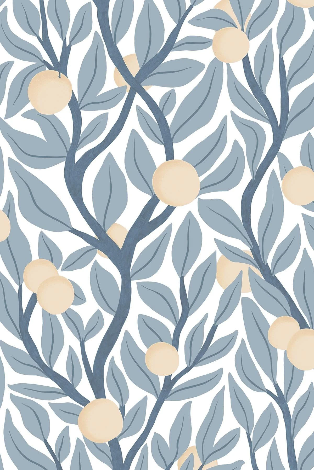 Winding branches with leaves and citrus finds its way from floor to ceiling. The dusty blue colors and complex but balanced repeat gives the design a nostalgic touch.