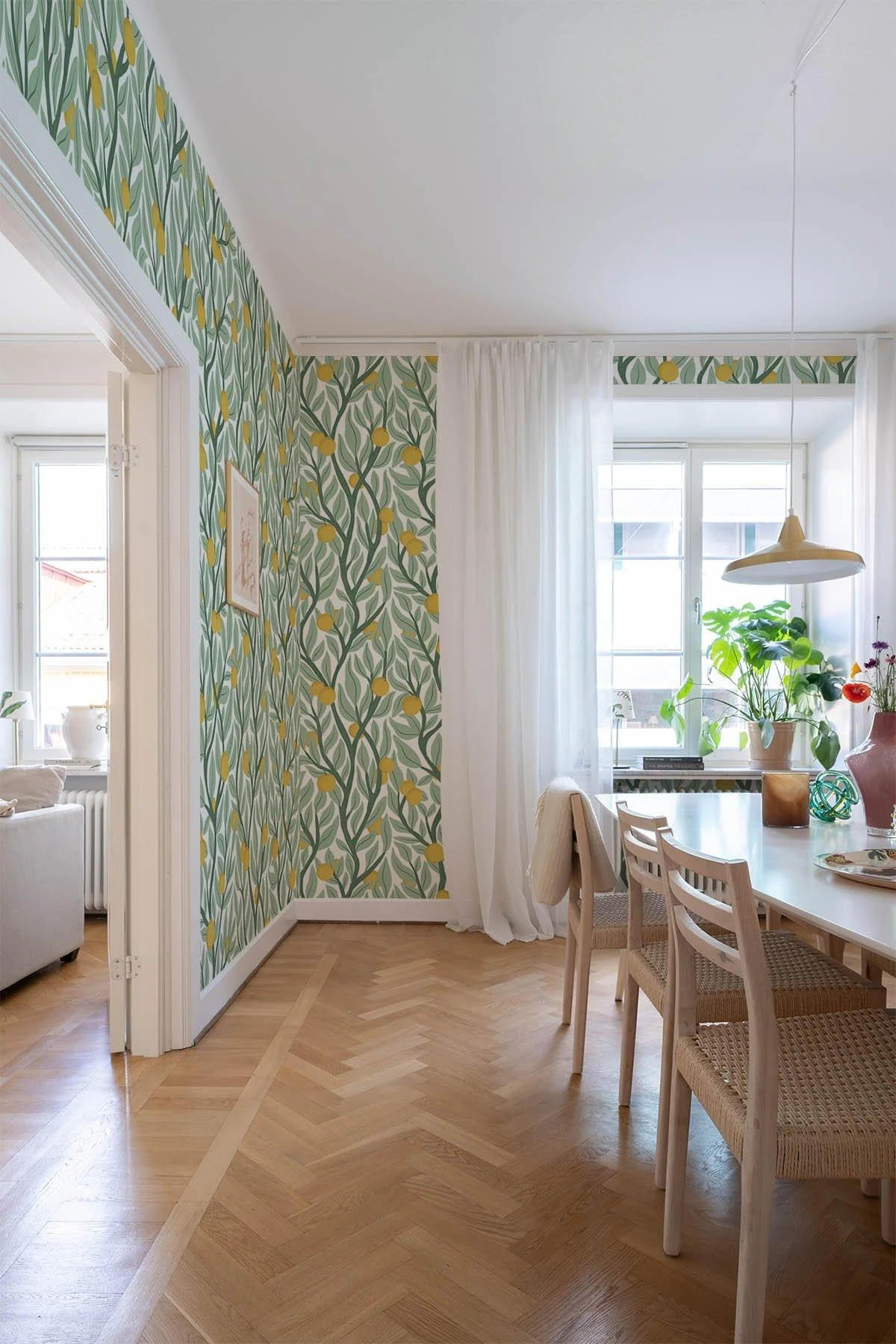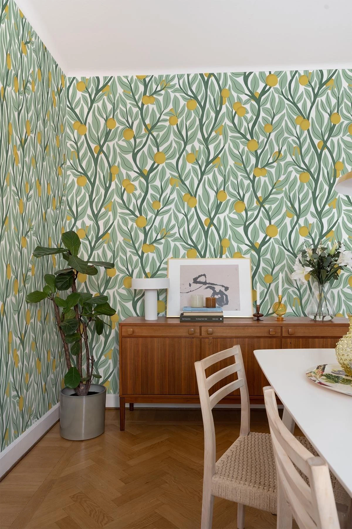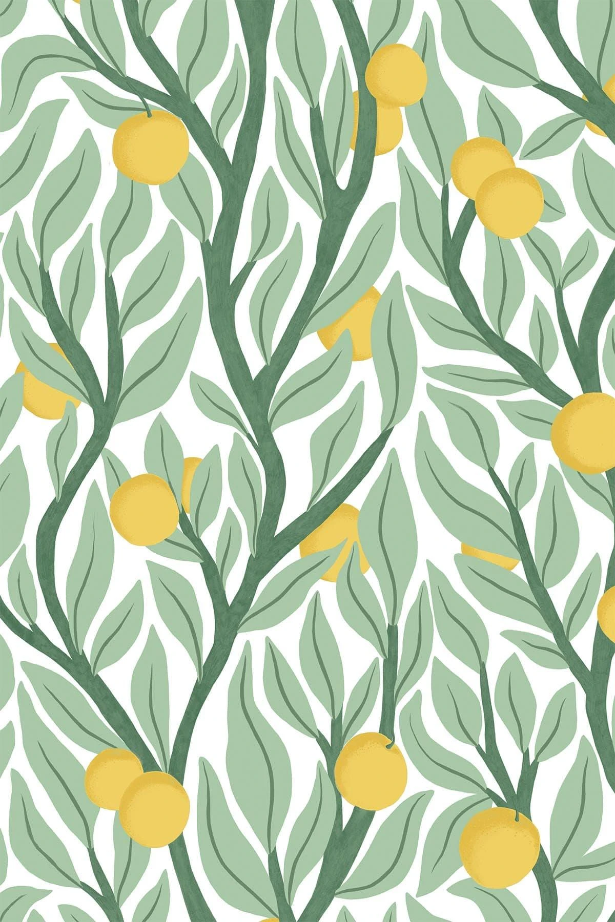 Winding branches with leaves and citrus finds its way from floor to ceiling. The bright colors and complex but balanced repeat gives the design a nostalgic touch.