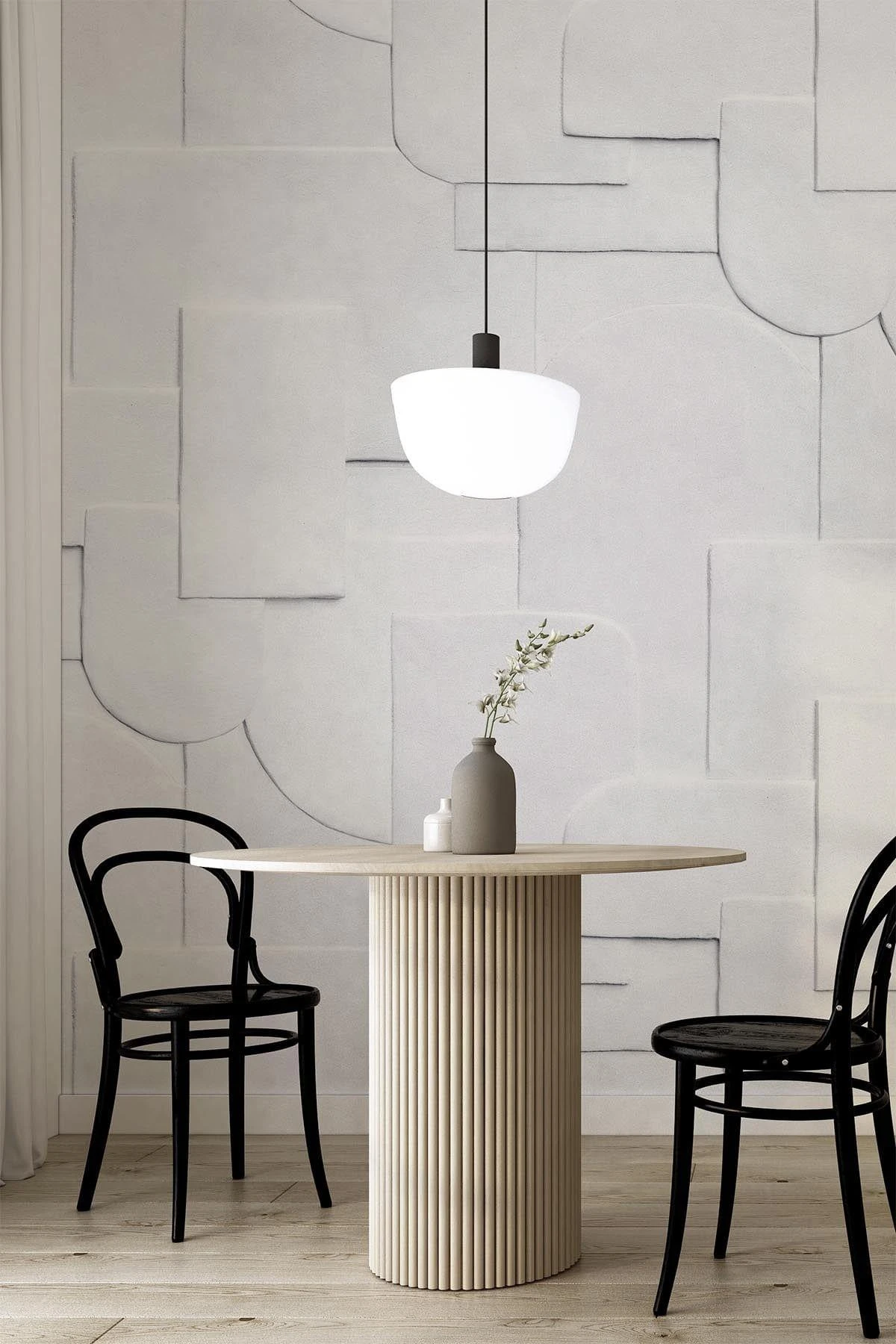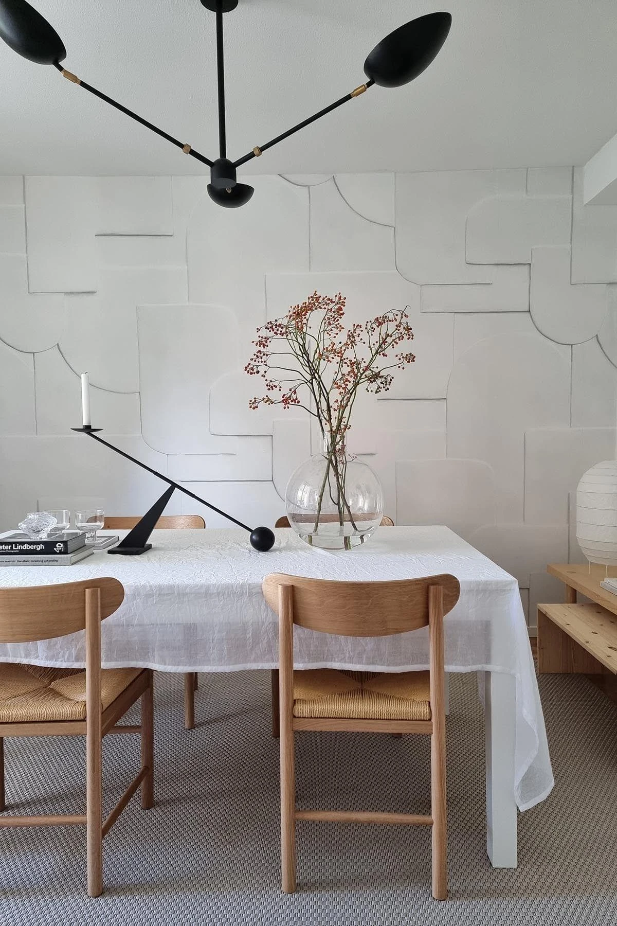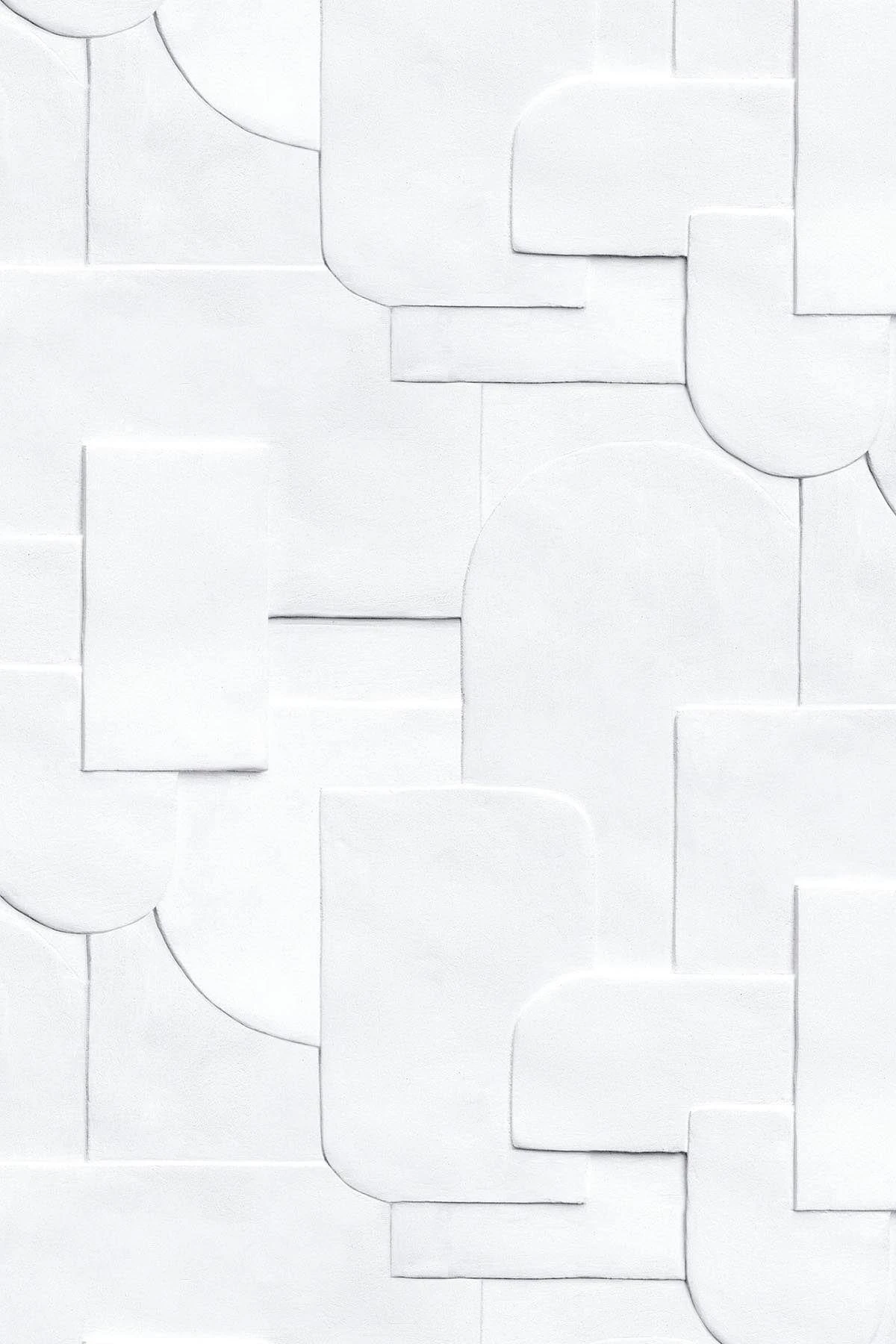 This white wall mural is created by hand from layers of clay in various shapes and depths, creating the perfect 3D illusion. The pattern brings out the geometrical asymmetry and truly embraces the wabi sabi point of view and accepts the beauty that is found in the imperfection. This Japandi inspired clay art with a focus on aesthetics and simplicity is a true timeless wall mural. Note: This is wallpaper with a visual 3D look printed on flat non woven paper.
