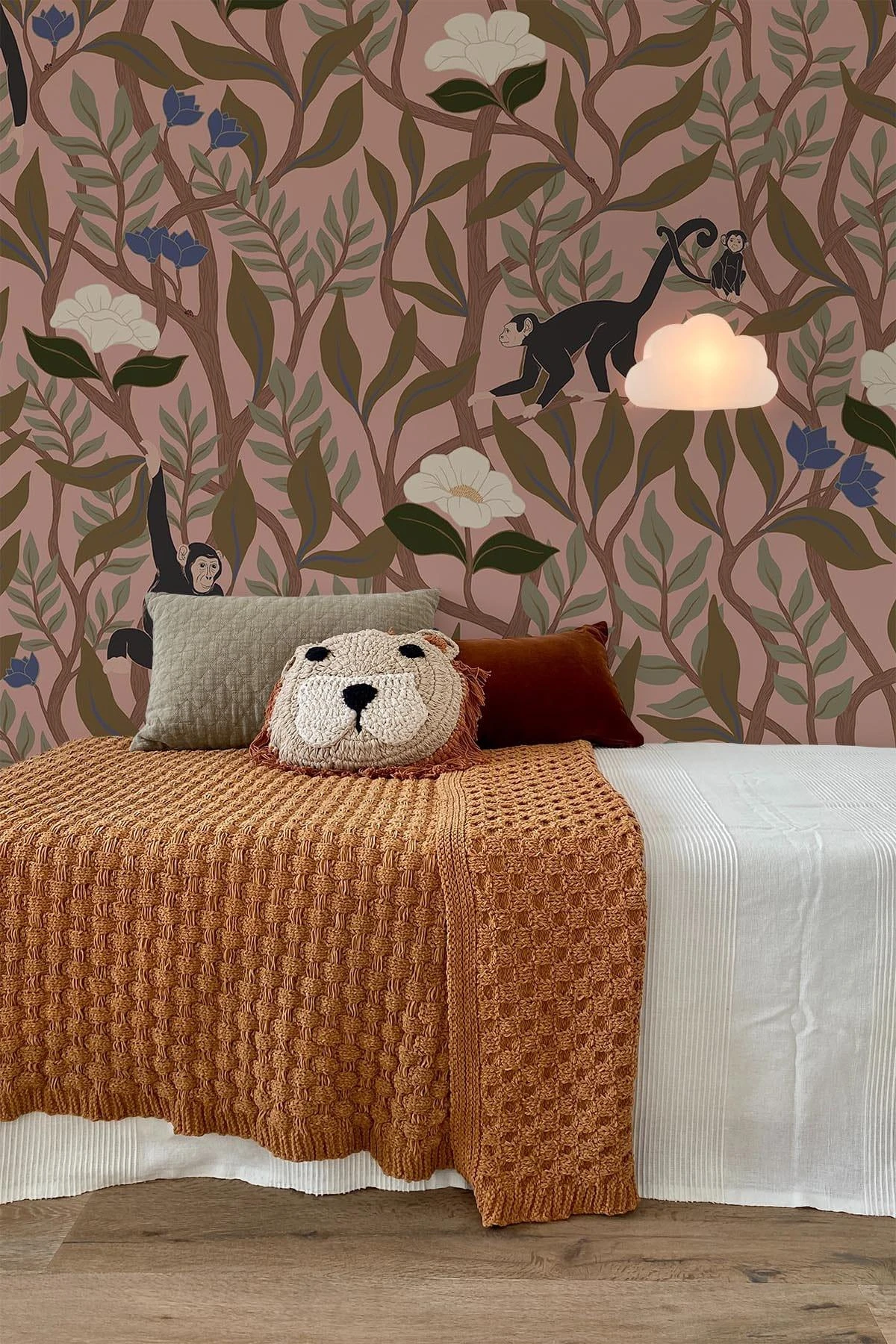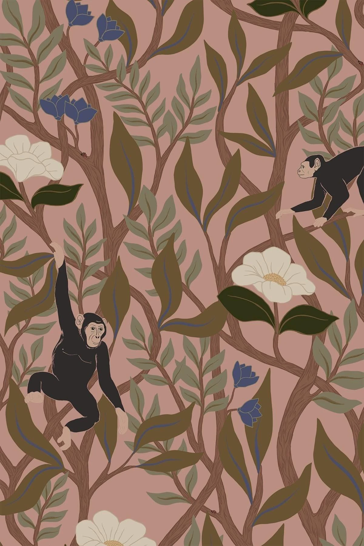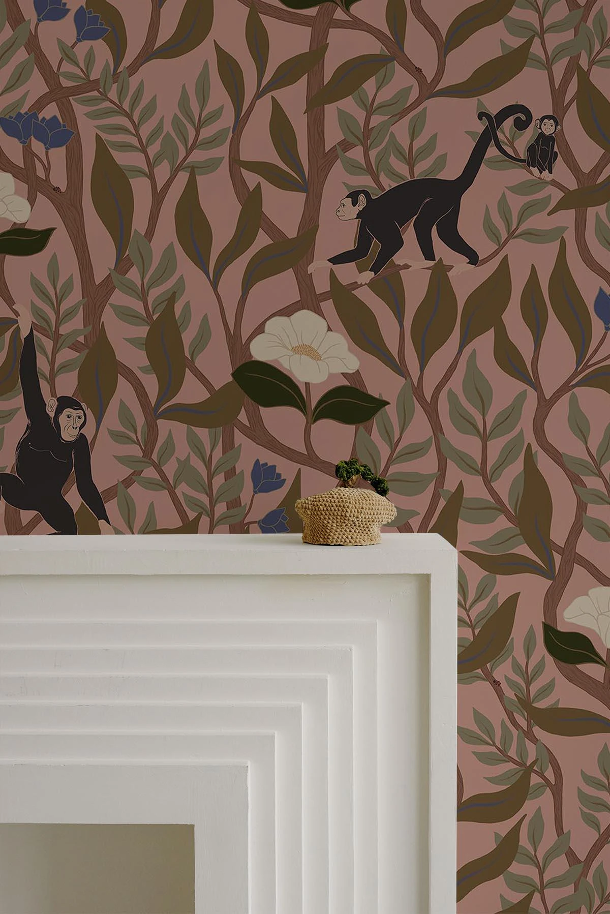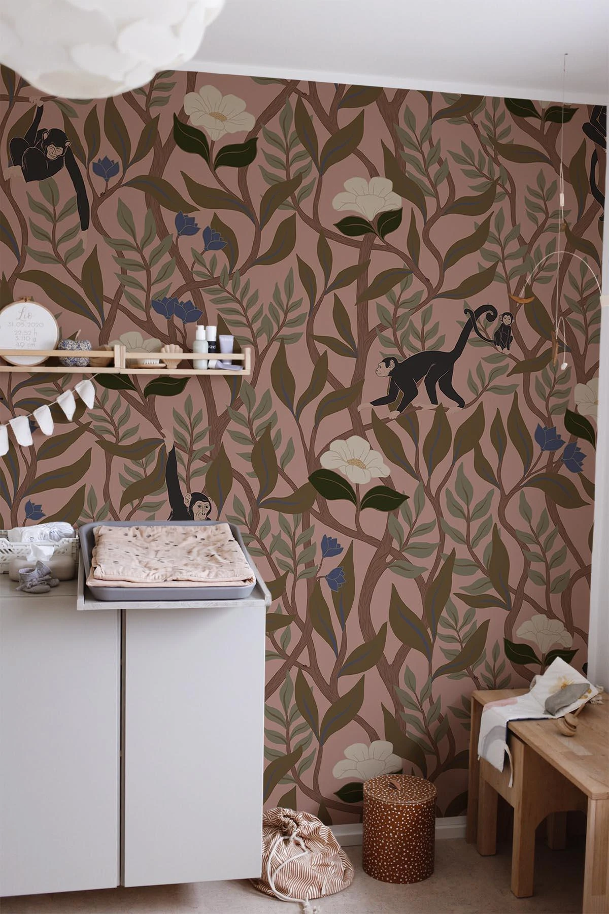 A repeated pattern with monkeys, leaves and various flowers climbing up towards the ceiling. How many monkeys are hiding in this jungle inspired landscape?