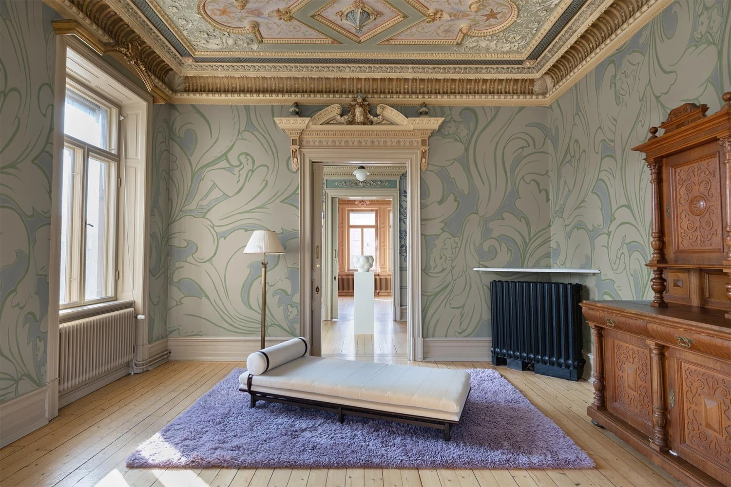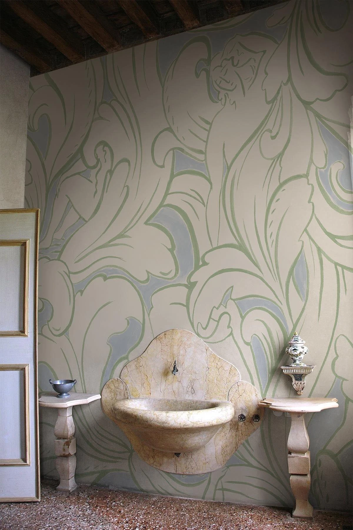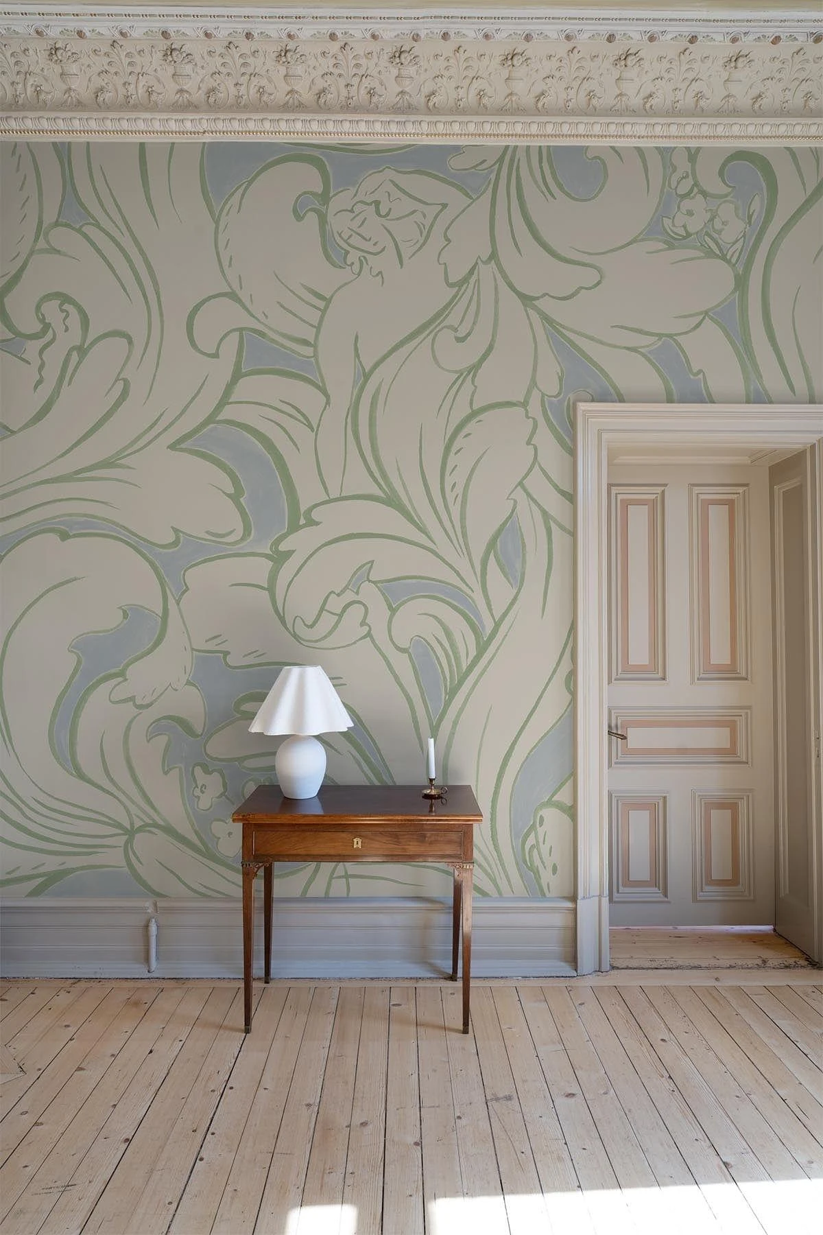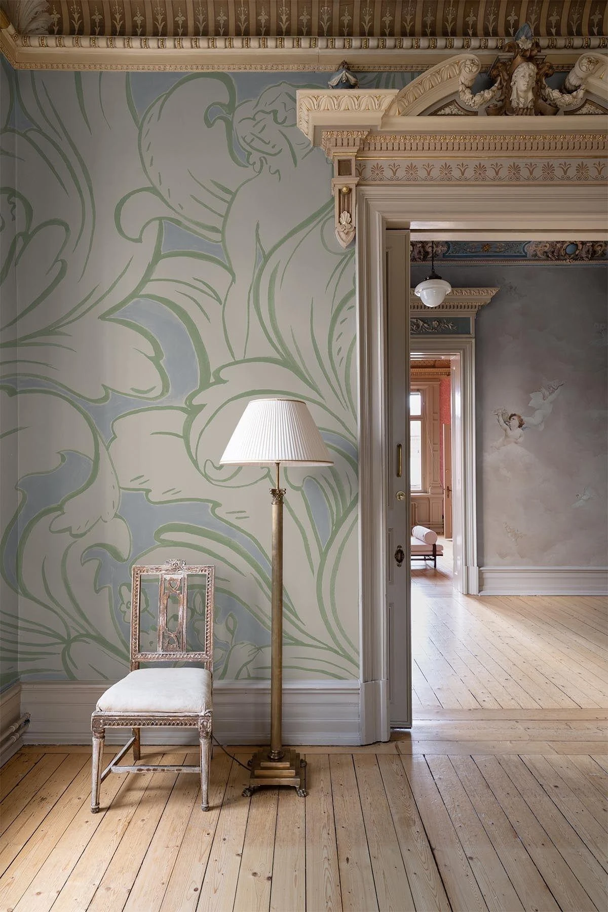 Contemporary Ornament is inspired by the old world nobility meets cutting edge design. This blue color is a new fresh take of the damask wall murals often seen in Italian palaces back in the days. This time we have scaled it up and given it a 21th century boldness to it. The ornaments are made of gouache that adds a soft structure. The range of colors in this vibrant design gives space to achieve your very own Italian escape. Combine this with contemporary interior and the perfect match is made.