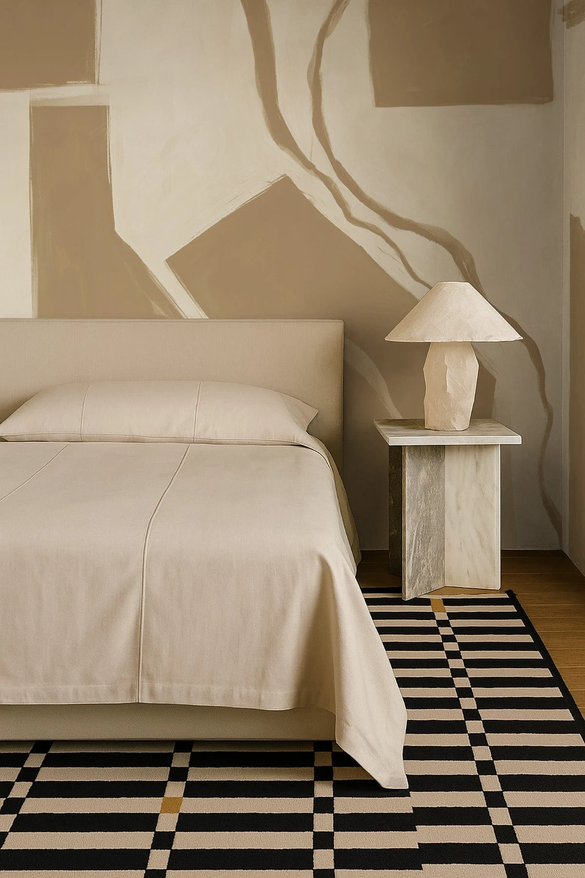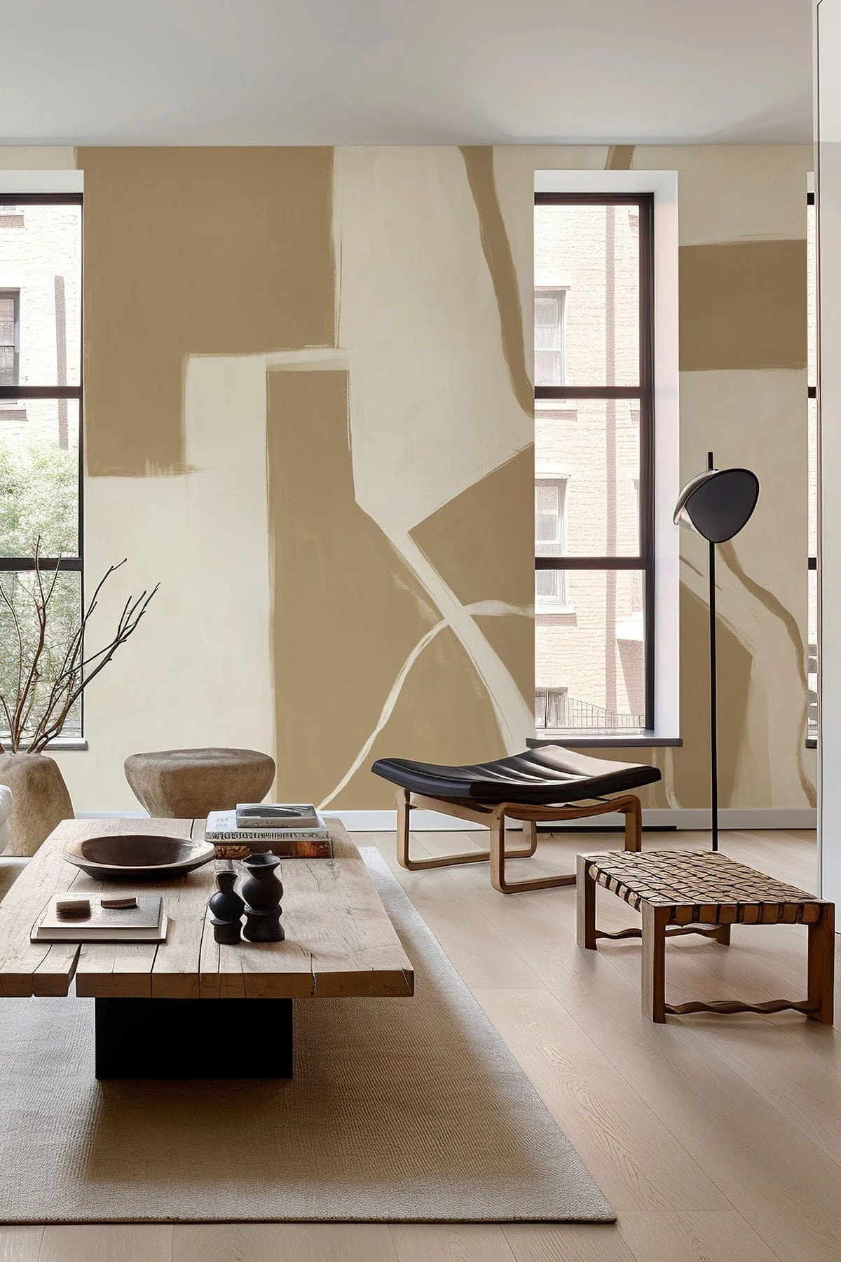 Soft and sculptural, Contrast Art – Stone brings together abstract brushstrokes and geometric elements in a warm, sandy palette. The hand-painted forms, in earthy beige and stone tones, evoke the quiet strength of Scandinavian craftsmanship. This wall mural feels organic yet precise. Perfect for interiors where texture, balance, and artistic calm are key. A grounded design with expressive depth.