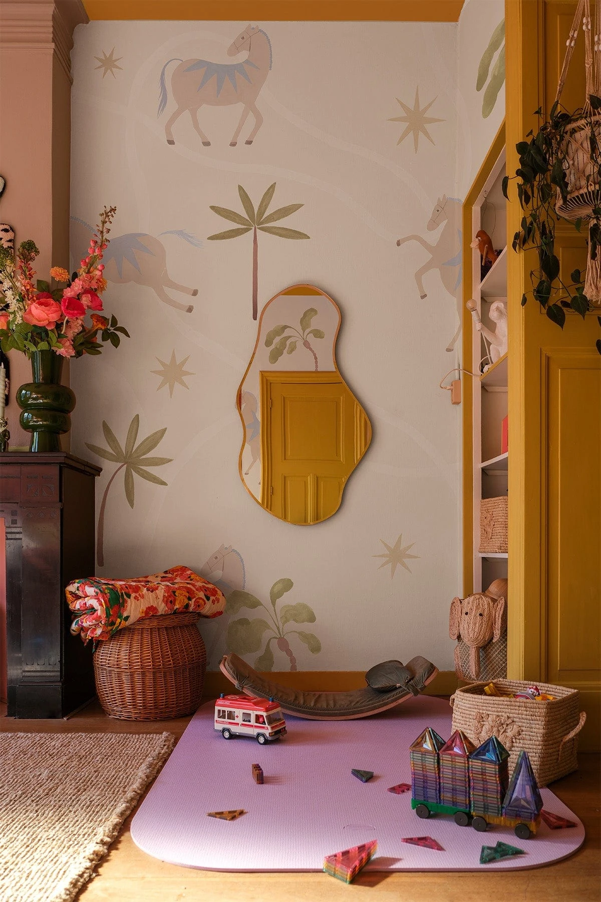 A joyful daydream on a sunlit beige base. Dream of Horses Multi features pink carousel horses and swinging palm trees in motion, inviting the imagination to wander. Hand-painted with visible stroke lines in gouache, the mural captures a playful, whimsical spirit. Designed for the nursery or kids room, it’s a light-hearted backdrop where stories begin and every day feels a little magical.