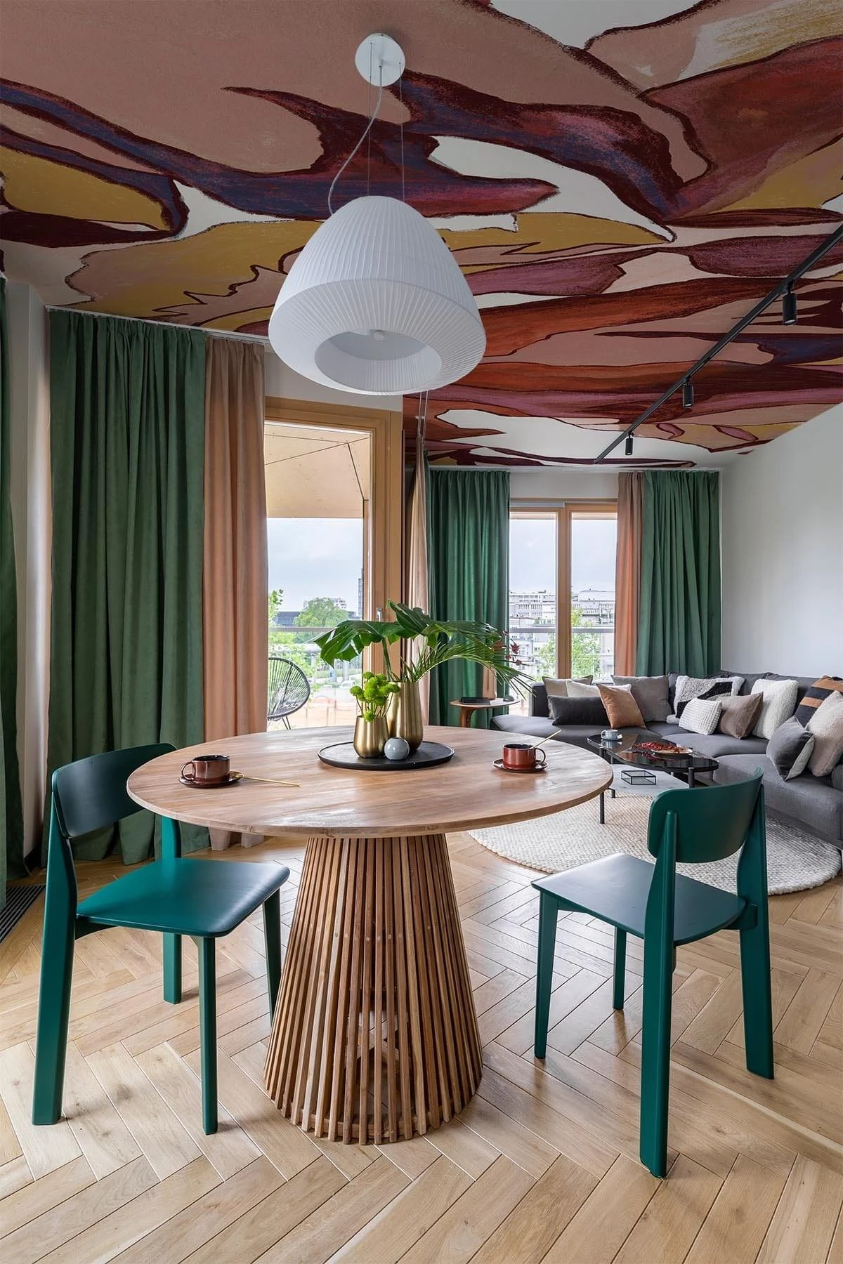 Eclectic Art in red is a bold, artistic pattern full of energy and movement, where bold art meets urban contemporary and magic is created. This colorful wall mural art is hand painted in mixed media, gouache and crayons and gets it´s uniqueness from the scale. Why not use this design on your ceiling, it’s totally mind blowing.