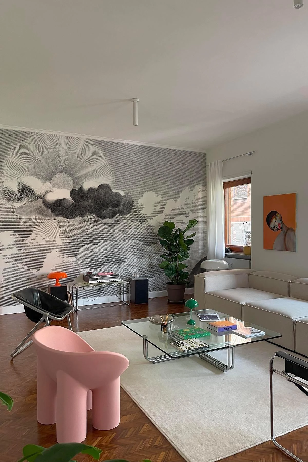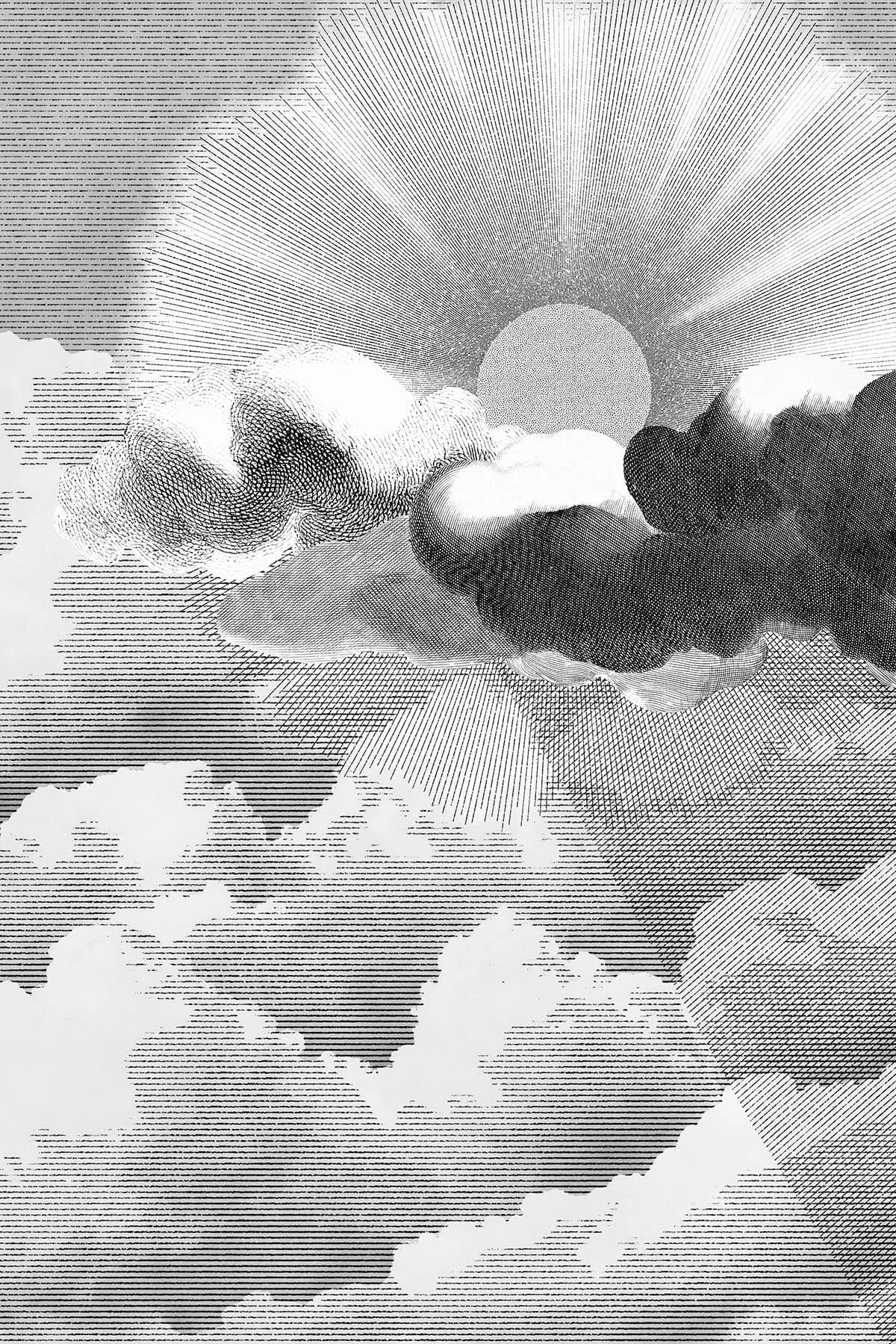 A landscape in the clouds, Engraved Sunscape is inspired by classical line engraving of the 18th and 19th centuries. Meticulously detailed lines give this wallpaper a soft tonal effect as fluffy clouds dance across the horizon, and the sun serves as the shining centerpiece of this heavenly design. This wall mural will elevate the atmosphere of your room, and is perfect for anyone who wants to adorn their walls with a blend of classic artistry and modern design.