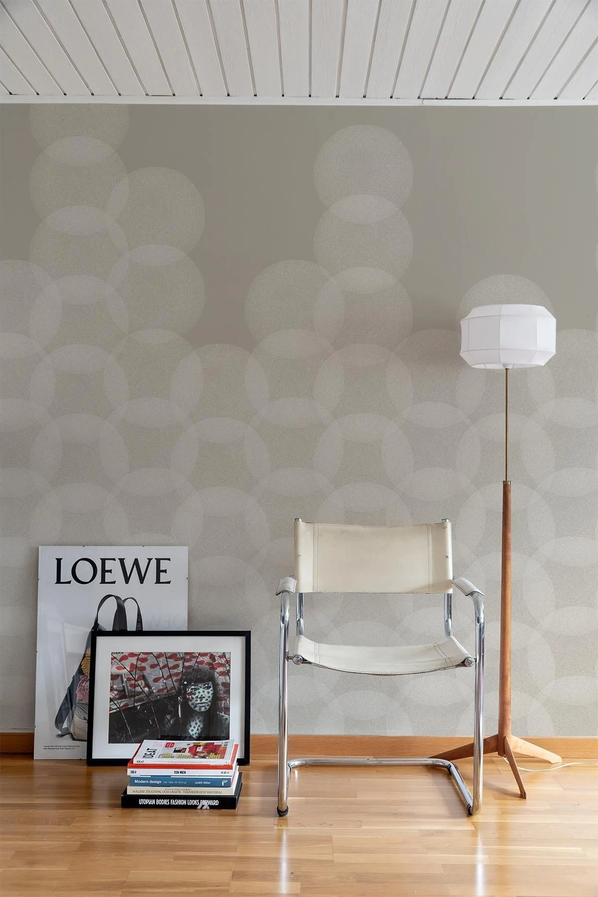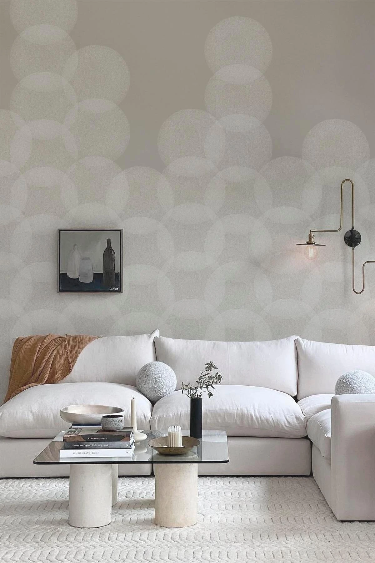 Structured circles lined up from floor to ceiling creating a subtle yet modern look. The irregularity and overlap creates depth and makes this beige design unique.
