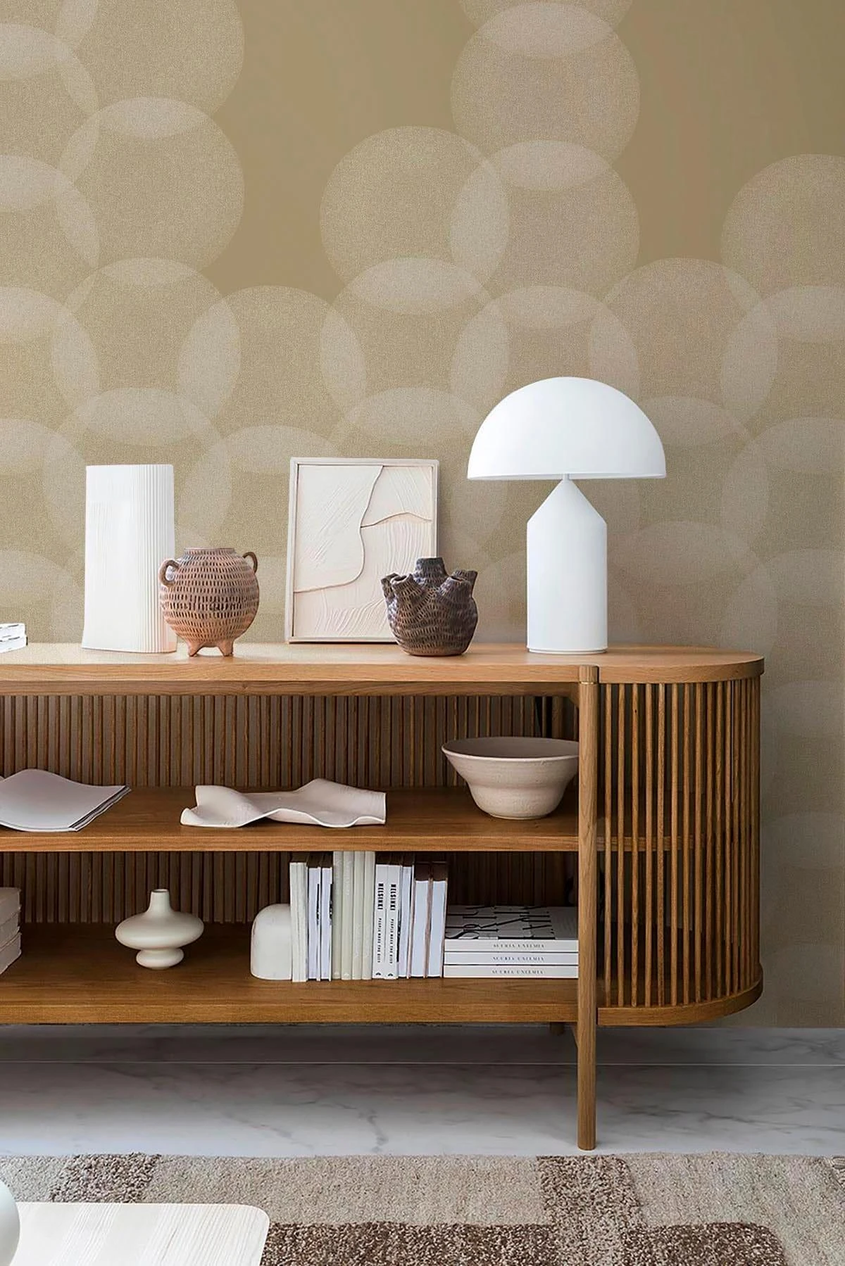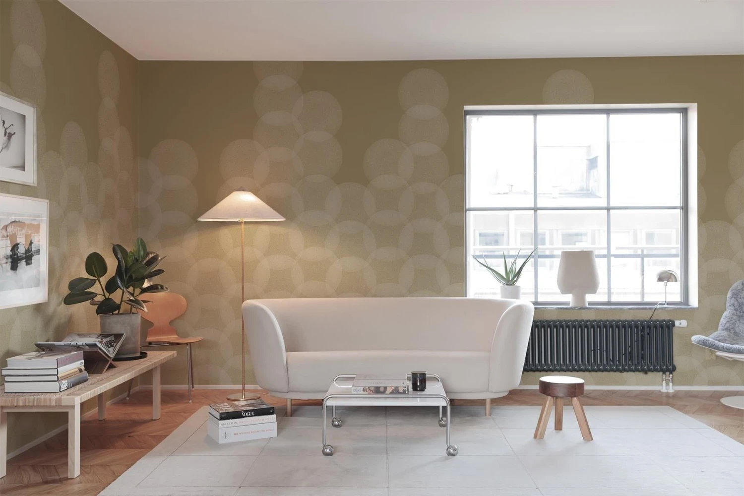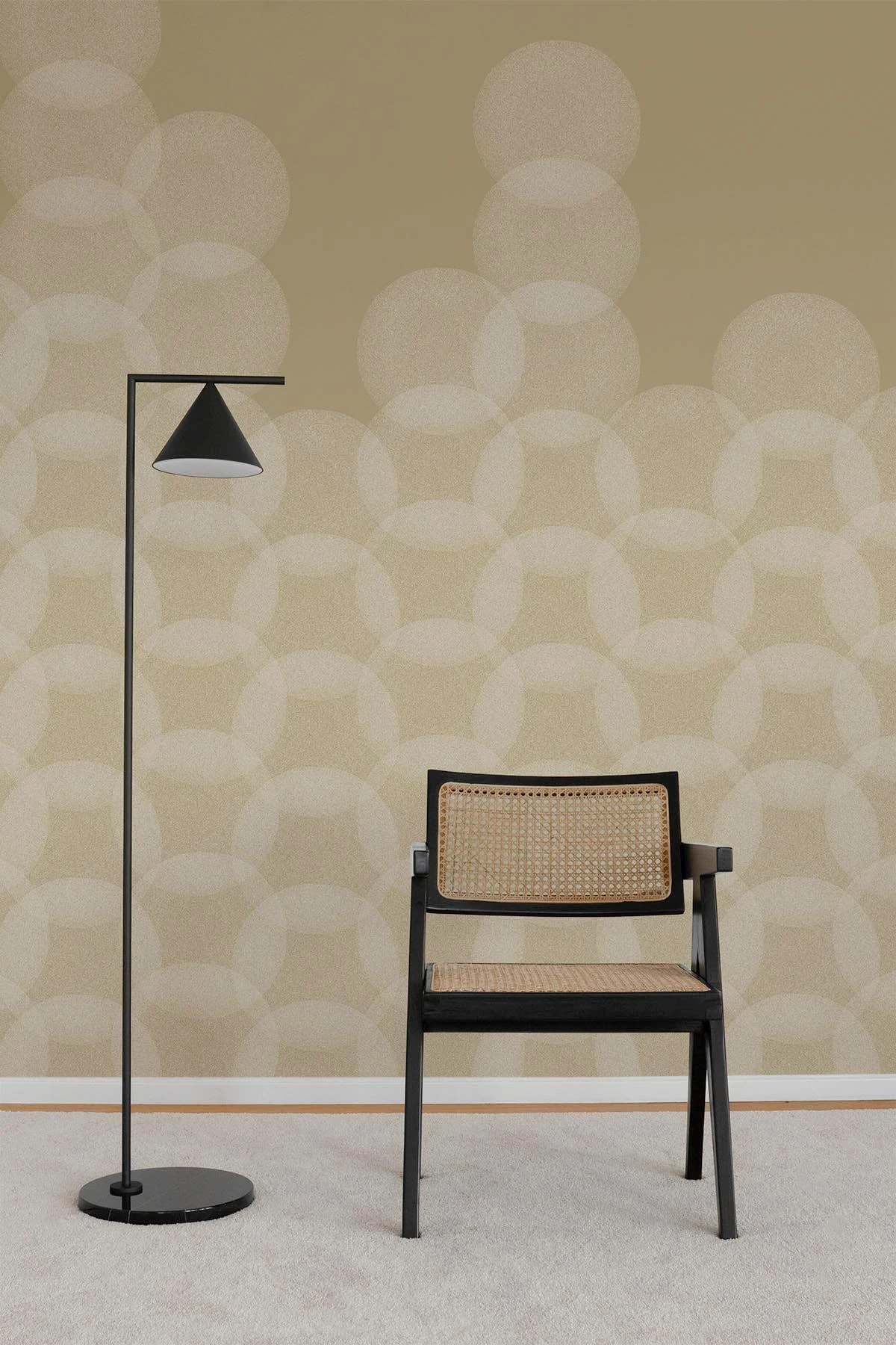 Structured circles lined up from floor to ceiling creating a subtle yet modern look. The irregularity and overlap creates depth and makes this yellow design unique.
