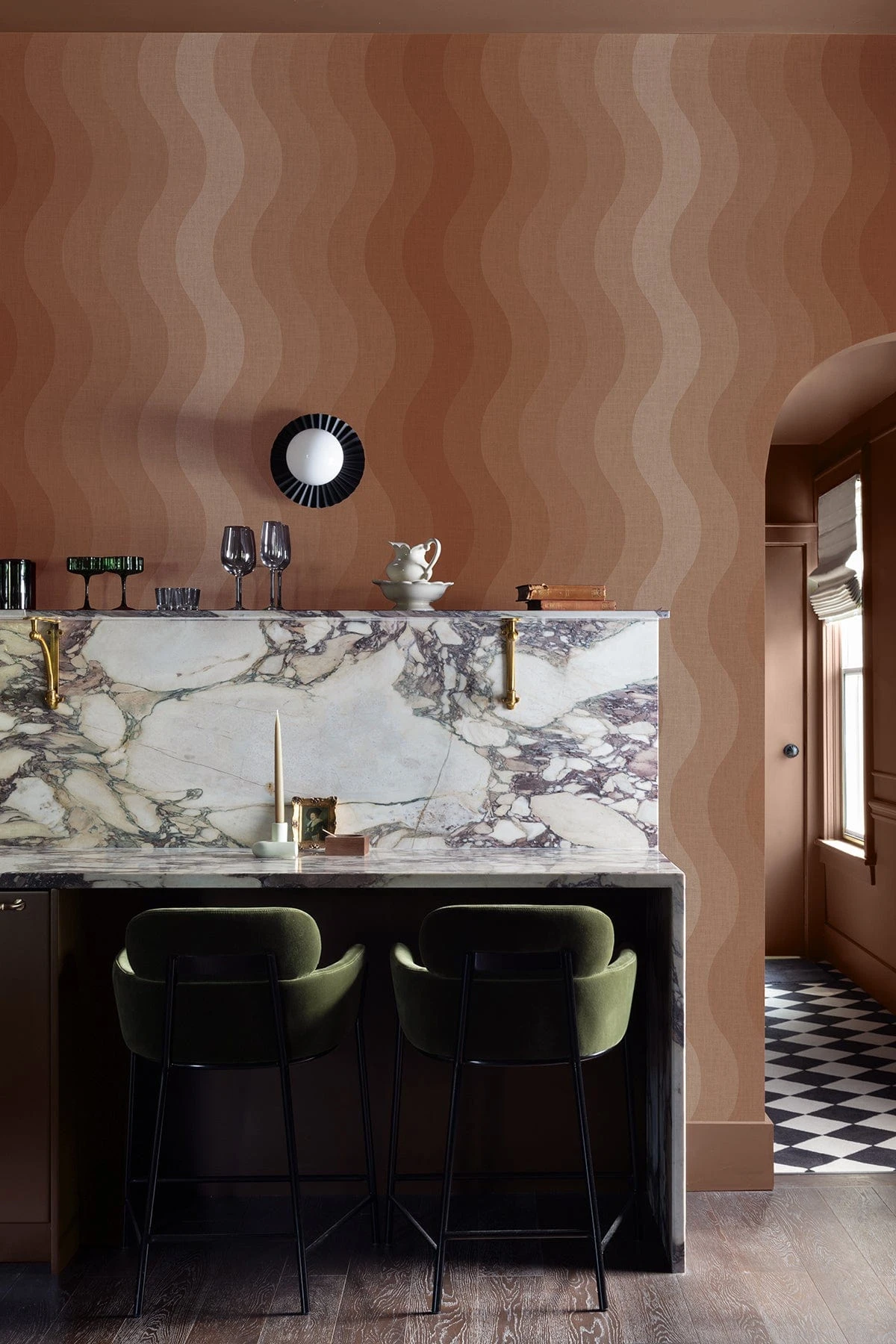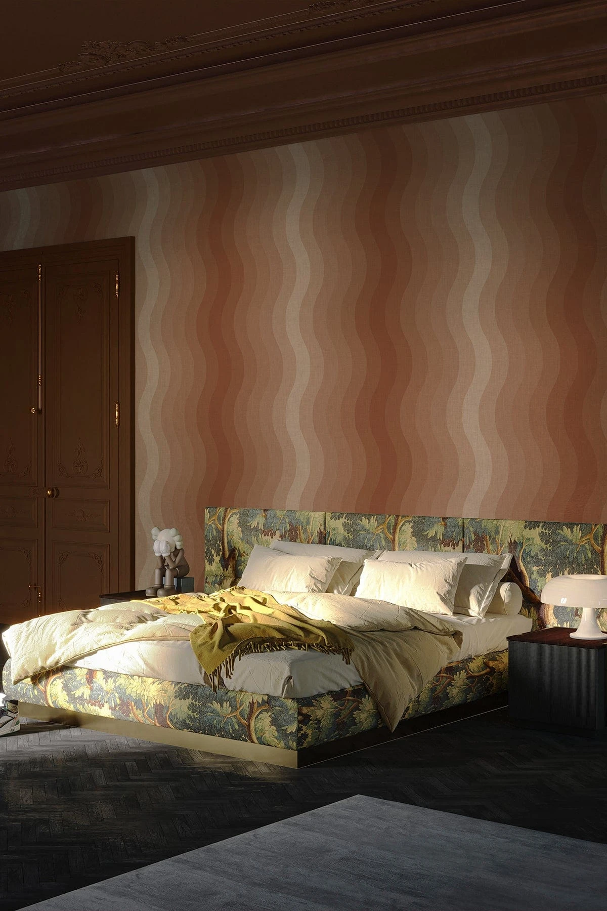 This bold, eye-catching wall mural is a homage to maximalist interior decor. A tonal multi stripe in a deep terracotta colorway. The perfect substitute for a plain color to cover all walls in a room.
