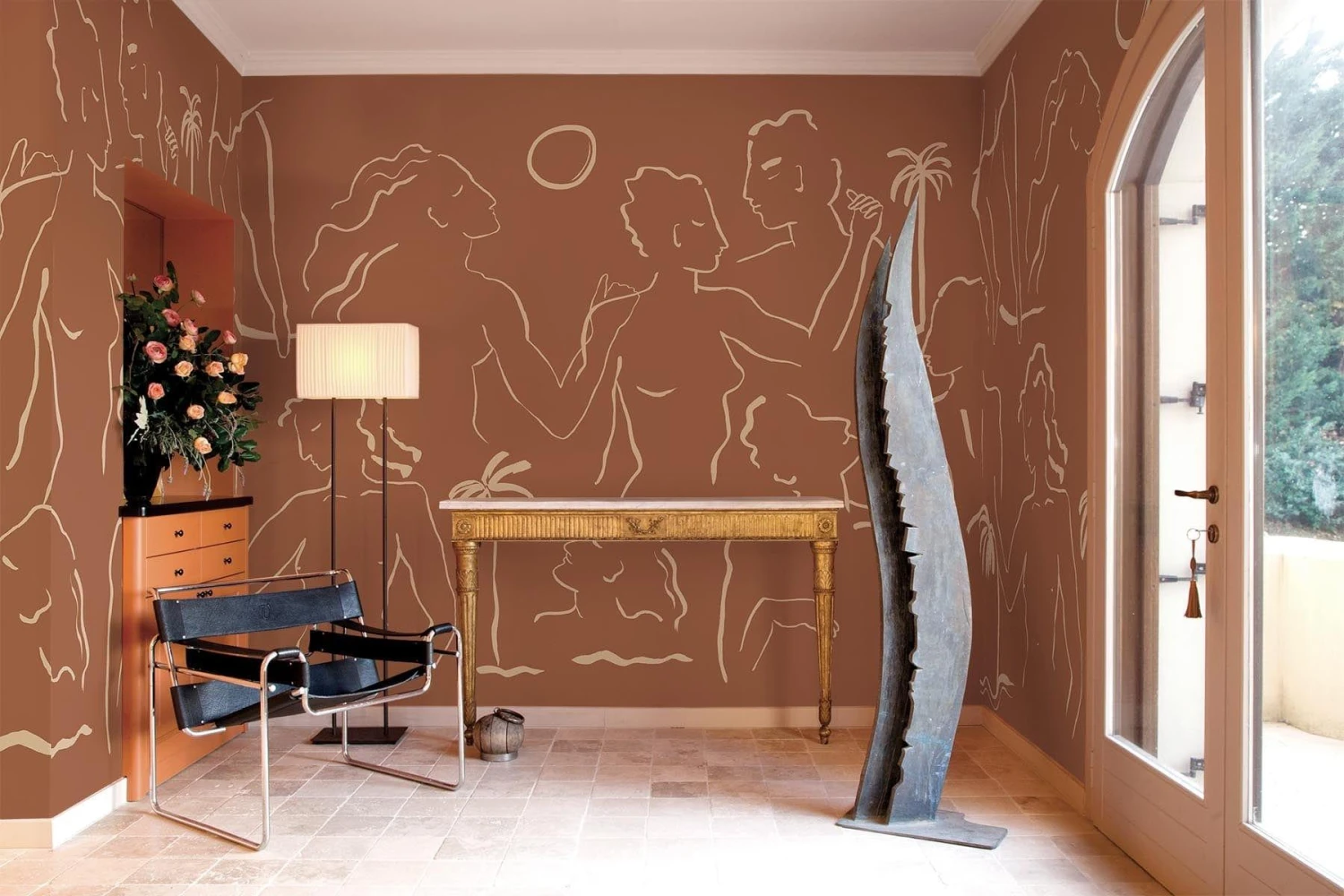 Floating bodies in rusty red evokes feelings of freedom and a sense of airiness through an elevated sense of artistry and uniqueness with its big scale. The design is developed through painted lines with a wide brush which creates a stunning sketchy feeling. With inspiration from the colorful Chateau´s on the airy coastline of Provence, this hand-painted wall mural features body shapes in a balanced rhythm. This artistic wall mural is the most minimalistic design in the collection and can be used in both a more neutral interior as well as in a bold and colorful one. Transform your living room, bedroom or powder room with this versatile design. Floating bodies in warm colors is suitable for any space and come in three colorways.