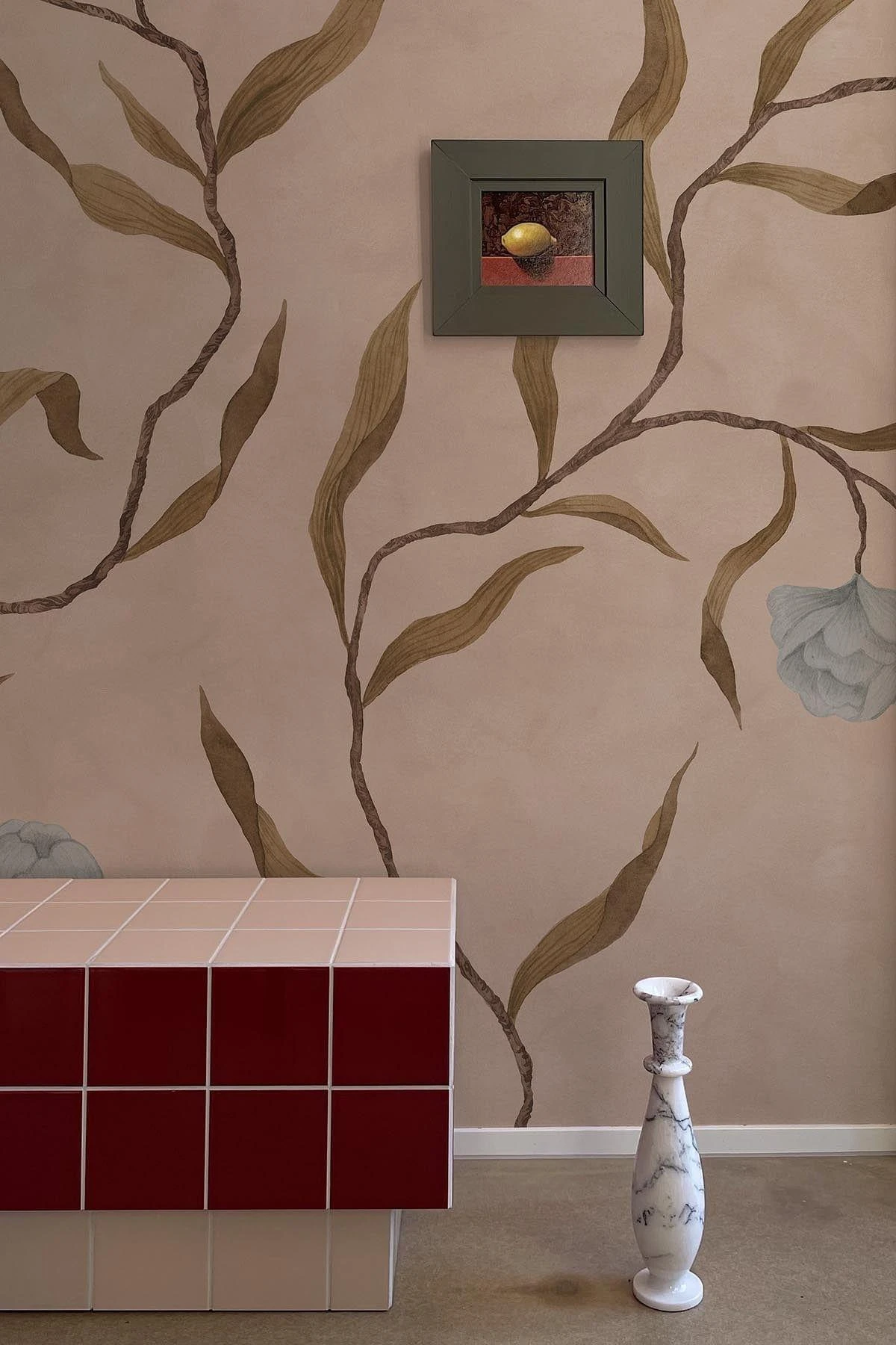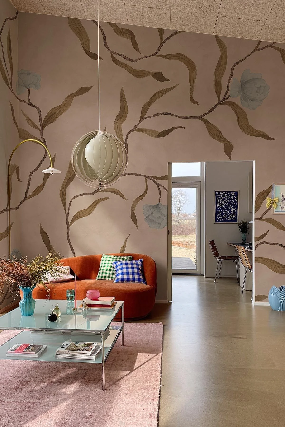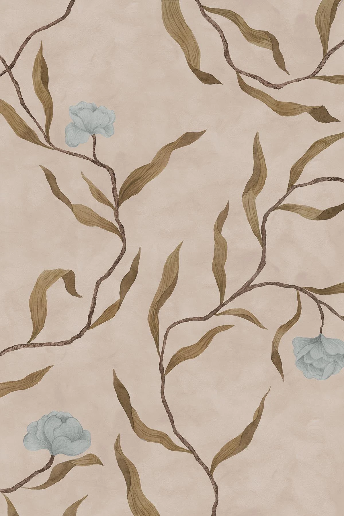 The simplicity of a climbing flower branch captured in a wallpaper. Hand-painted details from the flower petals, the bark of the twig to the different hues of green leaves. A simple and eye-catching big scaled floral wallpaper with a neutral color scheme, that captures your interest as soon as you step into the room.