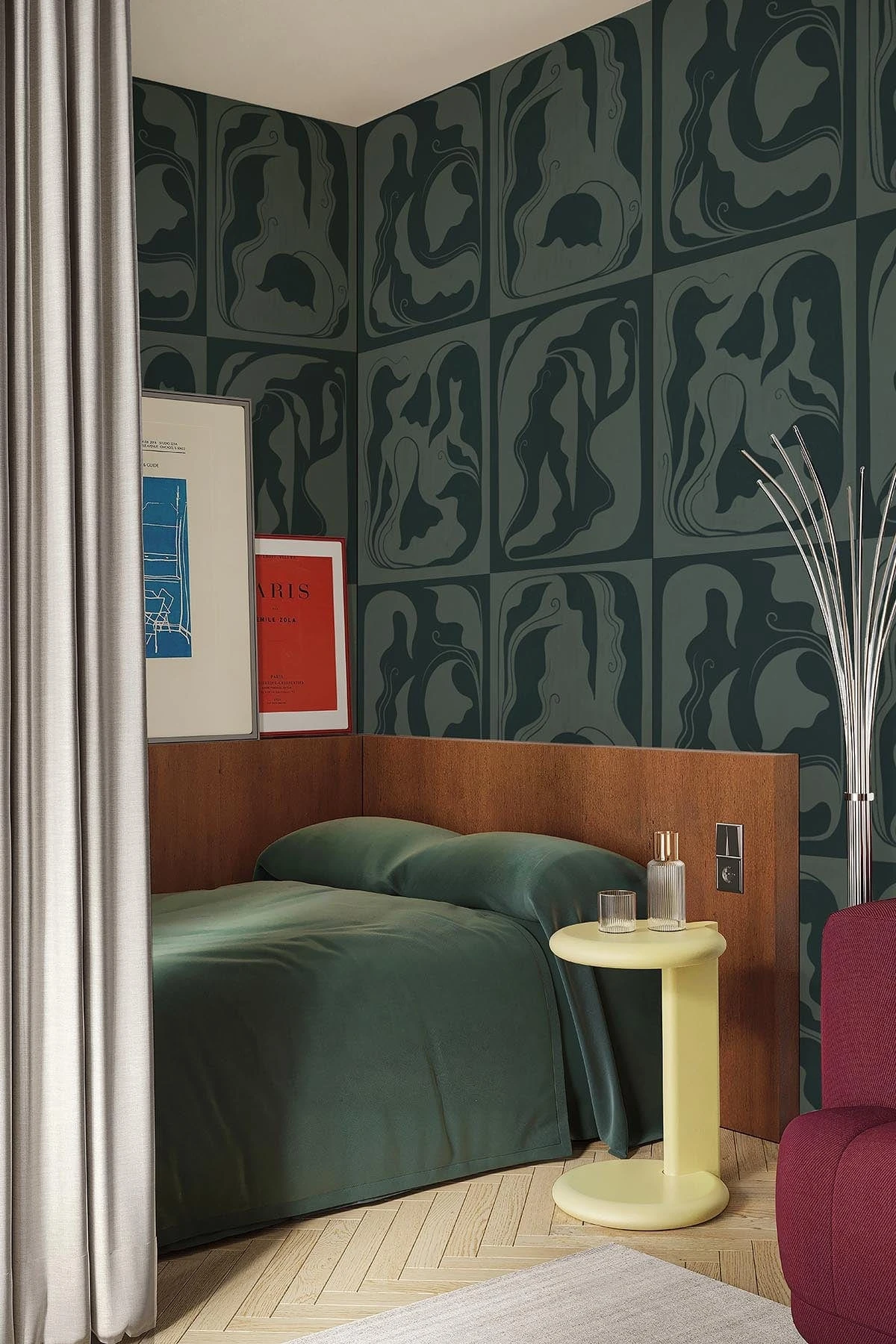 Bring a serene and modern vibe to your space with the Flower Silhouette wall mural in Teal. Featuring striking botanical-inspired shapes in rich teal tones, this design combines fluid forms with a hint of retro charm. Ideal for creating a statement wall, it adds depth and character to bedrooms, offices, or any contemporary interior.