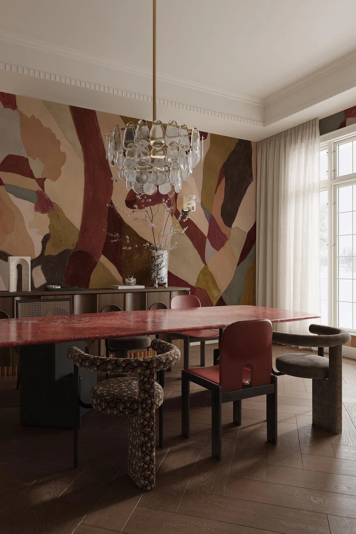 With a dynamic mix of rough brushwork, delicate washes, and aged patina, this design is a celebration of raw materials and painterly depth. It’s a fresh take on classic wall art.