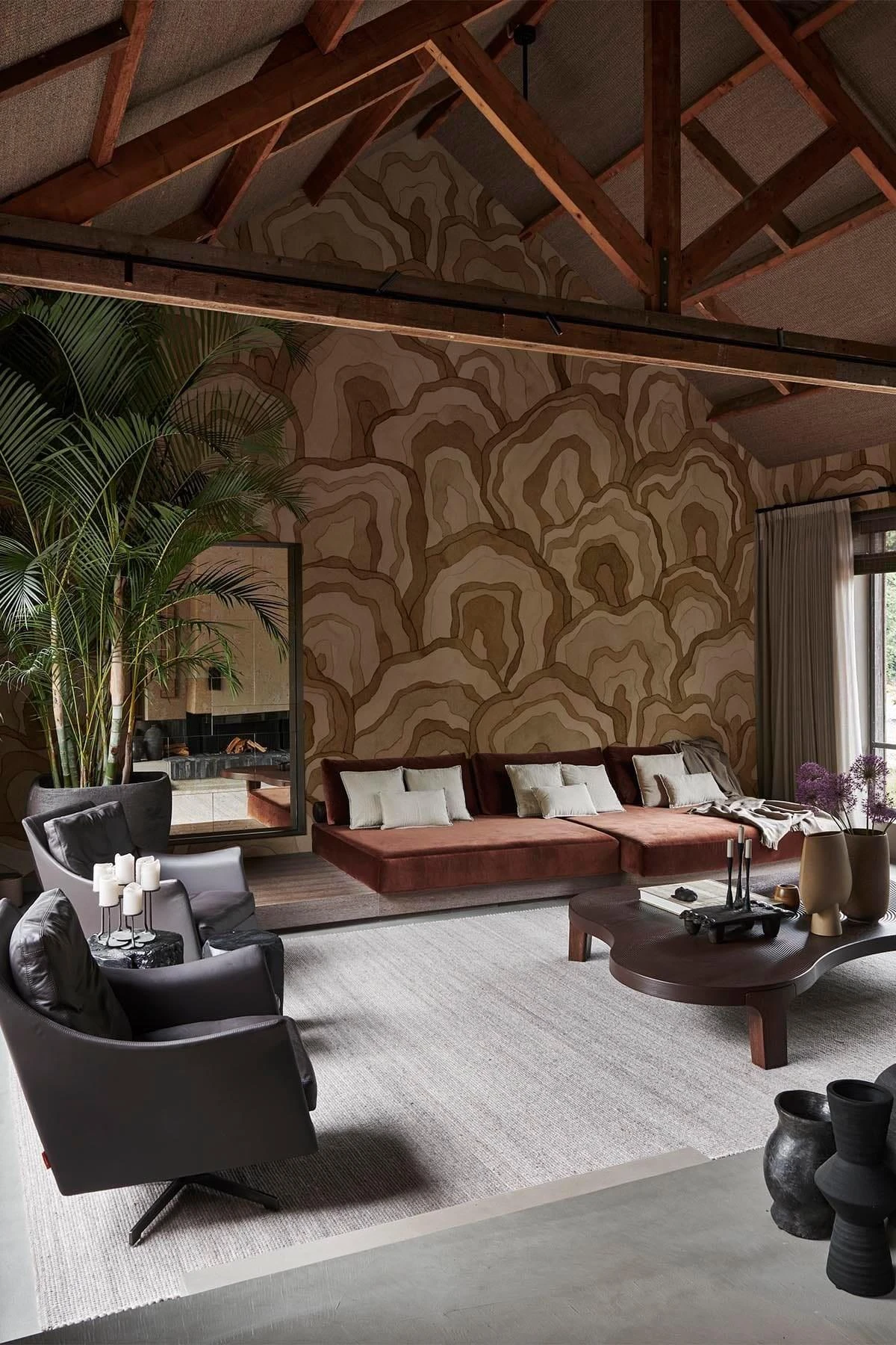 Dark wood tones and rustic details complement the wall murals deep brown shades. Add green plants and textiles in earthy colors like moss green and mustard yellow to create a harmonious and calming ambiance in the room.