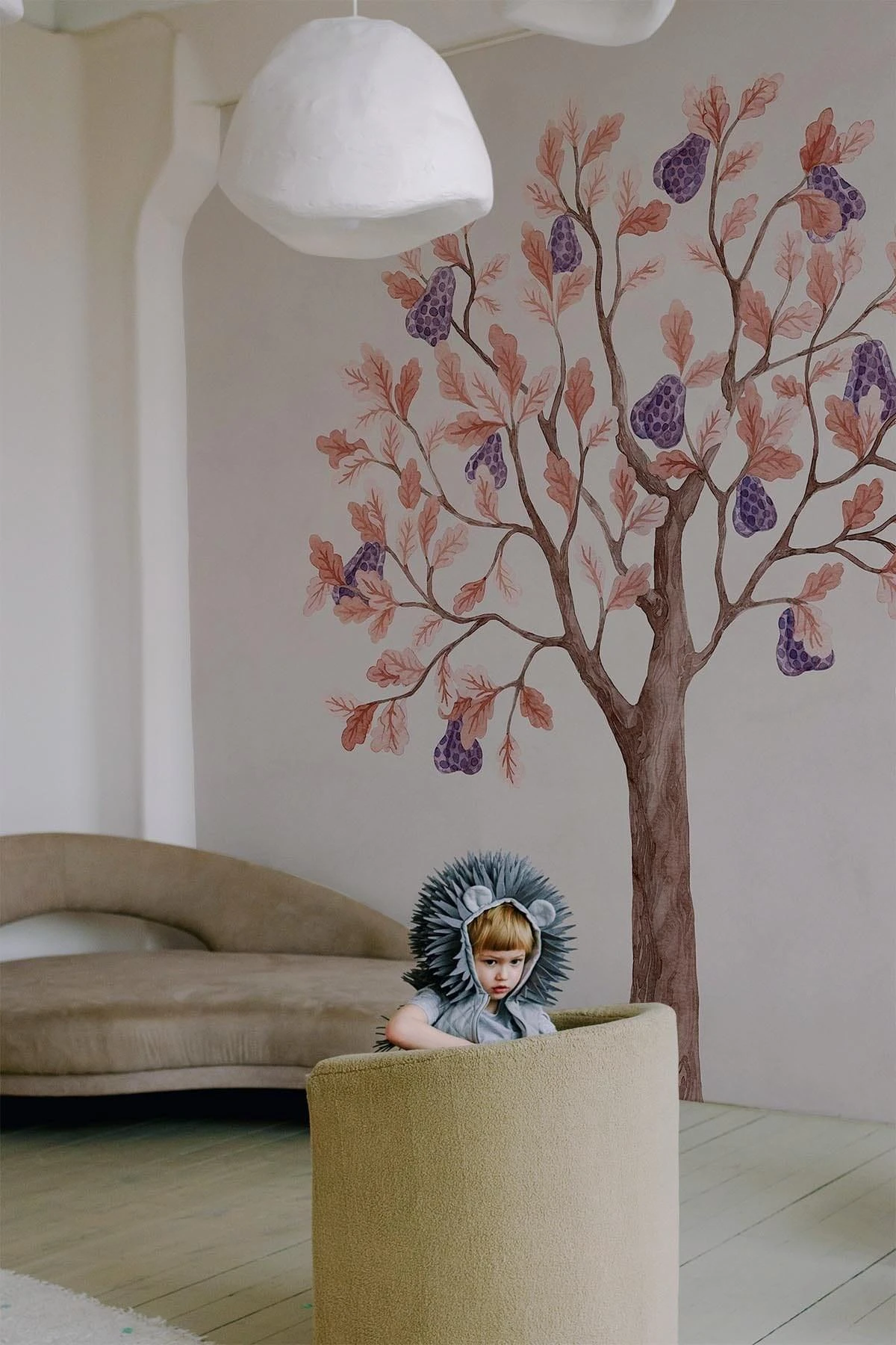 One large tree hand painted as an art piece in aquarelle. Is it an old oak and what kind of fruits is it bearing?