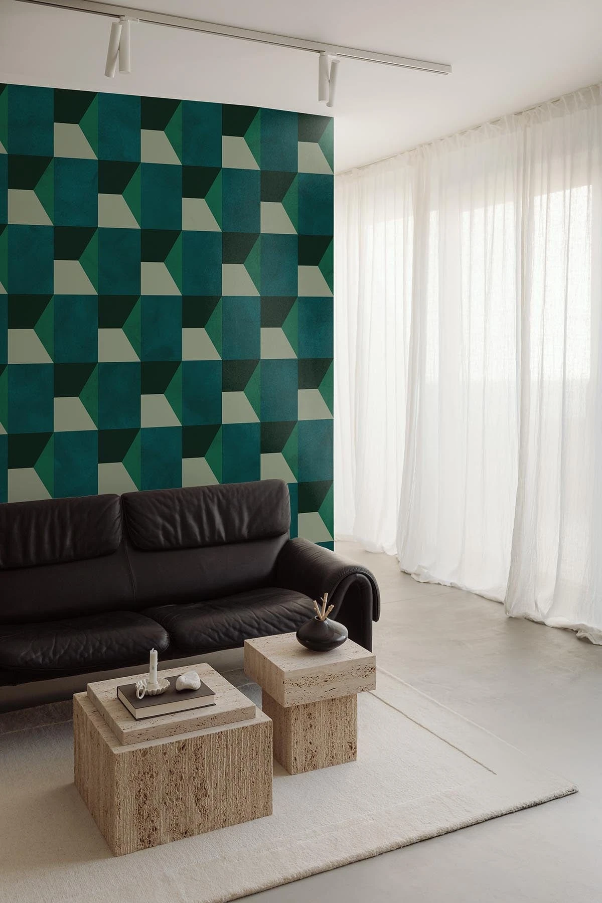 Elevate your space with the Geometric Shades wall mural in emerald green and teal. Inspired by 60s and 70s designs, this mural blends vintage charm with modern sophistication, adding depth and style to any room. Perfect for retro-inspired spaces or as a bold design statement, it brings a unique mix of nostalgia and elegance.