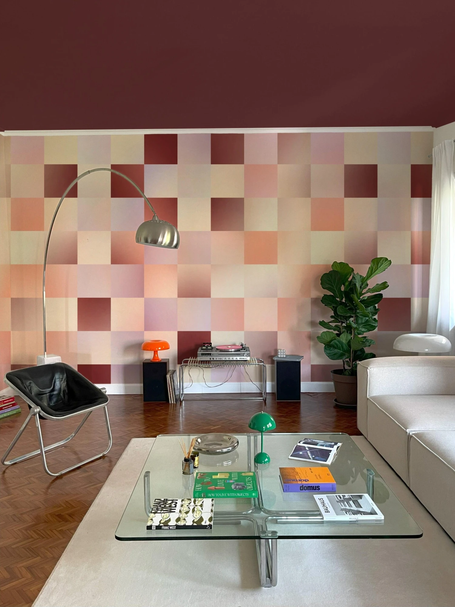 A graphical checked pattern in peach, pink and burgundy tonal colors. A contemporary design suitable for both walls and ceilings.