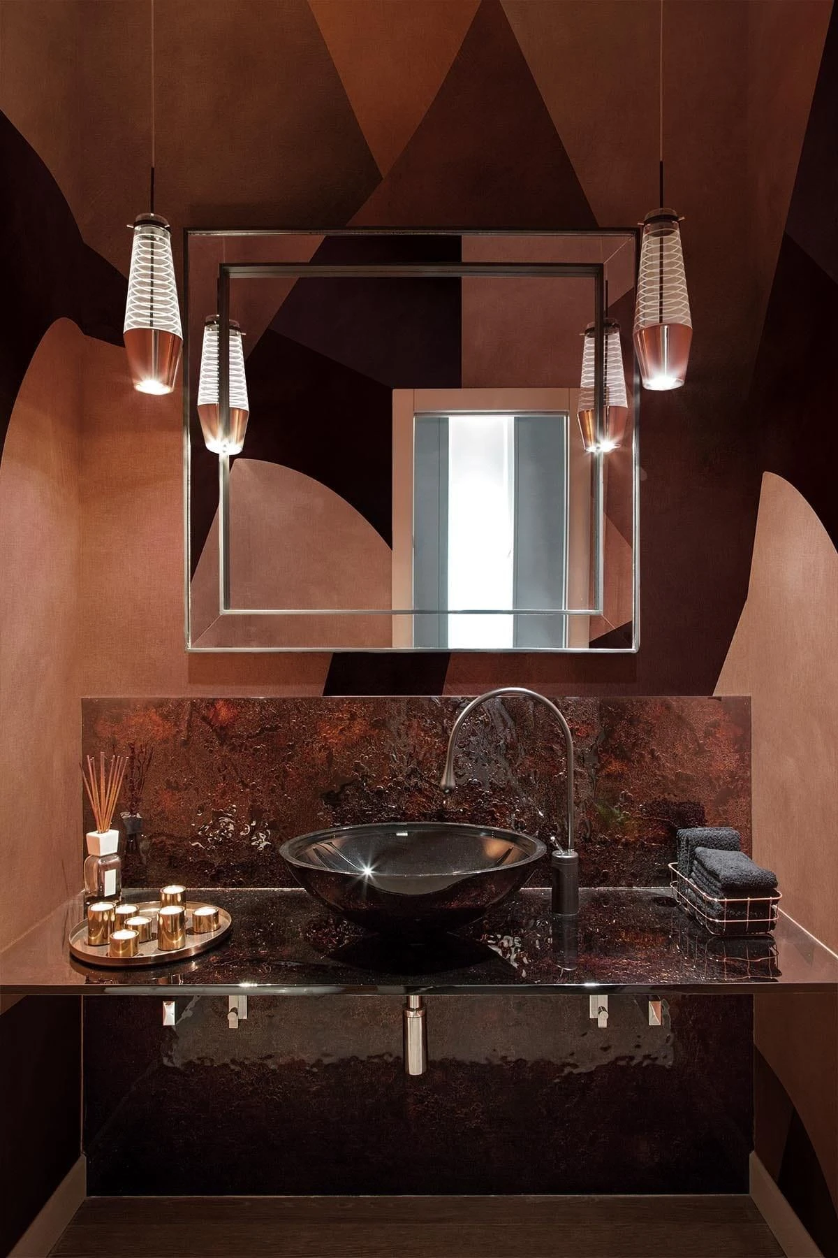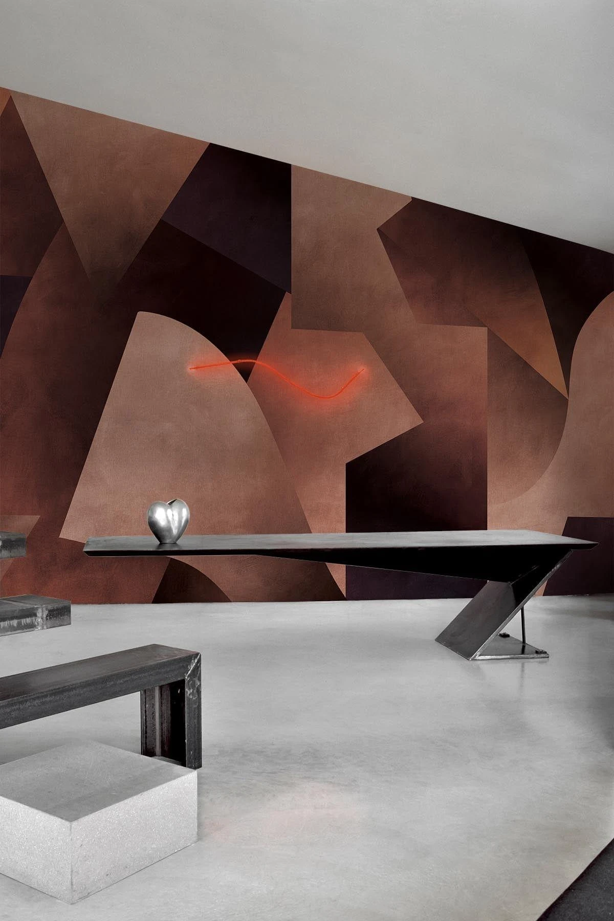 Create another dimension with this geometric design in burgundy, built up by color gradients that forms a dynamic bold statement wall mural. Graphic edges meet gentle gradients. The surface of the wall mural is flat, though it has life and dynamic and is rich in texture. This graphic design comes in two colors.