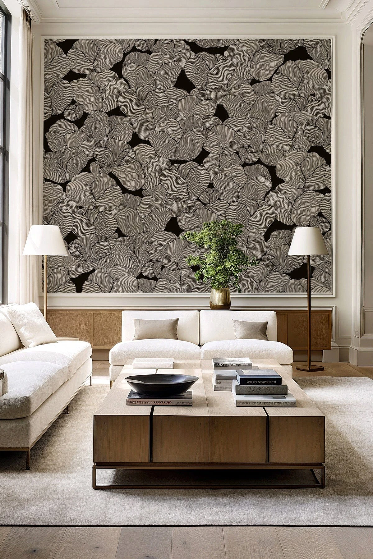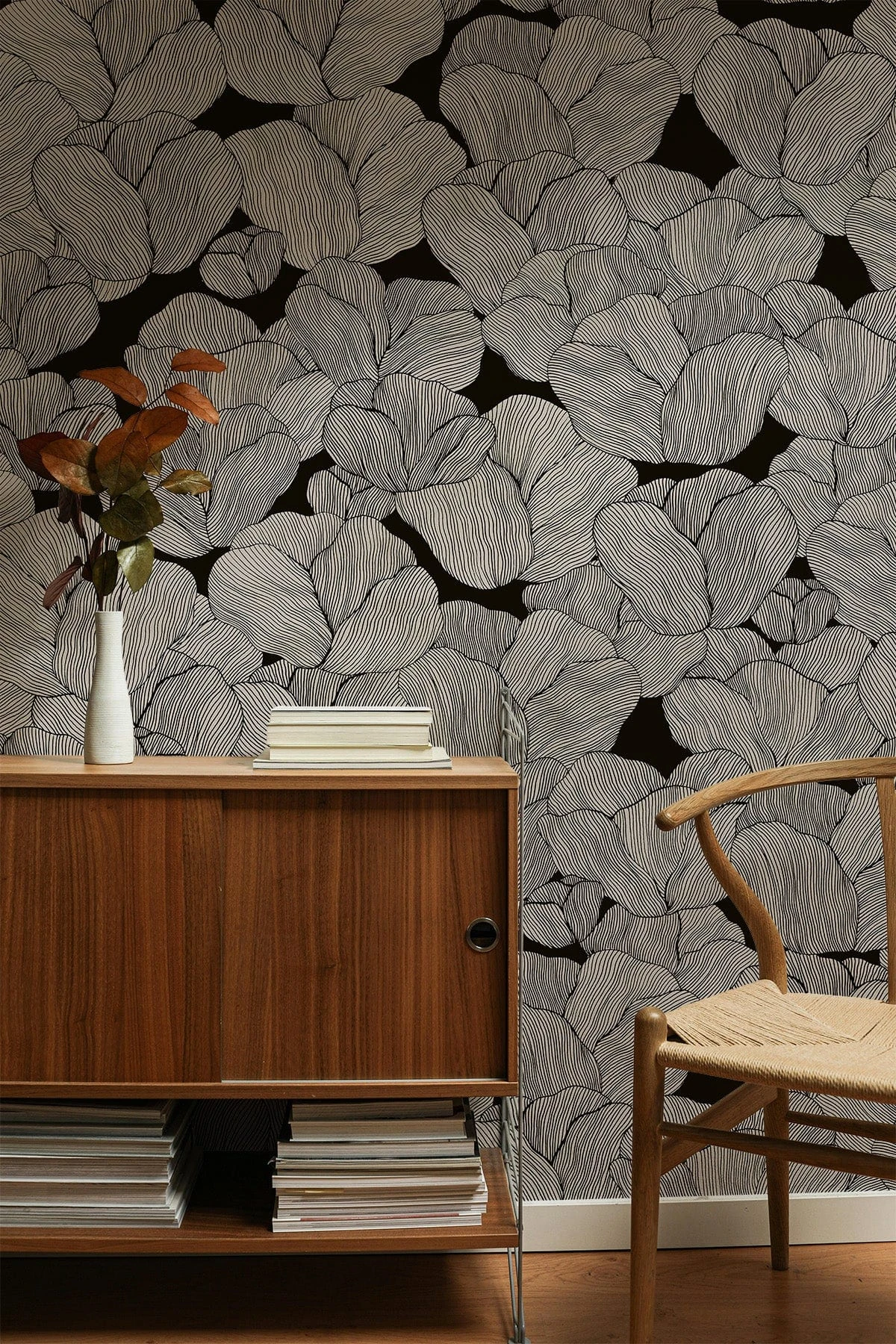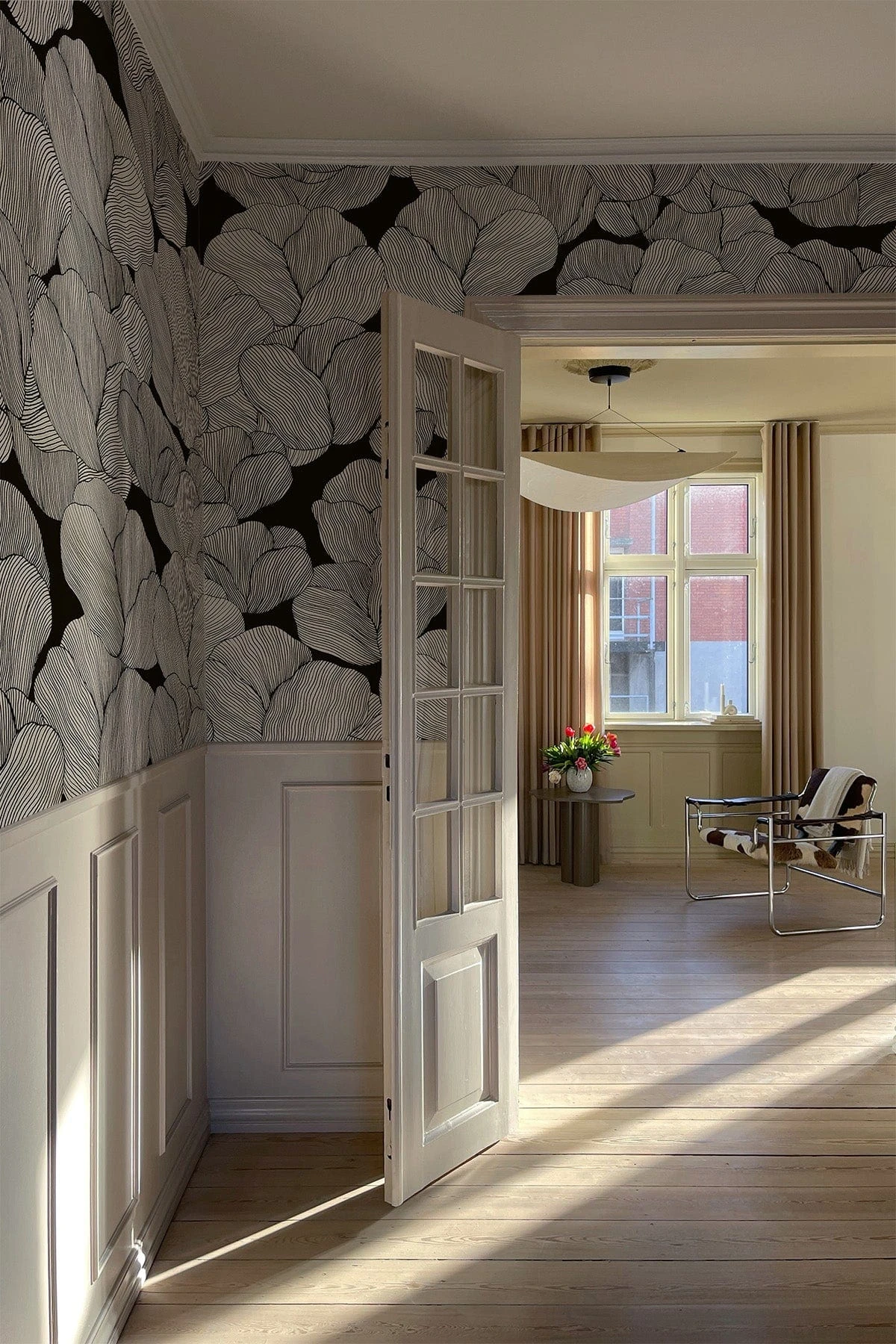 Elevate your living room with our Graphic Flora wall mural in white. This elegant design features intricate botanical motifs in a timeless white hue – against a black backdrop, adding a touch of sophistication to your room. Inspired by nature’s organic shapes, each element is carefully hand-drawn by our designers, with delicate brushstrokes that bring this wall mural to life.