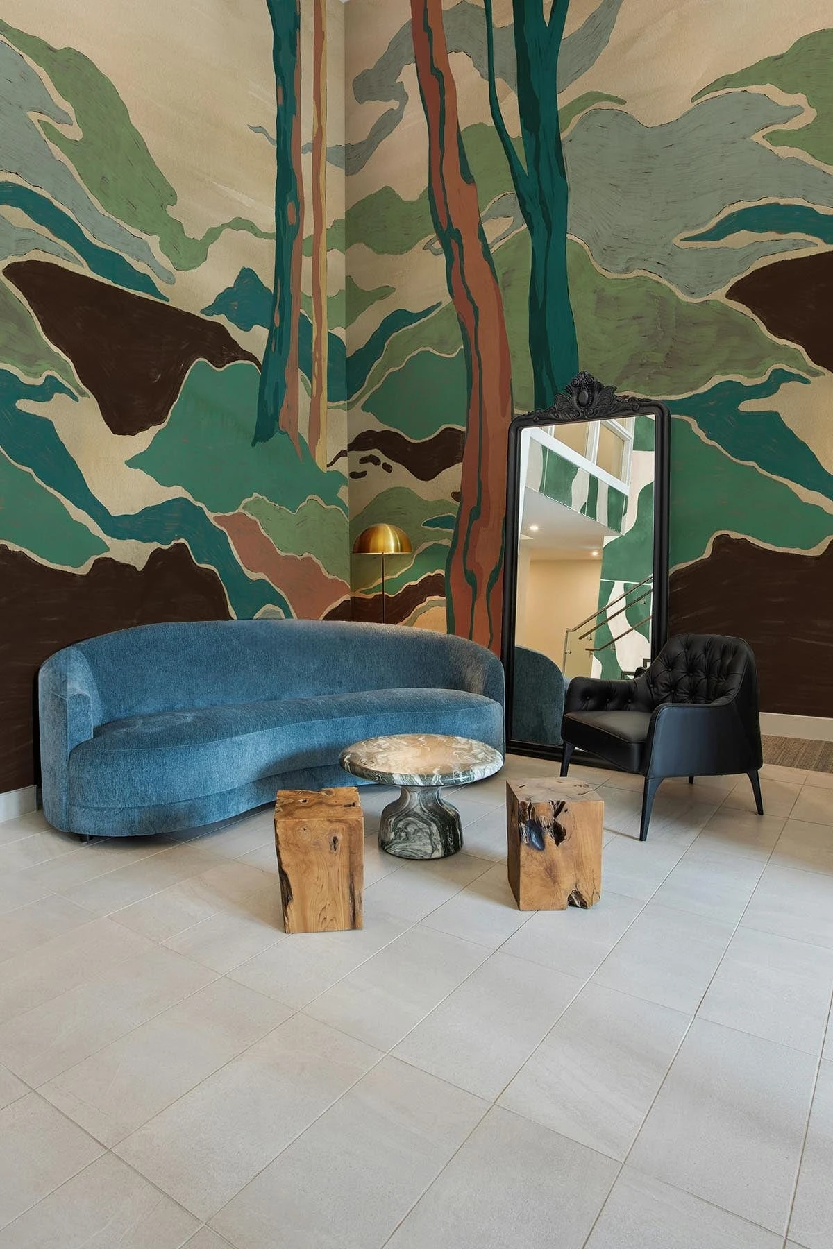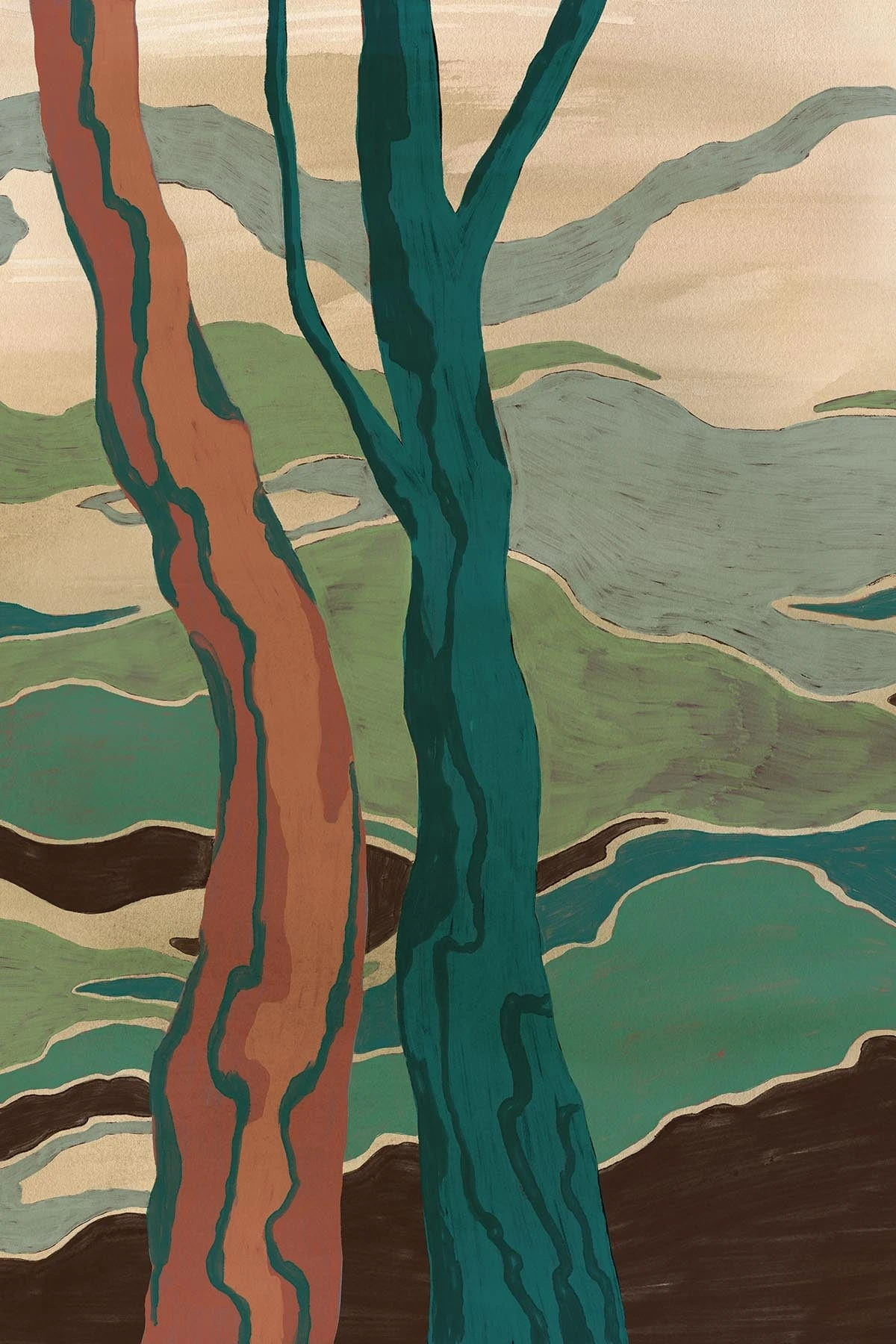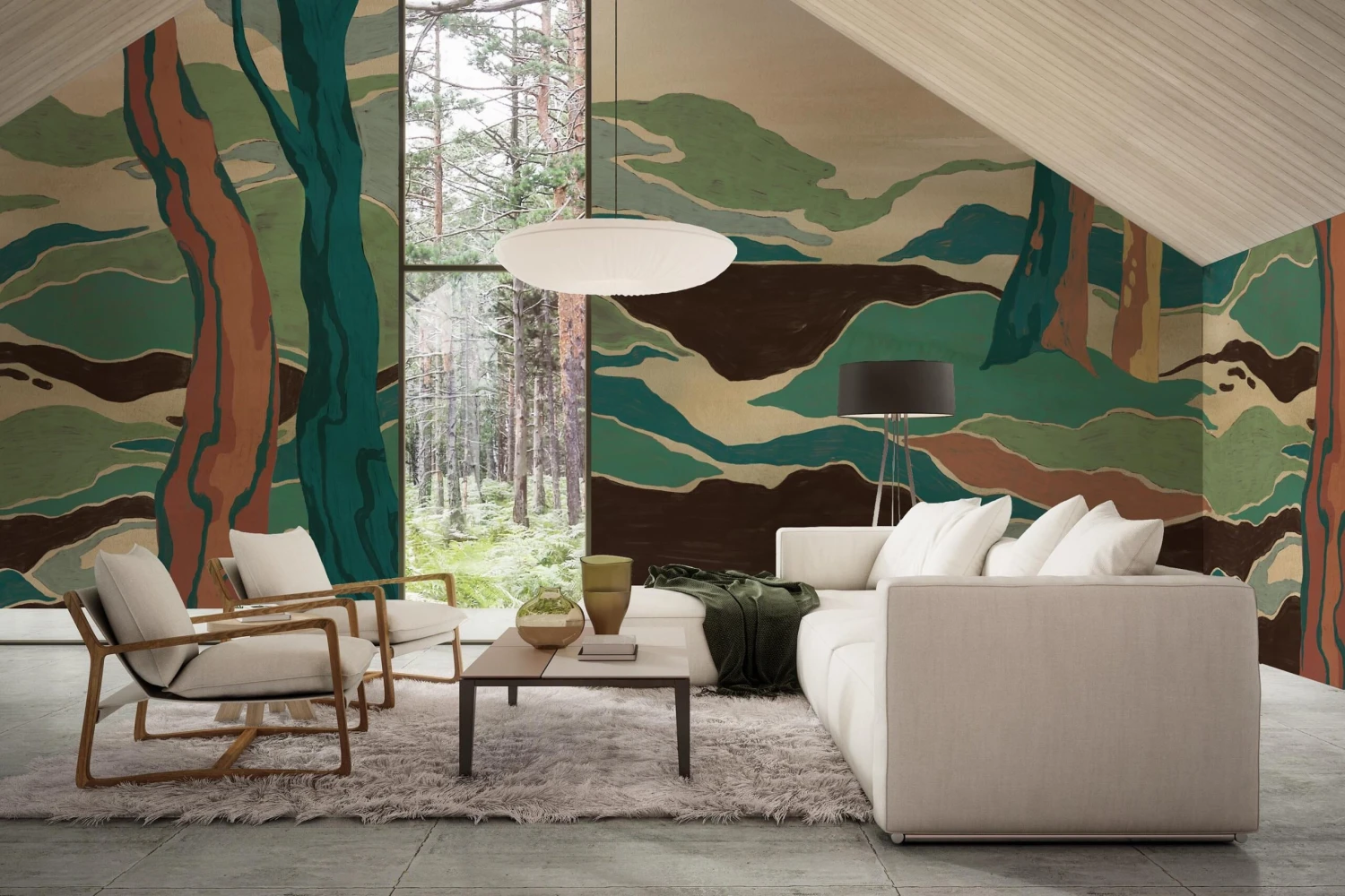 A wall mural that features an abstract perception of nature. The eye catching colors of green, brown and blue creates a fascinating vision, provoking textures and colors of the natural landscapes. The Graphic Landscape in Green Multi combines bold lines with rich earthy tones, flowing across the wall mural design. The wall mural is an artistic statement that brings a modern and dynamic feeling to any space, adding depth and personality to any room.