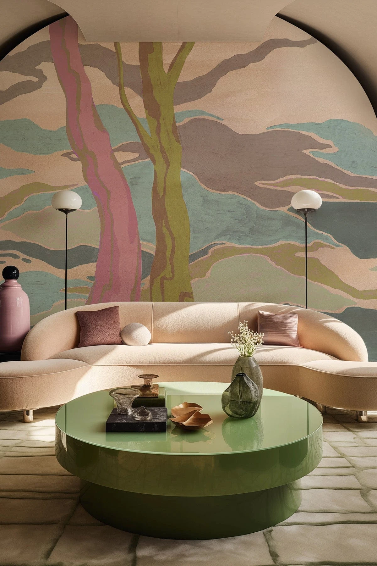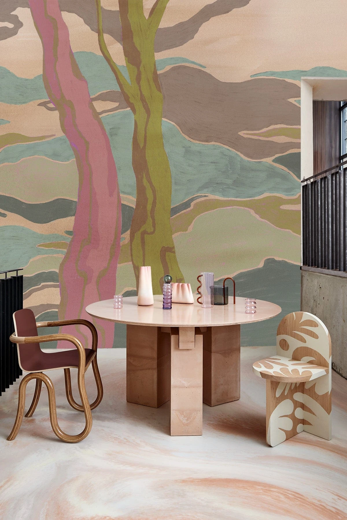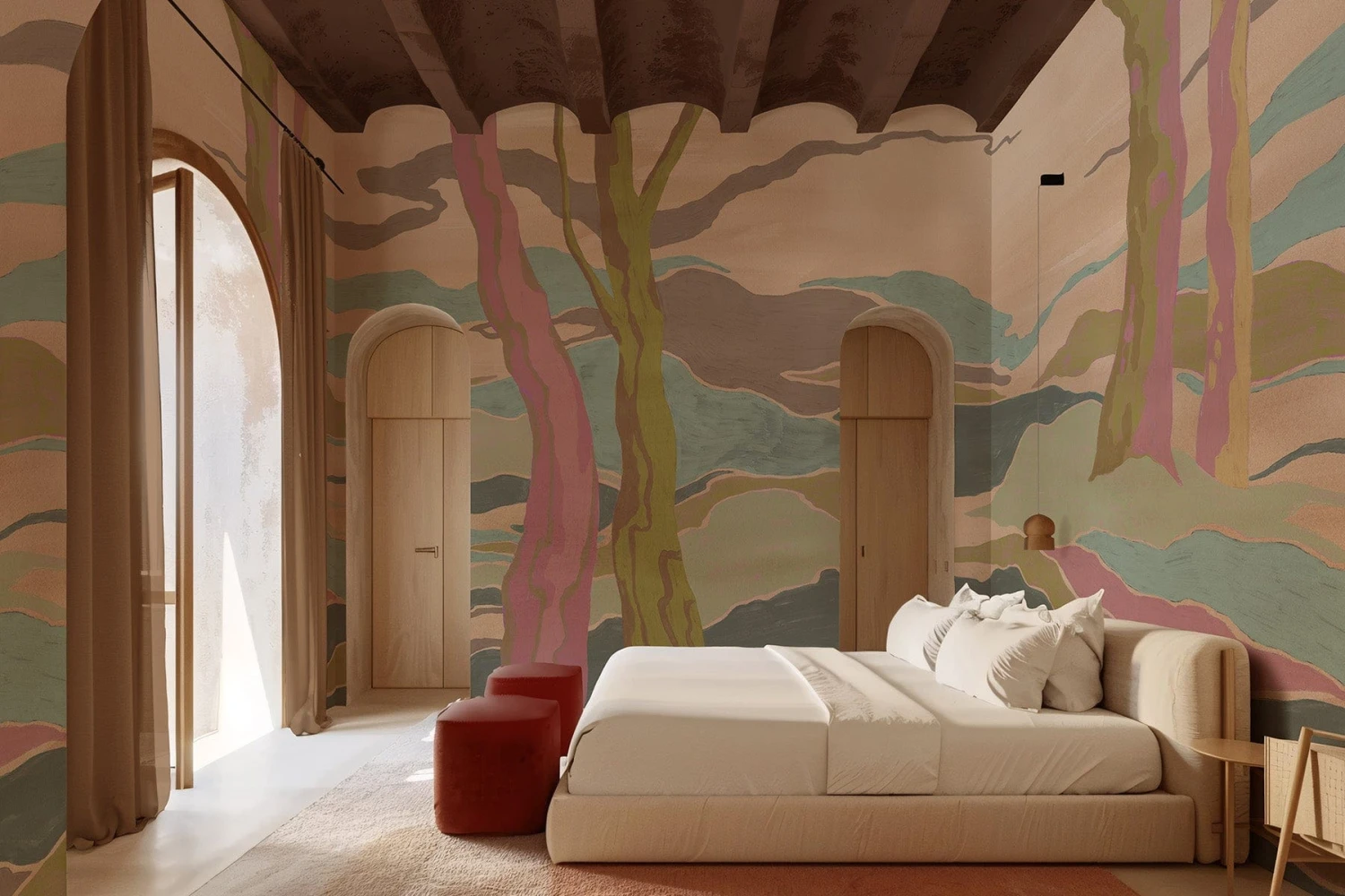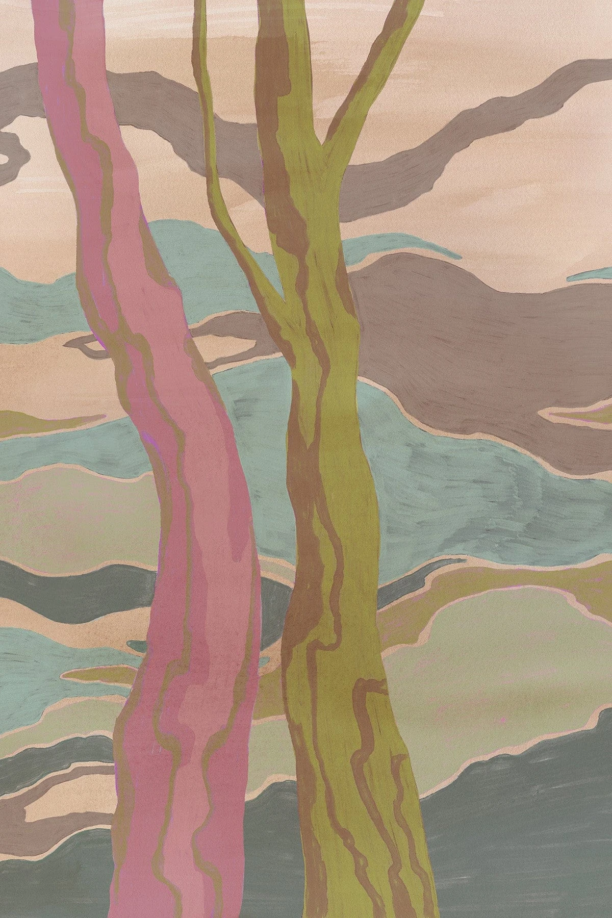 This mural blends soft pastels of pink, blue, and green with warm, rustic tones, creating a harmonious balance of energy and tranquility. Flowing hills and gentle hues evoke a playful yet ambient atmosphere, adding depth, personality, and modern elegance to any space. This landscape wall mural is perfect for a sophisticated yet calming retreat.